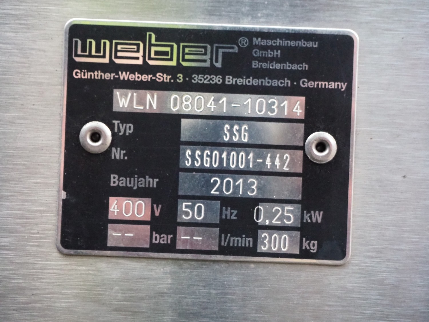 Weber knife sharpener, type: SSG, model: WLN 08041-10314, number: SSG01001-442. year of construction: 2013, 400 V, 50 Hz, 0.25 kW, weight: 300 kg, dimensions: 1100 mm x 800 mm x 2030 mm.