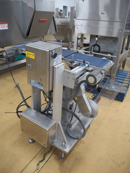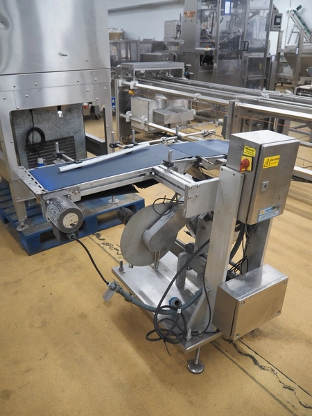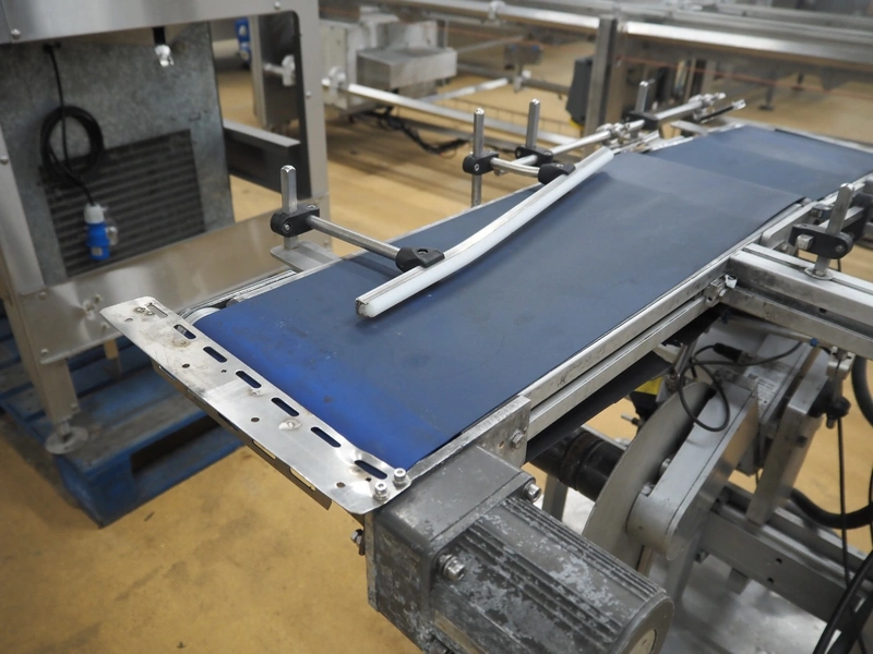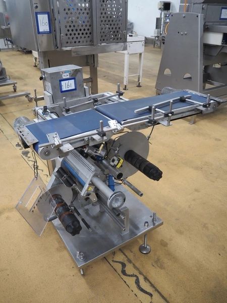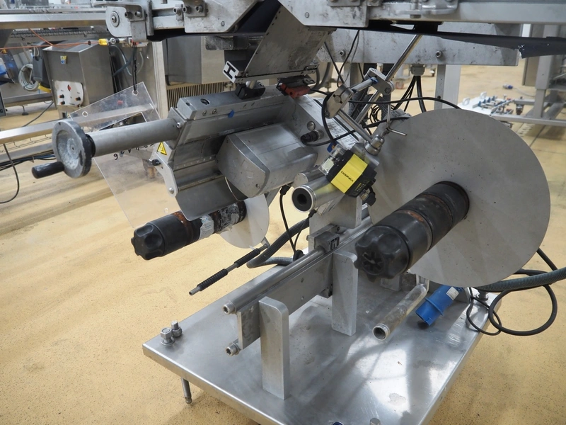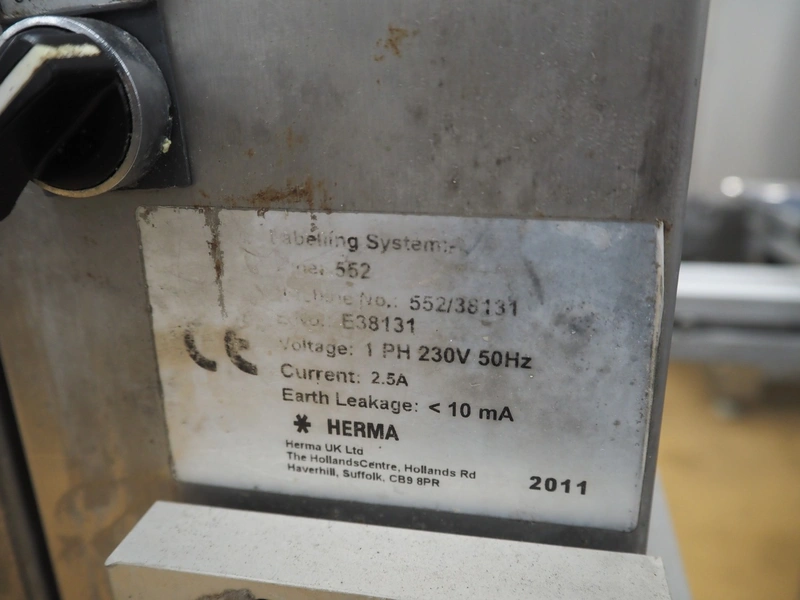 Herma transport belt with labeller, model: 552, machine number: 552/38131, year of construction: 2011, 230 V, 1 Ph, 50 Hz, 2.5 A, plastic belt, belt width: (2x) 230 mm, total dimensions: 1120 mm x 950 mm x 1040 mm.