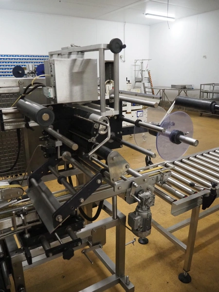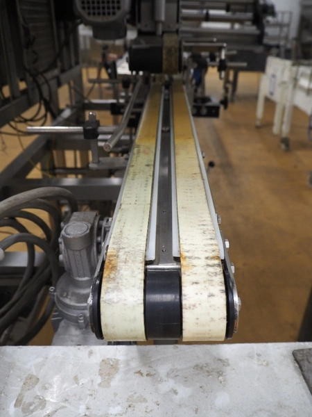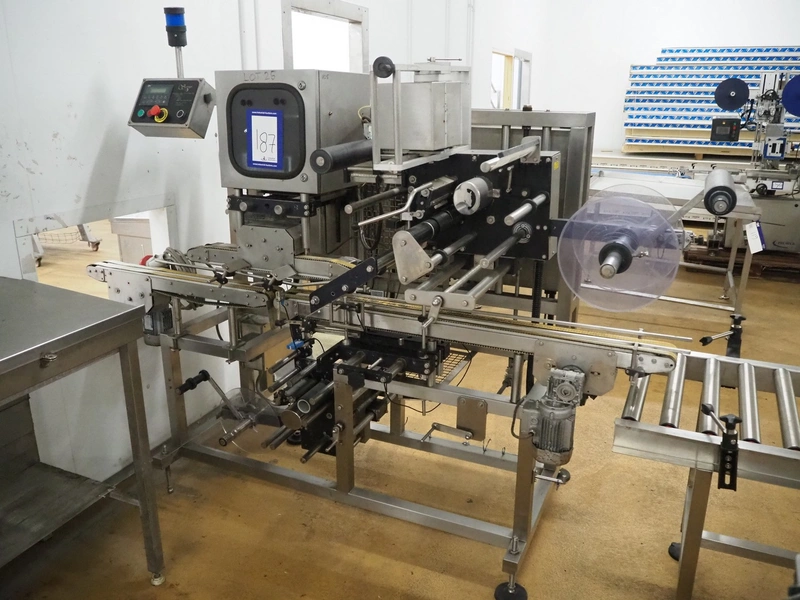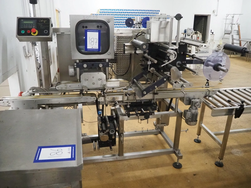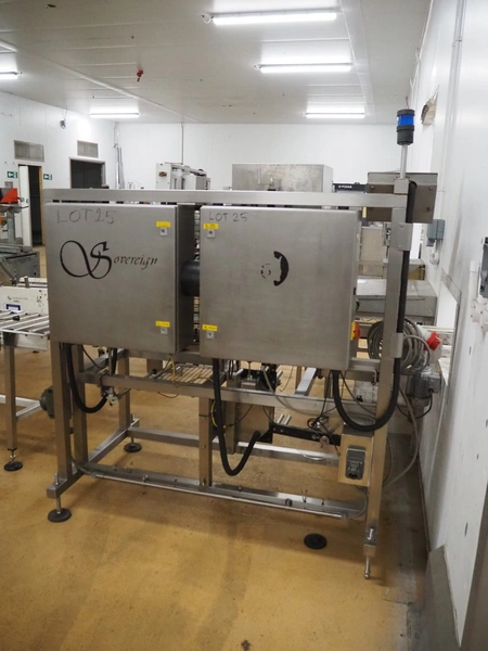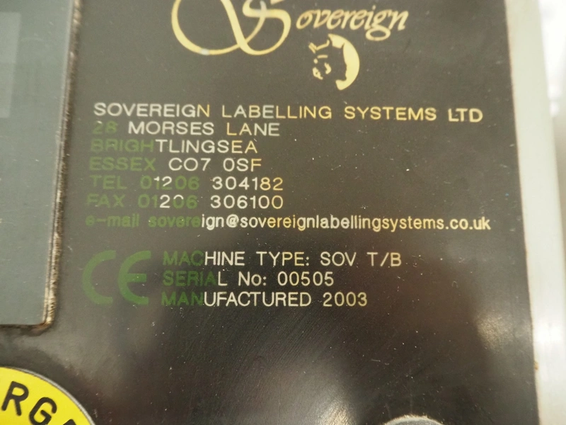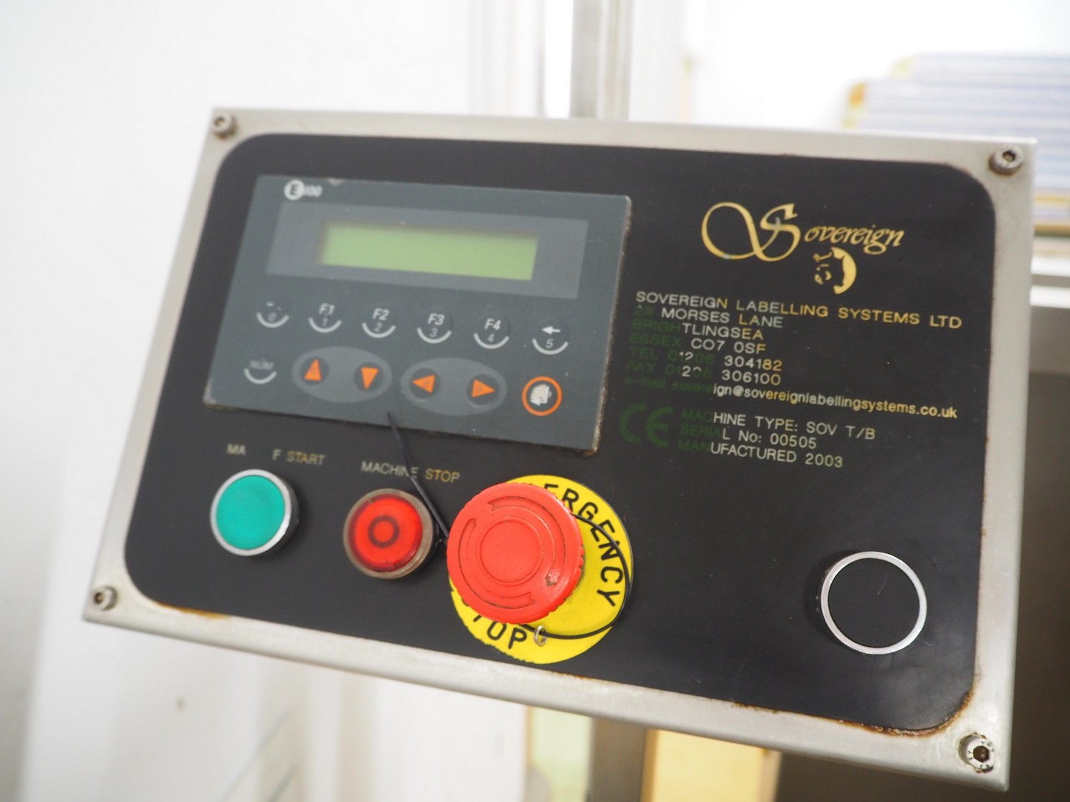 Sovereign Labelling Systems Ltd. labelling machine with top and bottom labeler, type: SOV T/B, serial number: 00505, year of construction: 2003, plastic belt, belt width: 90 mm, total dimensions: 2400 mm x 1100 mm x 1930 mm.