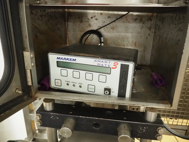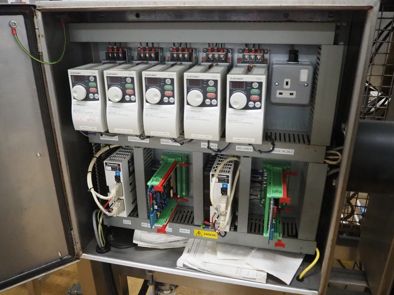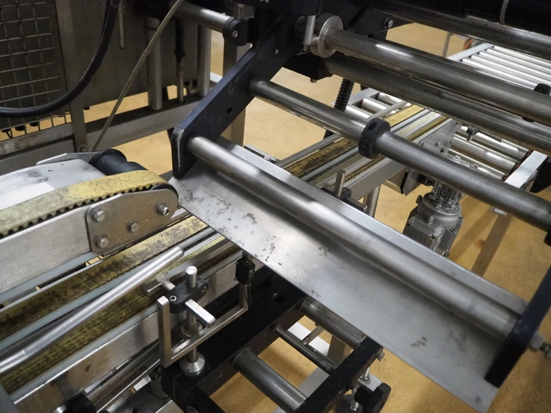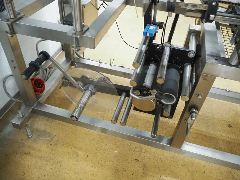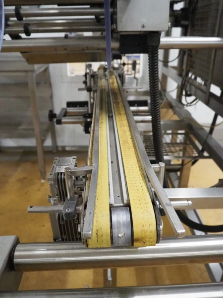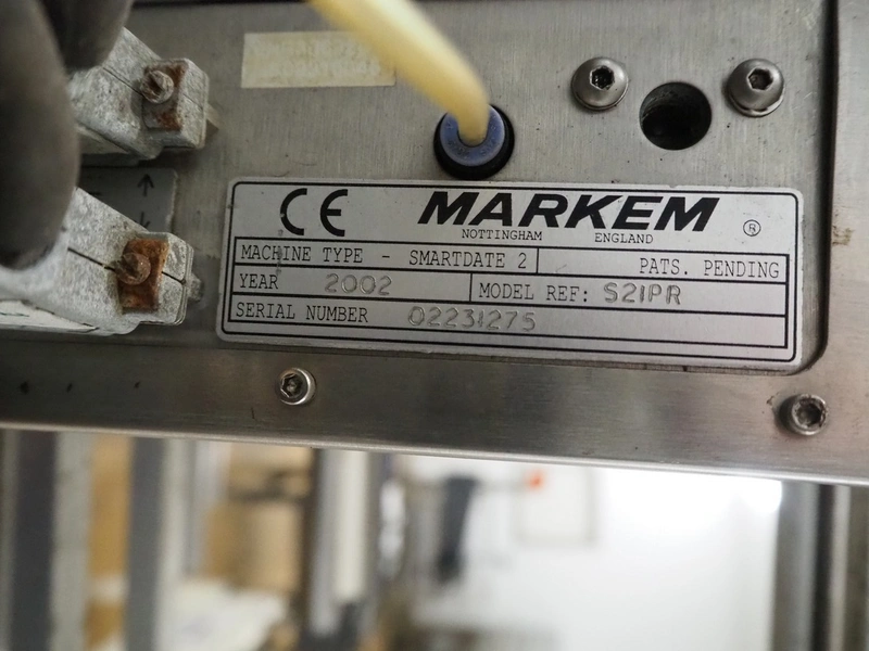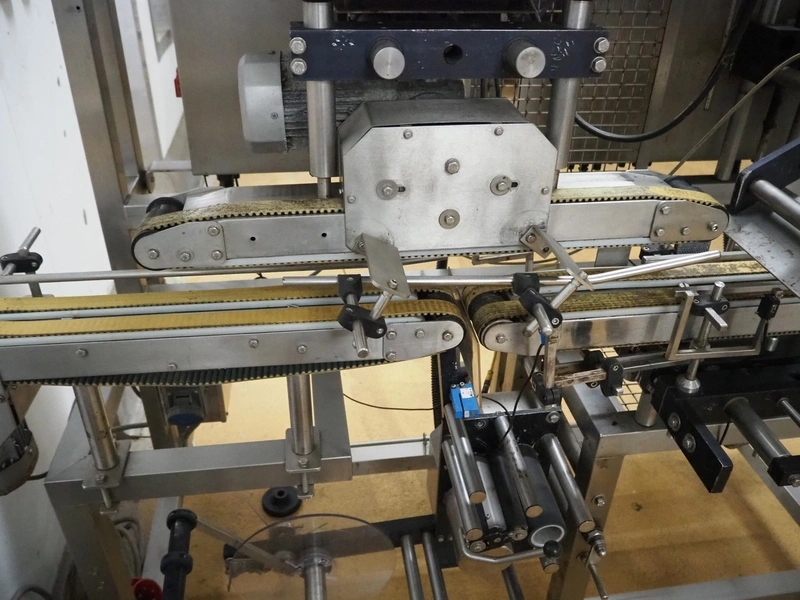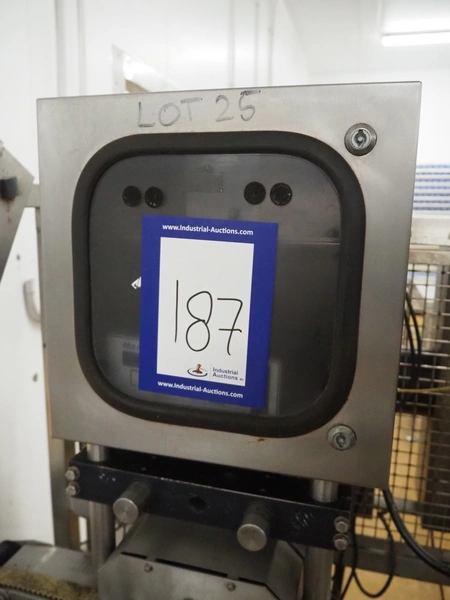 Sovereign Labelling Systems Ltd. labelling machine with top and bottom labeler, type: SOV T/B, serial number: 00505, year of construction: 2003, plastic belt, belt width: 90 mm, total dimensions: 2400 mm x 1100 mm x 1930 mm.