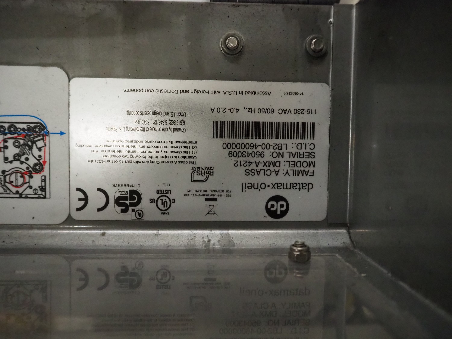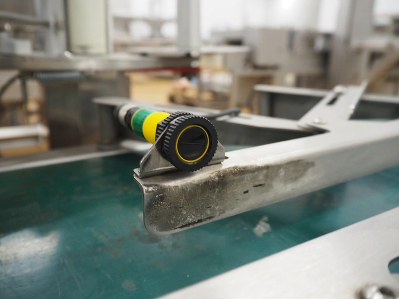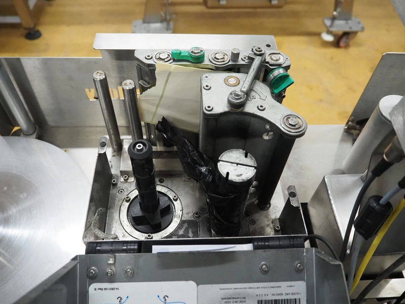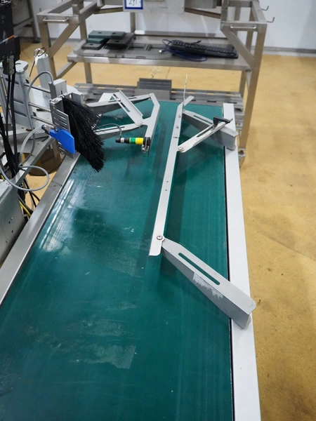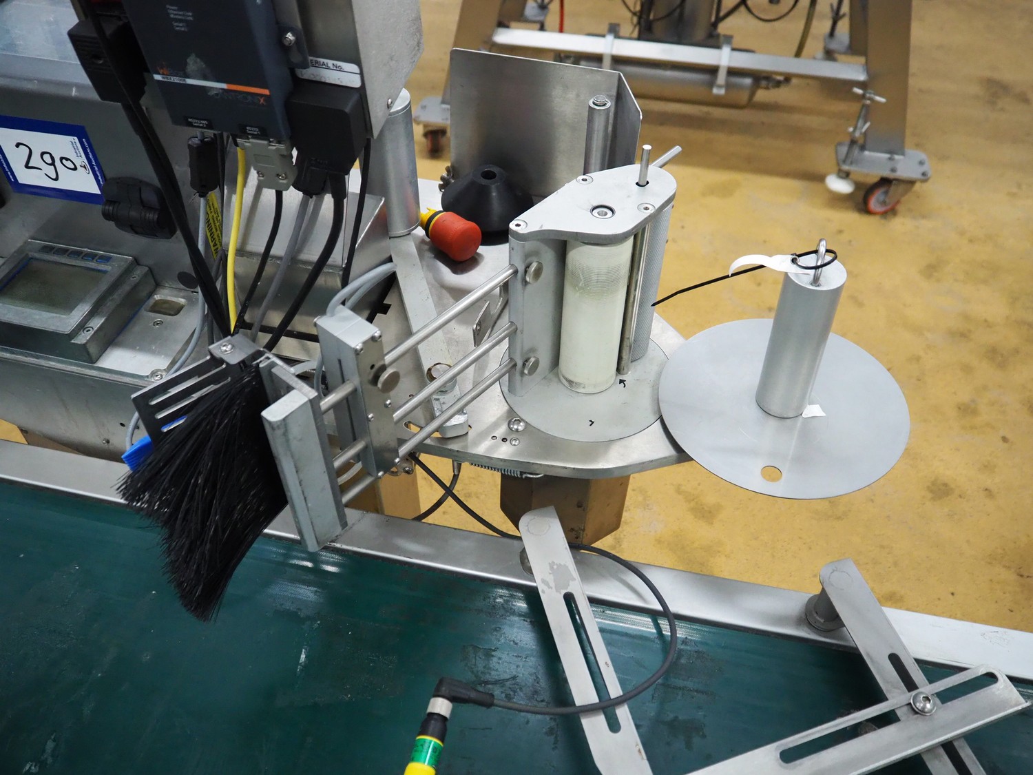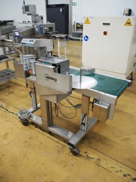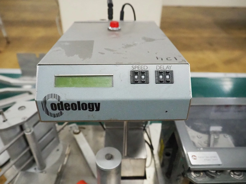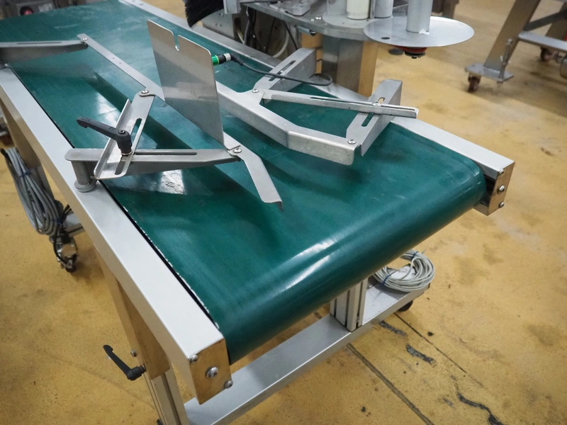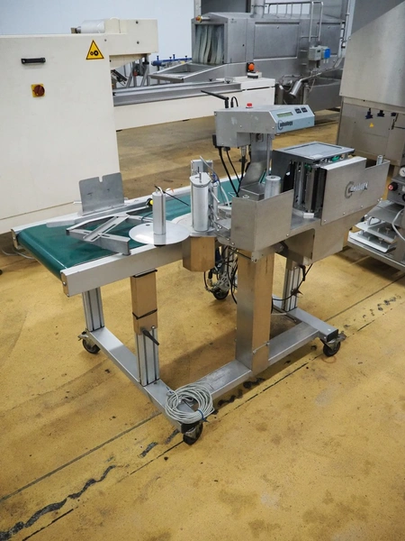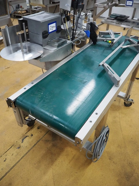 Odeology mobile labelling machine, plastic belt, belt width: 430 mm, total dimensions: 1500 mm x 900 mm x 1200 mm.