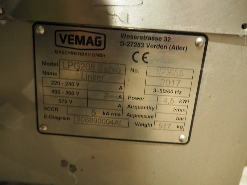 - Vemag mobile linker, model: LPG208 Servo, number: 2080655, year of construction: 2017, 400-460 V, 3 Ph, 50/60 Hz, 7 A, 4.5 kW, weight: 517 kg, dimensions: 1500 mm x 800 mm x 1260 mm. Incomplete.