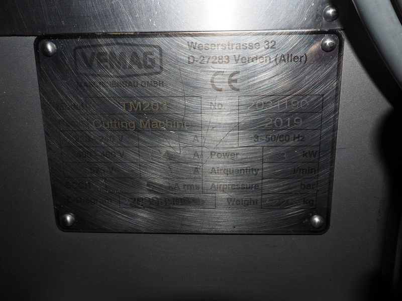- Vemag mobile cutting machine, model: TM203, serial number: 2031190, year of construction: 2019, 400-460 V, 3 Ph, 50/60 Hz, 4 A, 3 kW, weight: 225 kg, dimensions: 920 mm x 700 mm x 1600 mm. Incomplete.