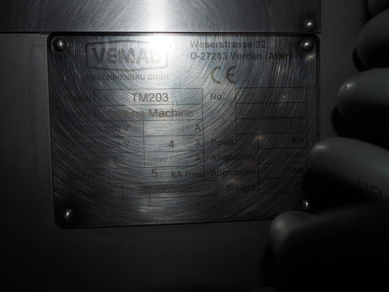- Vemag mobile cutting machine, model: TM203, serial number: 2031238, year of construction: 2020, 400-460 V, 3 Ph, 50/60 Hz, 4 A, 3 kW, weight: 225 kg, dimensions: 920 mm x 700 mm x 1600 mm. Incomplete.
