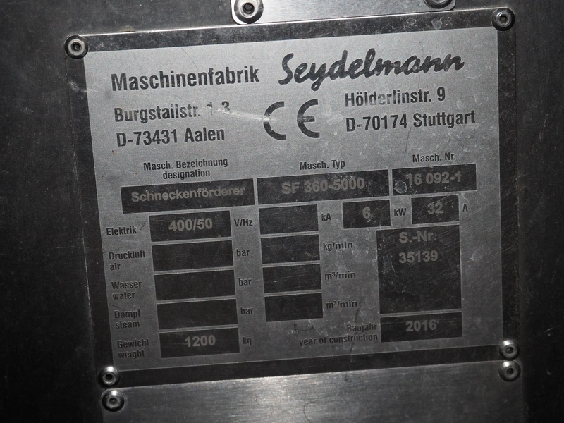 - Seydelmann elevating screw, type: SF 360-5000, diameter: 350 mm, tier: 250 mm, total dimensions: 5600 mm x 1100 mm x 1000 mm.