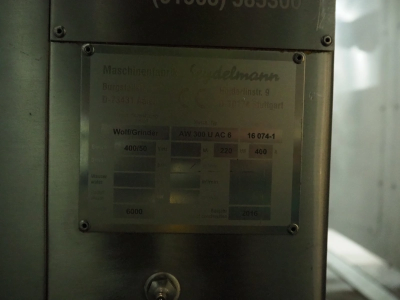 - Maschinenfabrik Seydelmann grinder, machine type: AW 300 U AC 6, machine number: 16 074-1, year of construction: 2016, 400 V, 50 Hz, 220 kW, 400 A, weight: 6000 kg, plate diameter: 300 mm, total dimensions: 2300 mm x 2900 mm x 2850 mm.