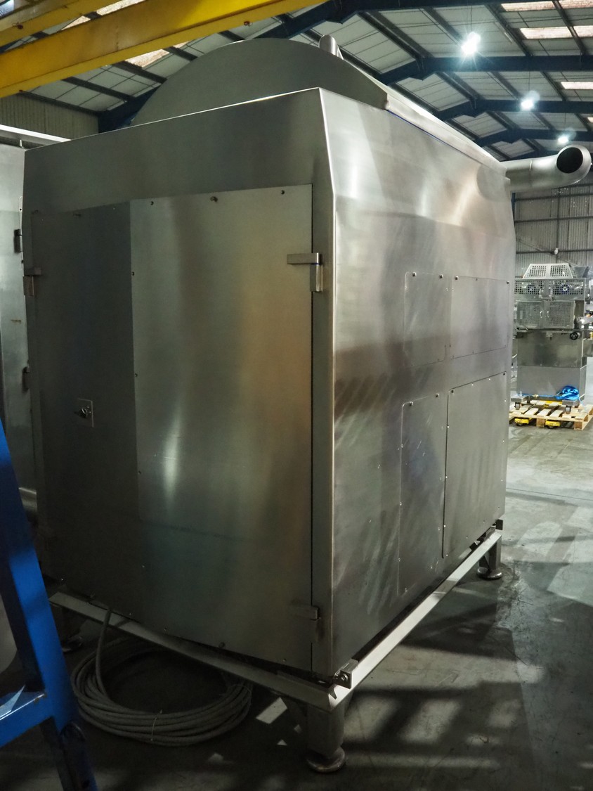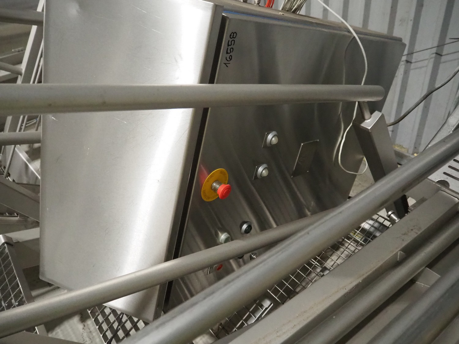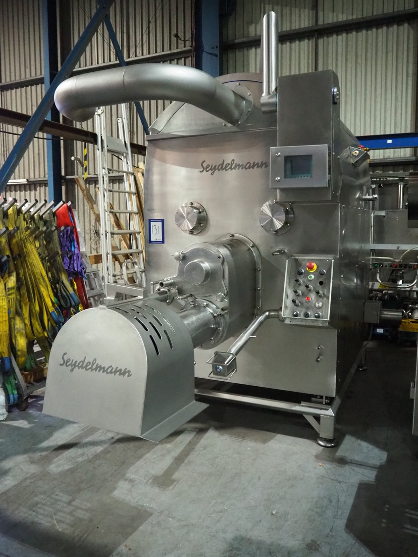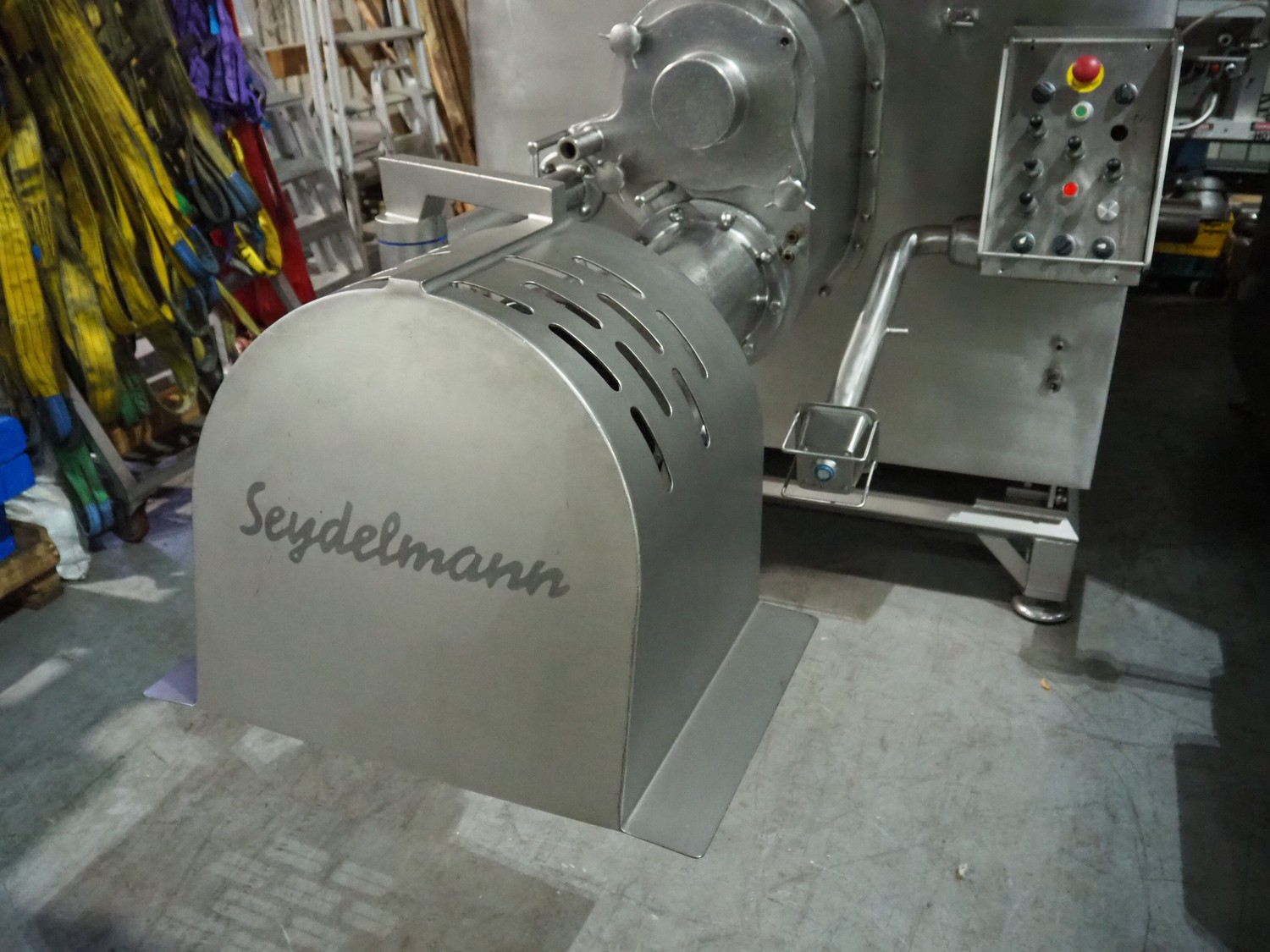 Maschinenfabrik Seydelmann double shaft paddle mixer-grinder, machine type: AMR1800/250, machine number: 16 051-1, year of construction: 2016, 400 V, 50 Hz, 101 kW, 190 A, air pressure: 6-10 bar, water pressure: 4-6 bar, weight: 6000 kg, plate diameter: 250 mm, total dimensions: 2000 mm x 4000 mm x 2950 mm. Including Seydelmann elevating screw, type: SF 360-5000, diameter: 350 mm, tier: 250 mm, total dimensions: 5600 mm x 1100 mm x 1000 mm and s/s stairs, dimensions: 3700 mm x 750 mm x 1800 mm.