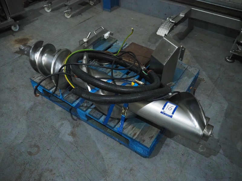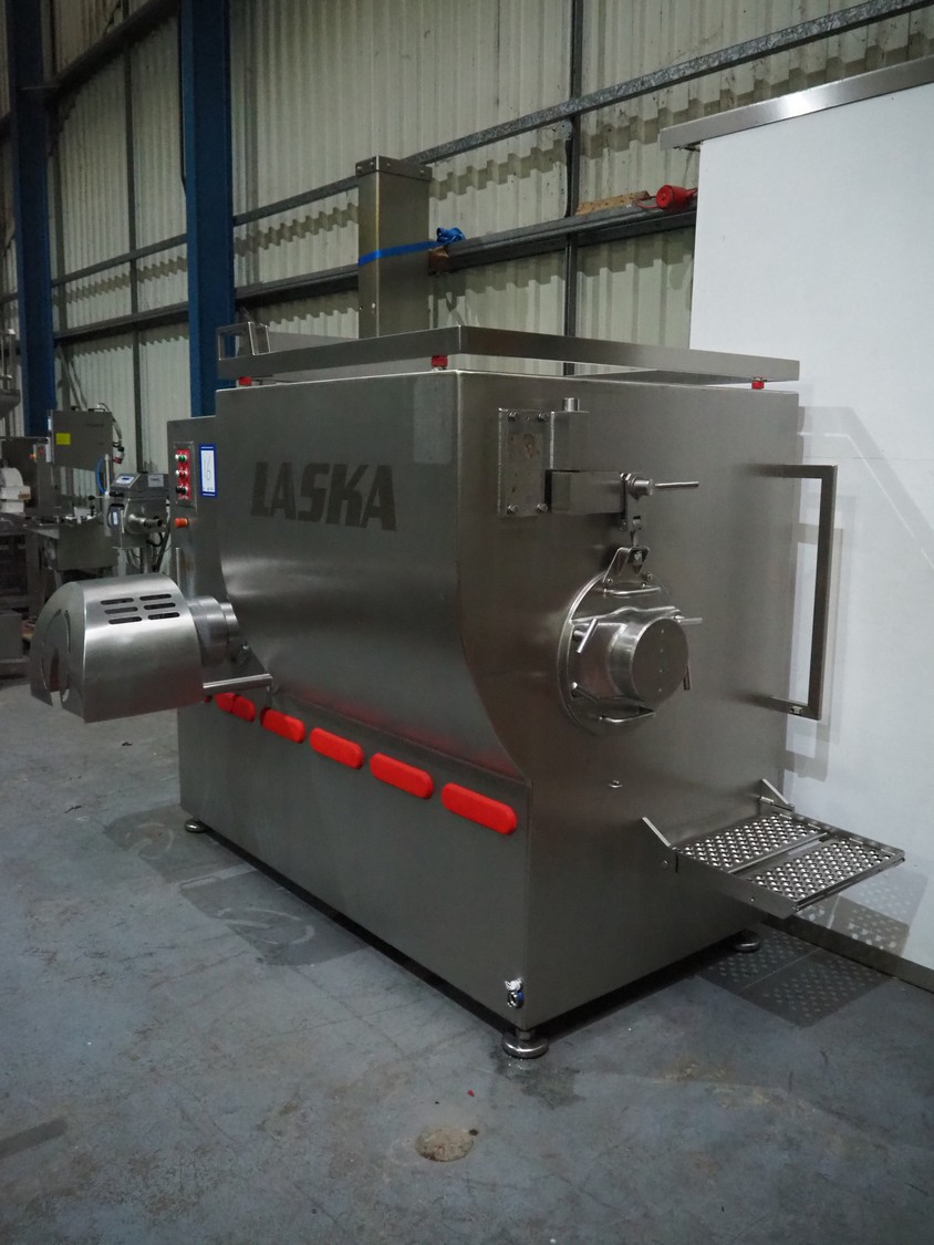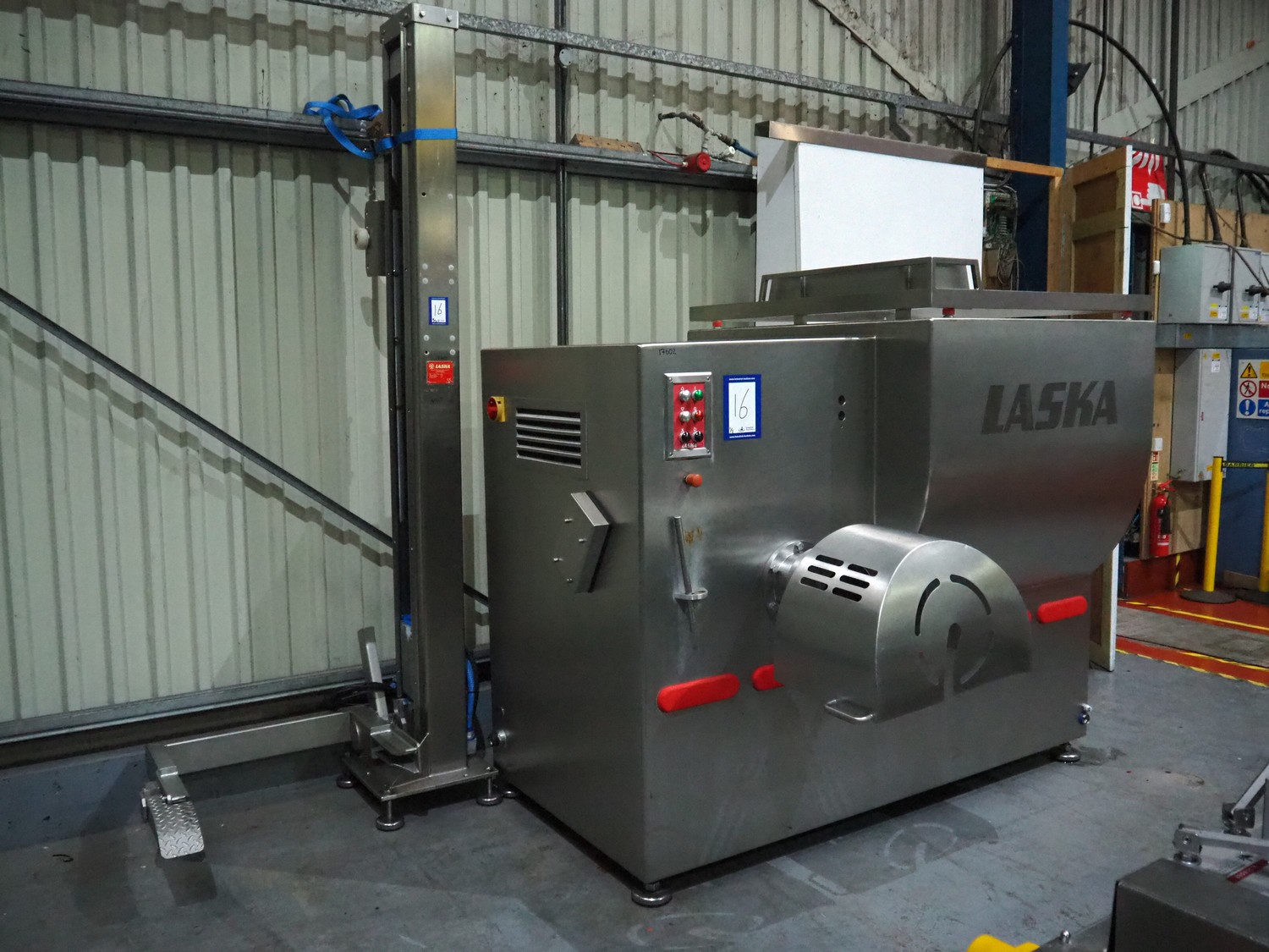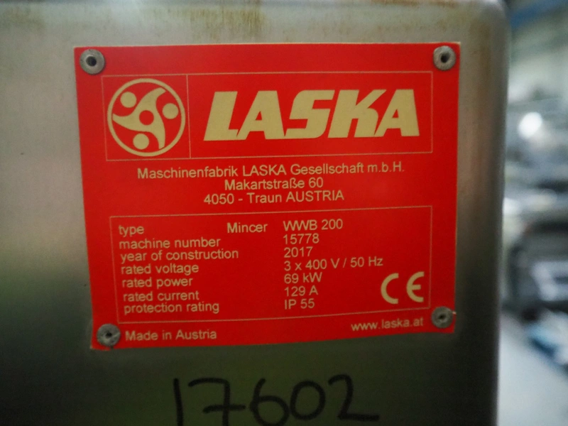 Laska frozen block grinder with lifter for 200 liter meat bins, type: Mincer WWB 200, machine number: 15778, year of construction: 2017, 400 V, 3 Ph, 50 Hz, 129 A, 69 kW, plate diameter: 200 mm, total dimensions: 2500 mm x 1800 mm x 1960 mm. Incomplete, missing one of the screws and plates.