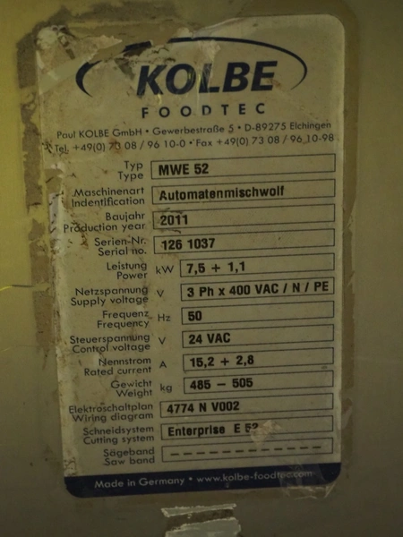 Kolbe mobile mixer-grinder, type: MWE 52, serial number: 126 1037, year of construction: 2011, 400 V, 3 Ph, 50 Hz, 15.2+2.8 A, 7.5+1.1 kW, weight: 485-505 kg, plate diameter: 130 mm, total dimensions: 1400 mm x 750 mm x 1320 mm.