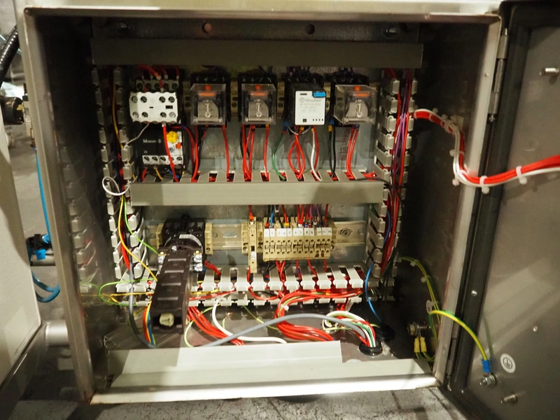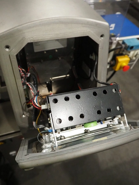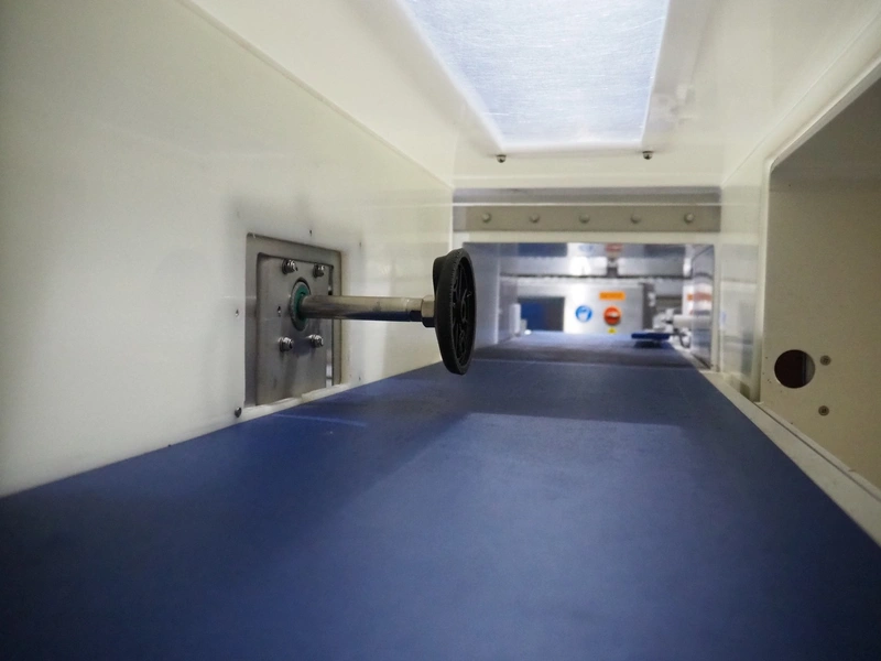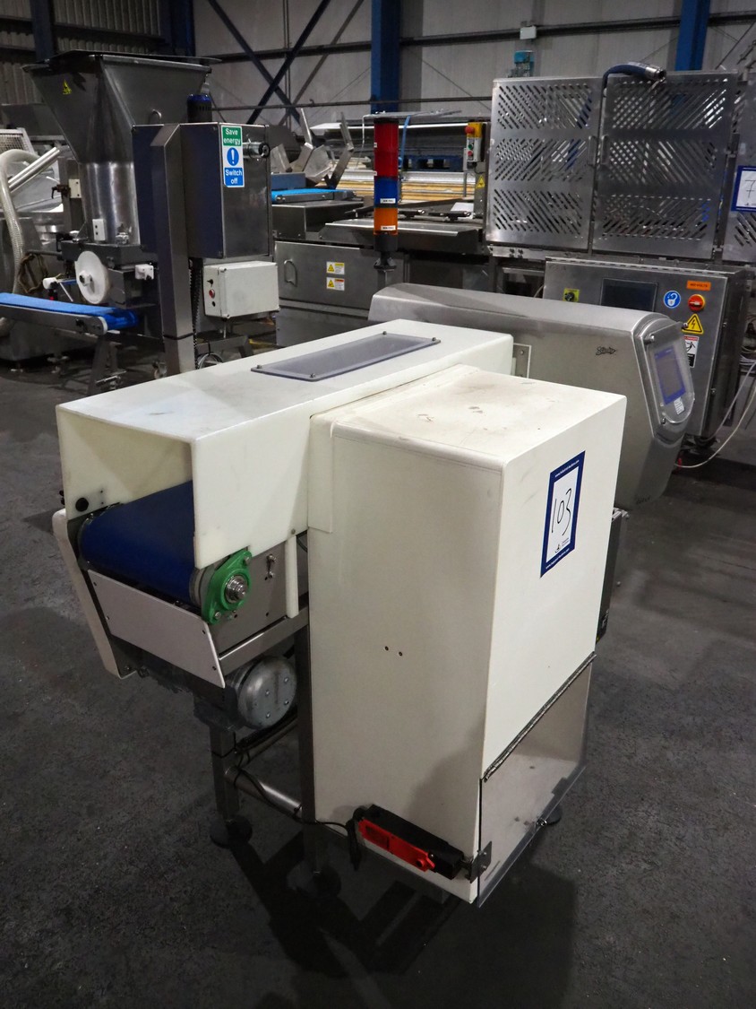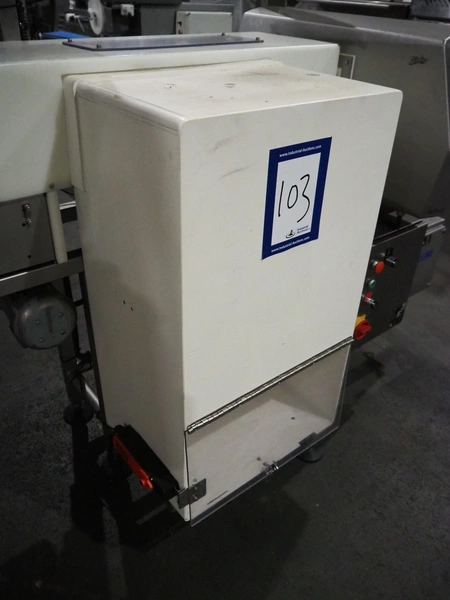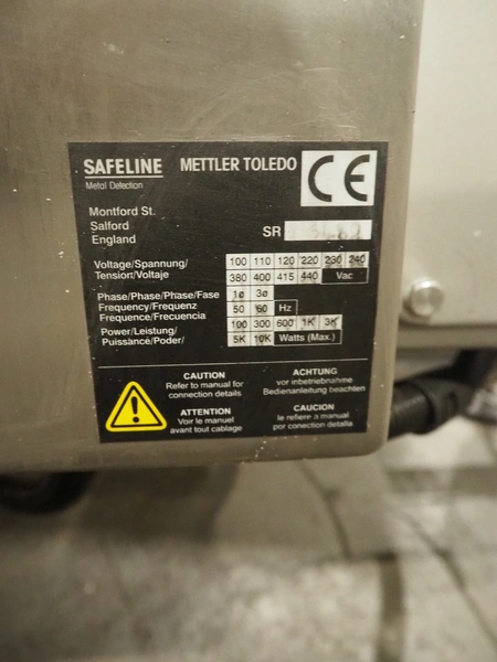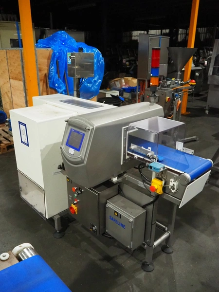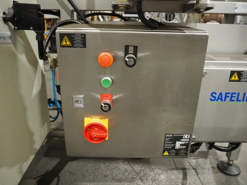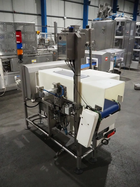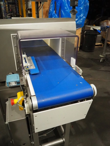 Safeline metal detector with rejector, plastic belt, belt width: 270 mm, clearance: 300 mm x 140 mm, total dimensions: 1850 mm x 1000 mm x 1600 mm.