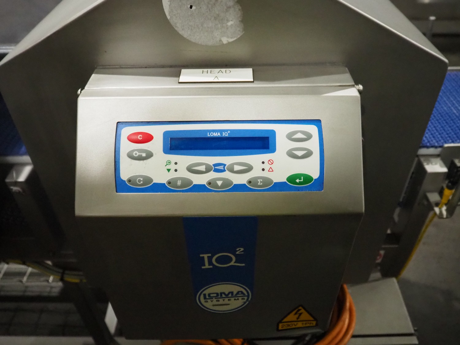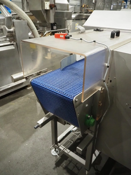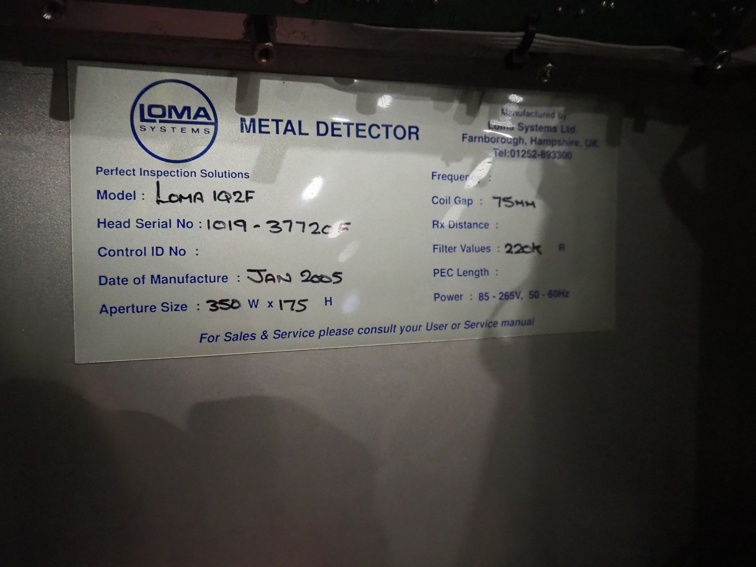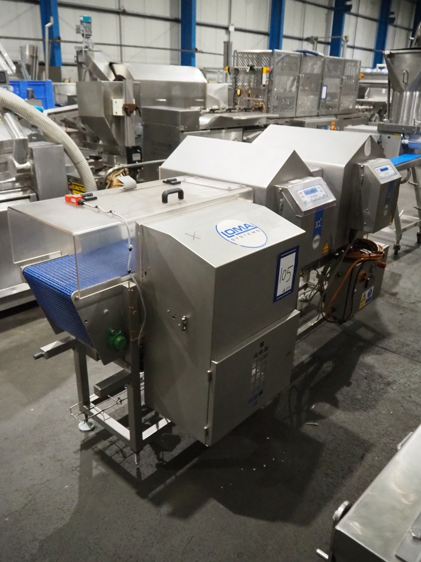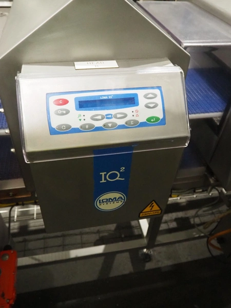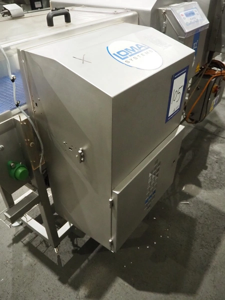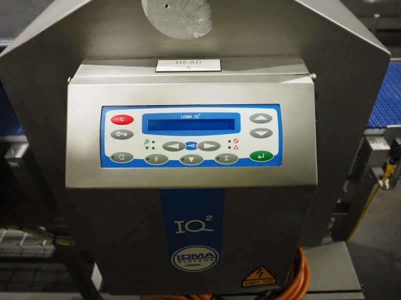 Loma Systems twin head metal detector with rejector, model: IQ2F and IQ2, serial number: 1019-377205 and MH04EU-00201D, 85-265 V, 50-60 Hz, plastic mesh belt, belt width: 300 mm, clearance: 350 mm x 110 mm, total dimensions: 2410 mm x 1050 mm x 1270 mm.