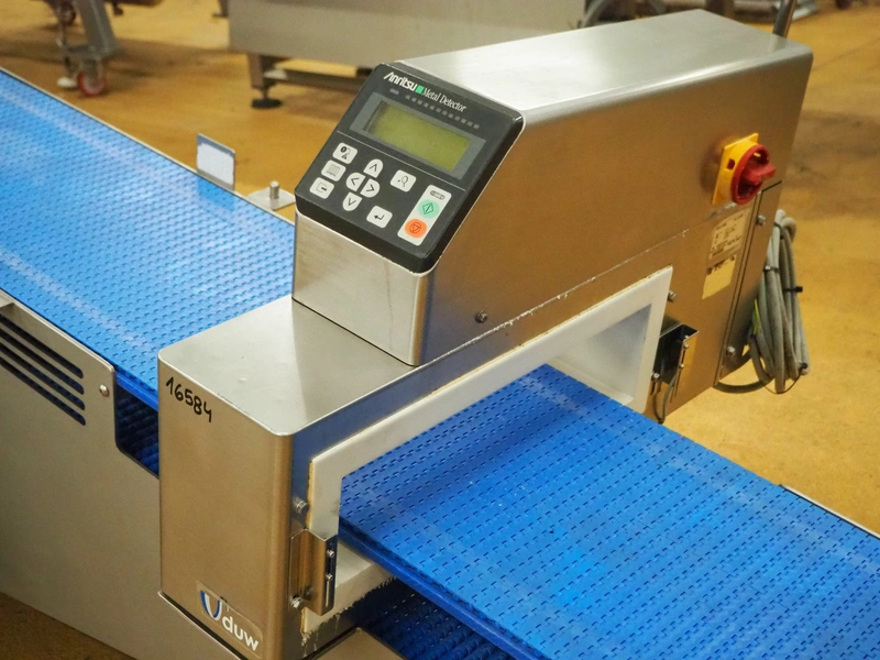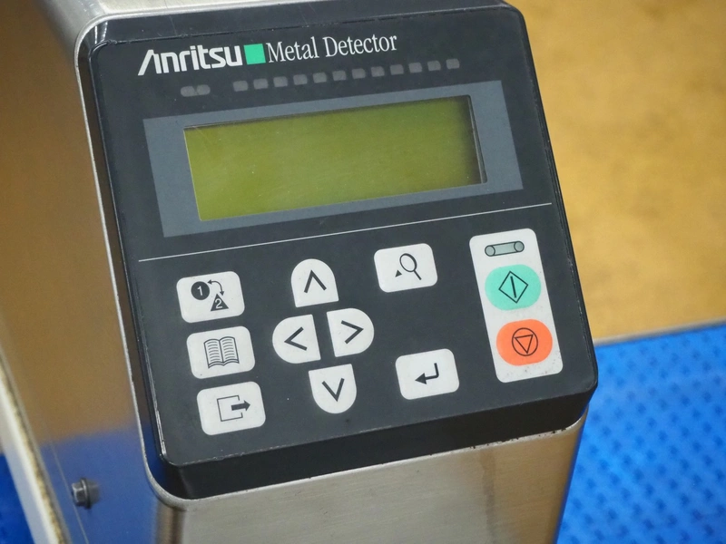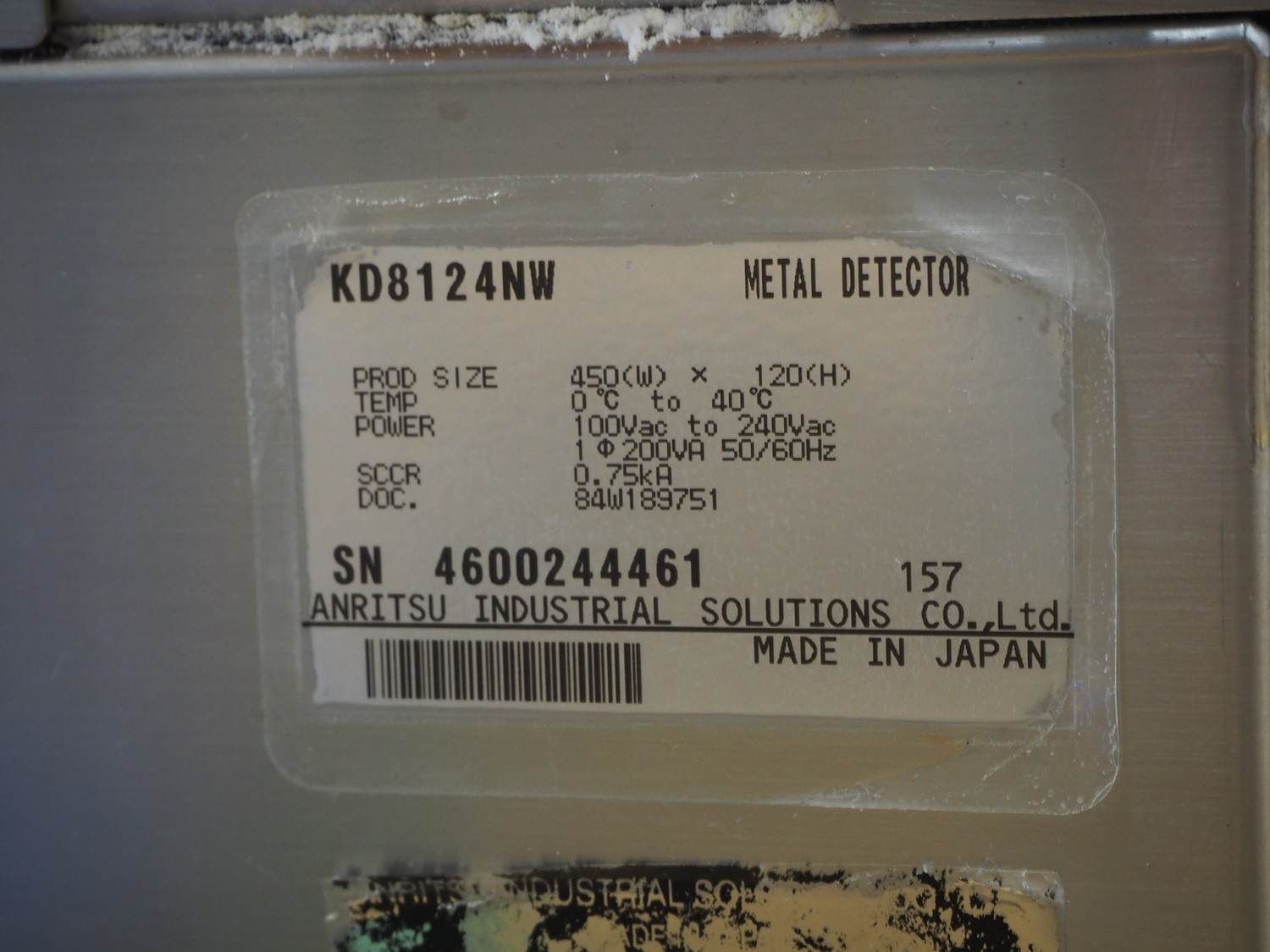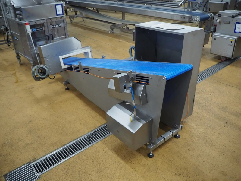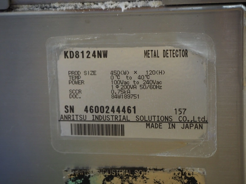 Anritsu elevating metal detector with rejector, type: KD8124NW, serial number: 4600244461, 100-240 Vac, 1 Ph, 50/60 Hz, clearance: 450 mm x 100 mm, plastic belt, belt width: 350 mm, elevating height: 880 mm, total dimensions: 2500 mm x 1100 mm x 1120 mm.