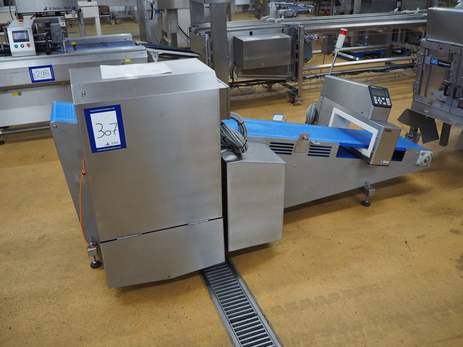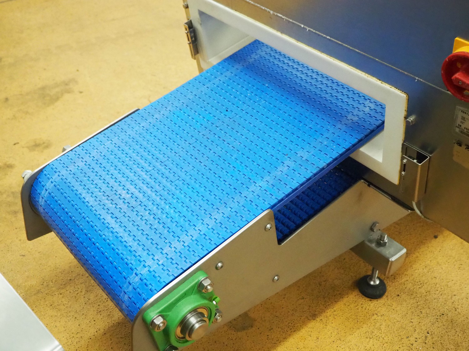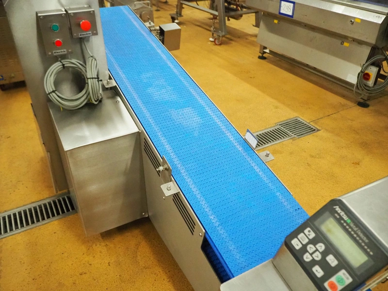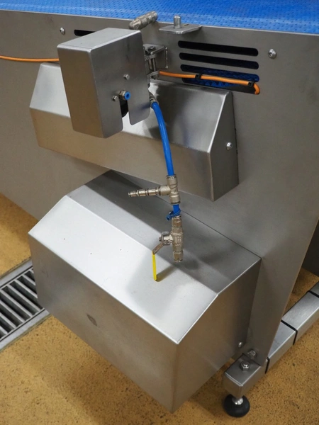 Anritsu elevating metal detector with rejector, type: KD8124NW, serial number: 4600244461, 100-240 Vac, 1 Ph, 50/60 Hz, clearance: 450 mm x 100 mm, plastic belt, belt width: 350 mm, elevating height: 880 mm, total dimensions: 2500 mm x 1100 mm x 1120 mm.