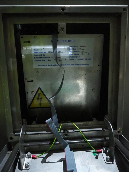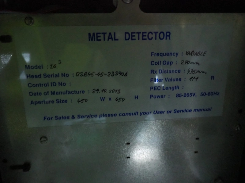 Loma Systems metal detector, model: IQ³, serial number: Q3B45-45-233906, year of construction: 29.10.2013, 85-265 V, 50-60 Hz, plastic belt, belt width: 400 mm, clearance: 450 mm x 420 mm, total dimensions: 2450 mm x 1150 mm x 1530 mm.