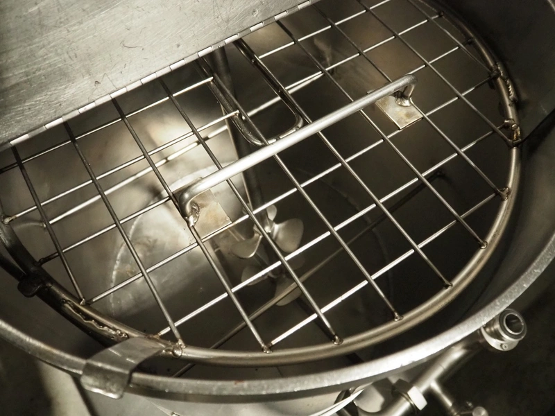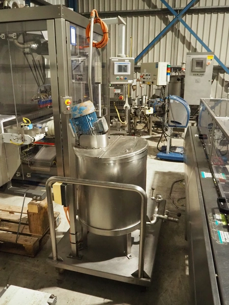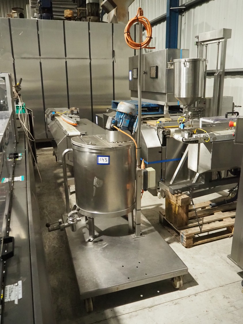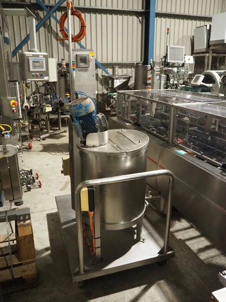 Mobile s/s mixing tub, inside dimensions: Ø 550 mm x 500 mm, total dimensions: 1200 mm x 940 mm x 2000 mm.