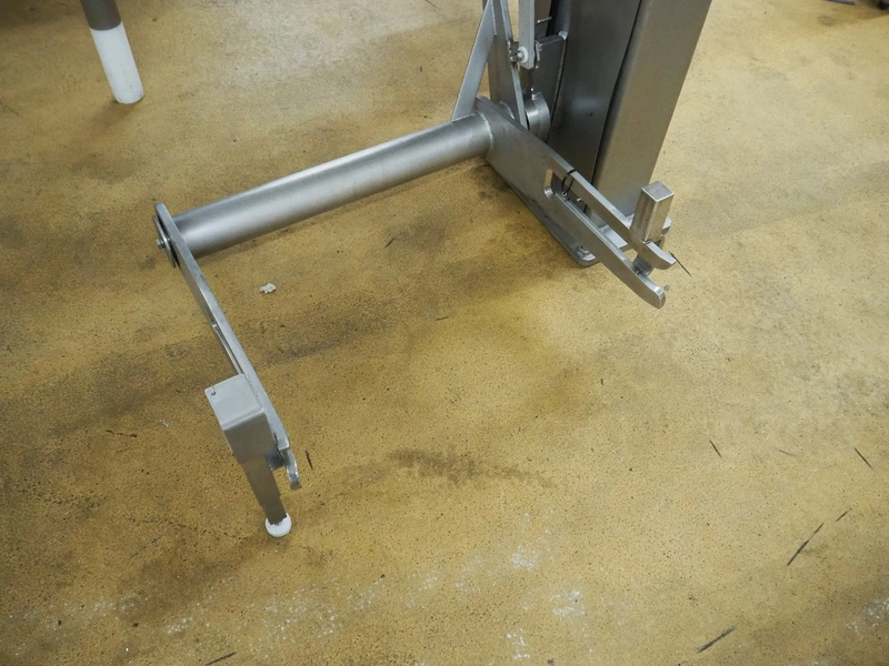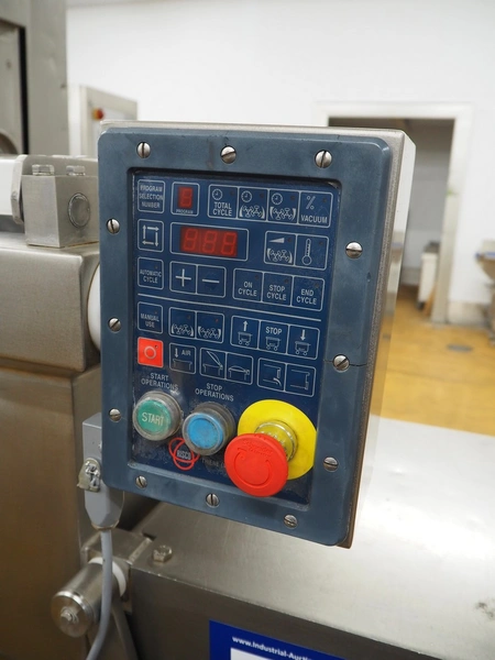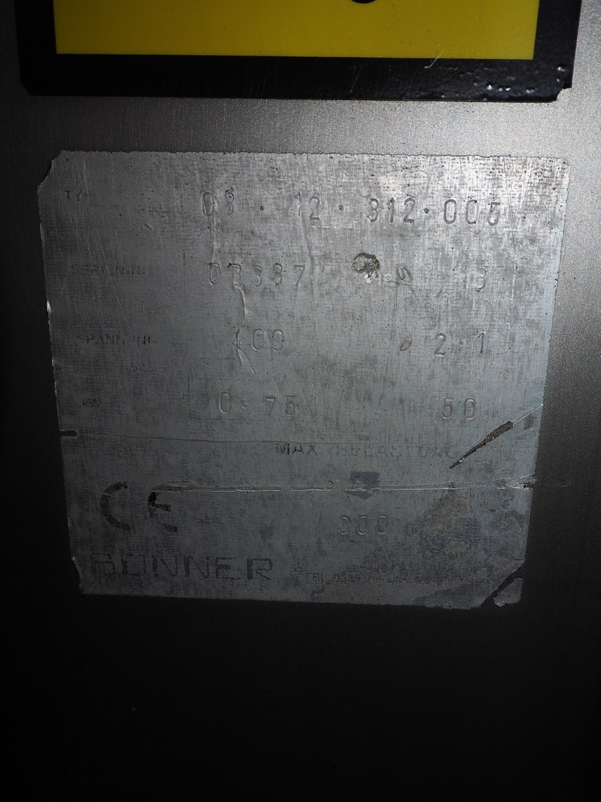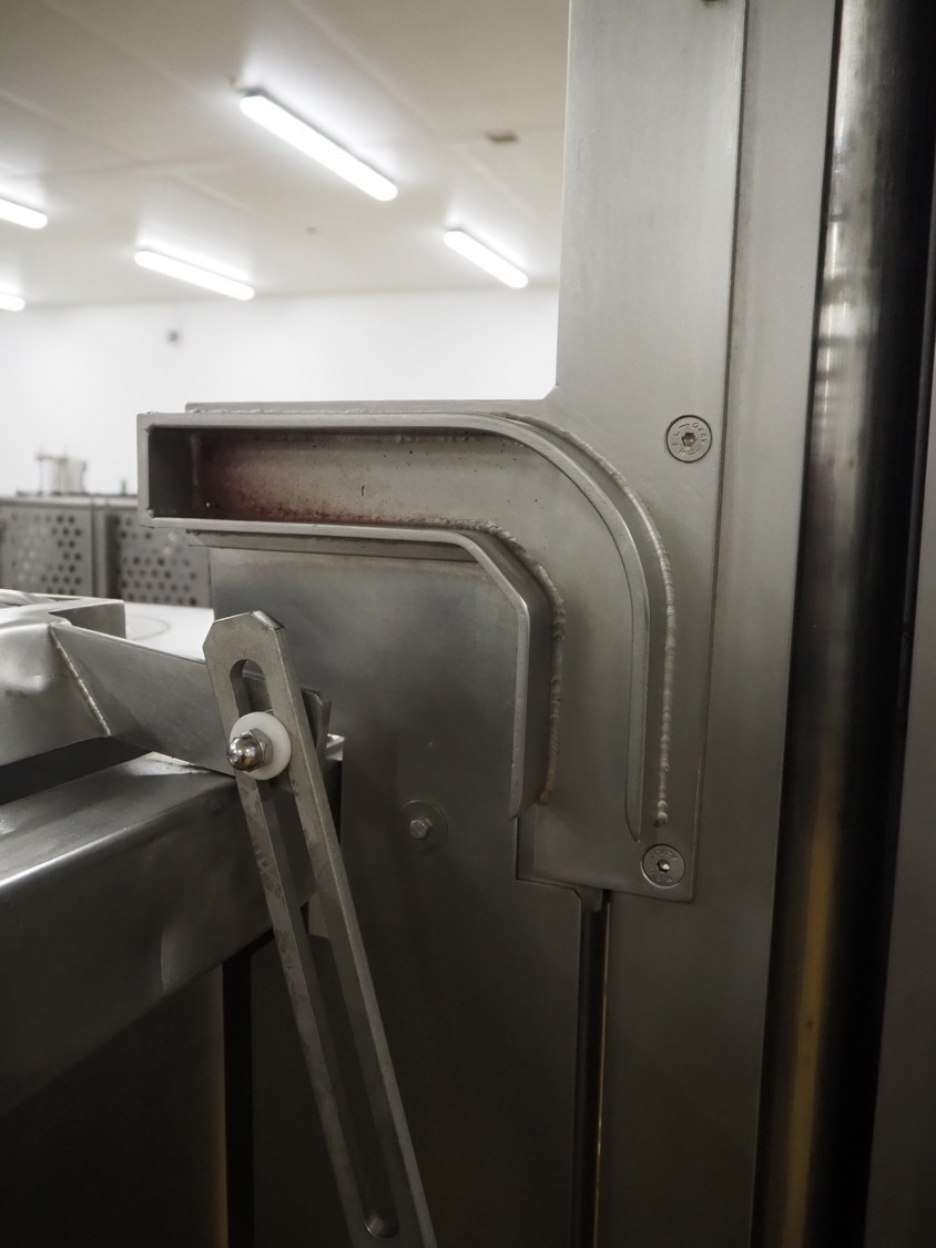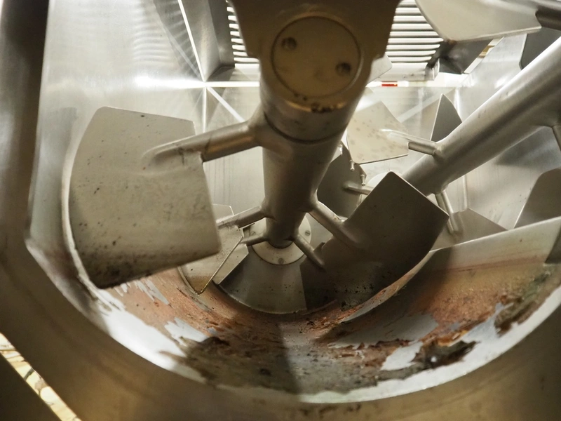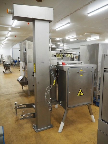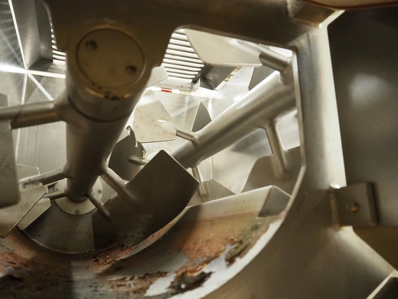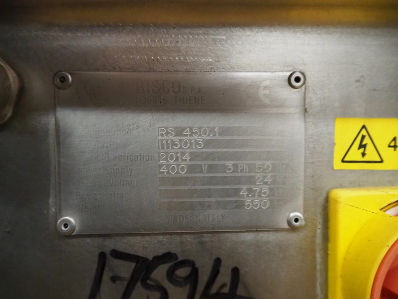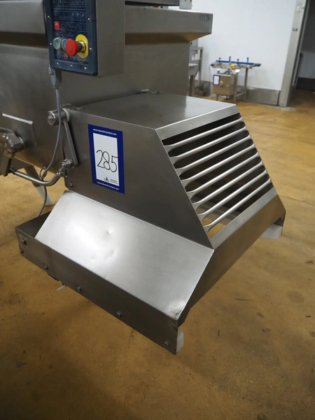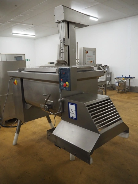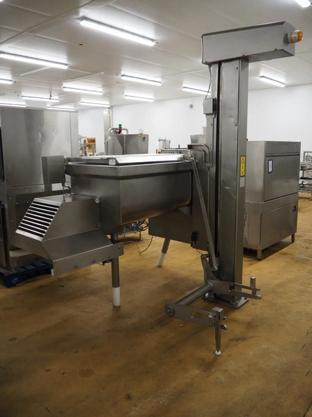 Risco S.P.A. double shaft paddle mixer with lifter for 200 liter meat bins, type: RS 450.1, serial number: I113013, year of construction: 2014, 400 V, 3 Ph, 50 Hz, 4.75 kW, machine weight: 550 kg, dimensions mixer: 1850 mm x 1100 mm x 1580 mm.