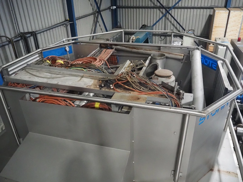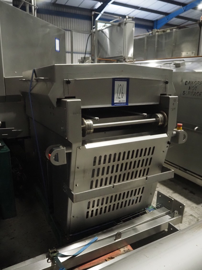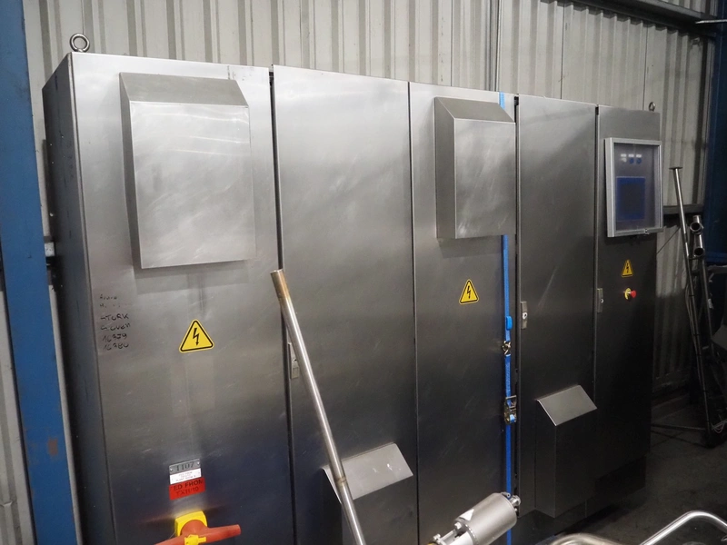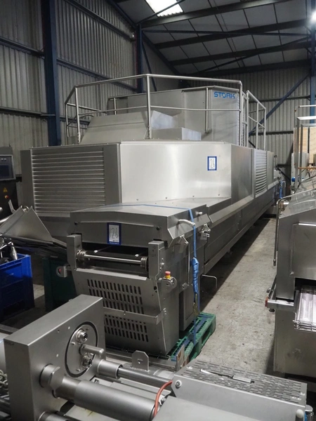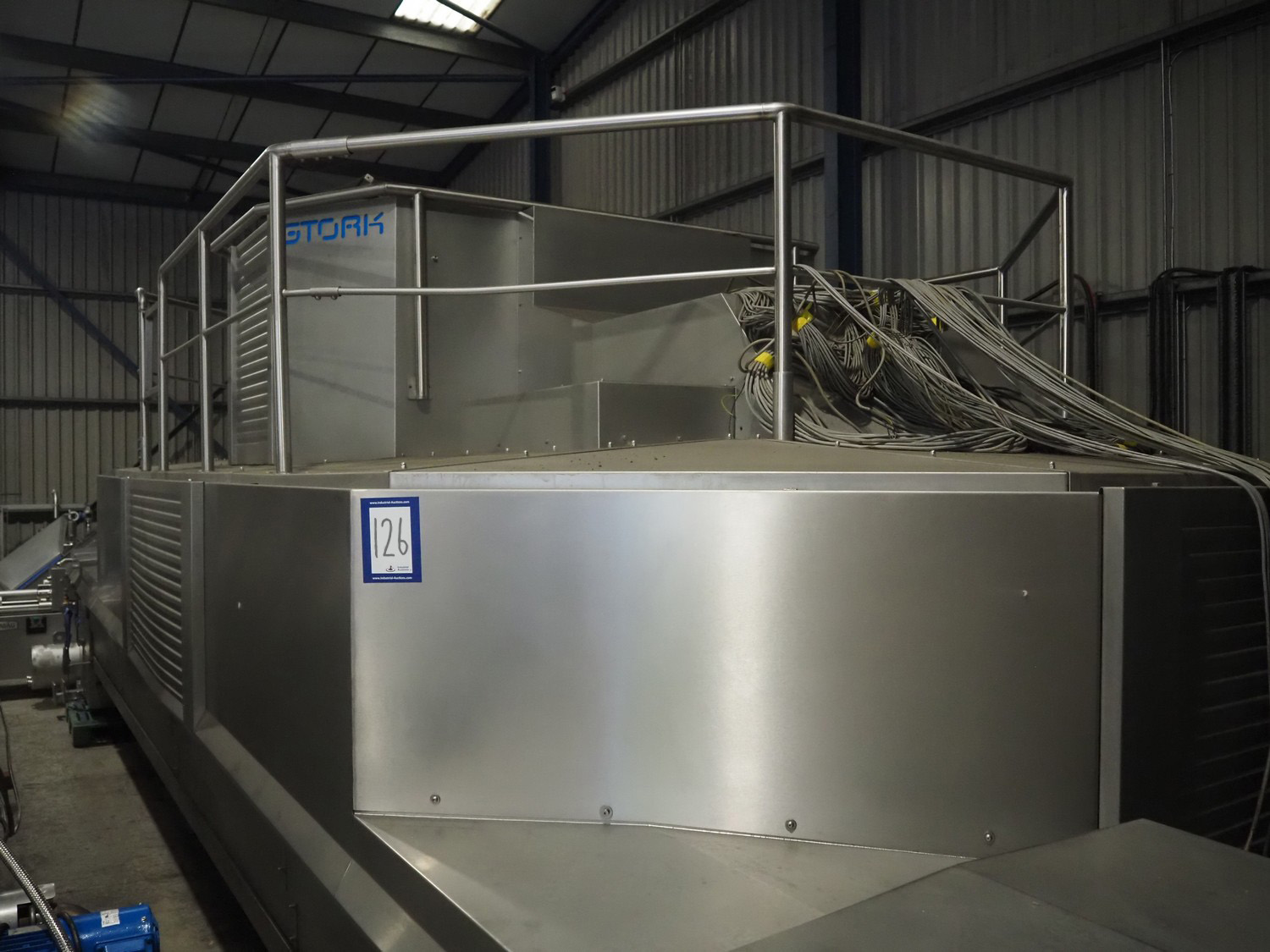 Marel Stork Titan B.V. twin drum spiral oven, model: TSO 600/96/4 EL TH0302, type: 4786432AA, serial number: 10077687, year of construction: 2010, belt width s/s mesh belt: 600 mm, clockwise rotation, left hand execution, total dimensions oven: 8500 mm x 4000 mm x 3500 mm, dimensions in-and outfeed station: (2x) 1300 mm x 1200 mm x 1400 mm.