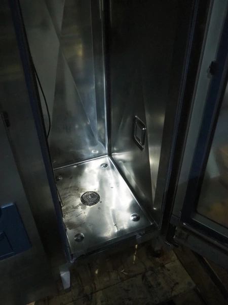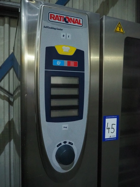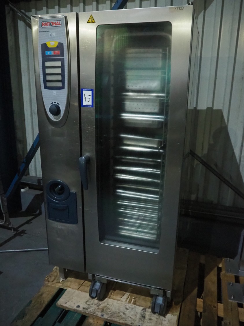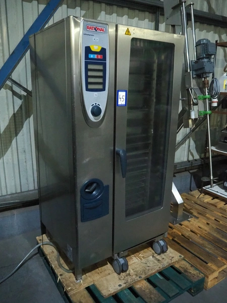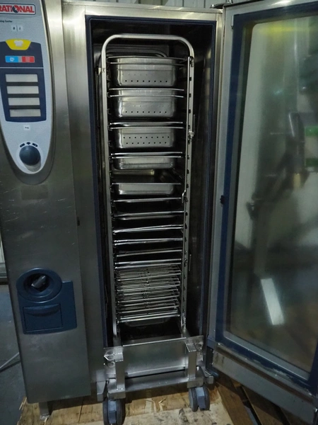 Rational combi steamer, dimensions: 900 mm x 860 mm x 1800 mm. Including s/s trolley, 20 floors, dimensions floors: 530 mm x 330 mm.