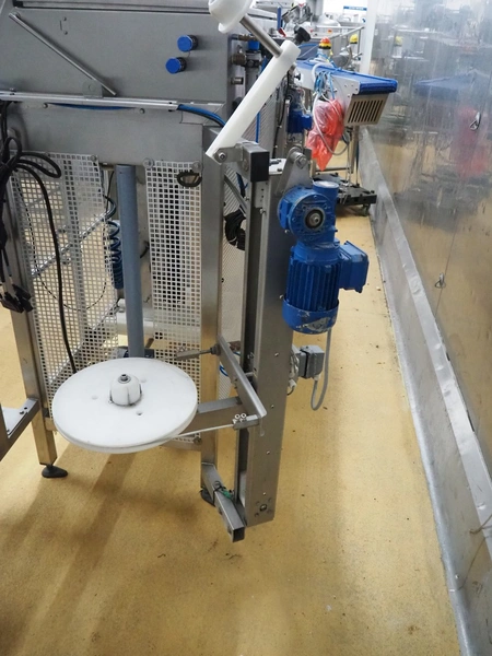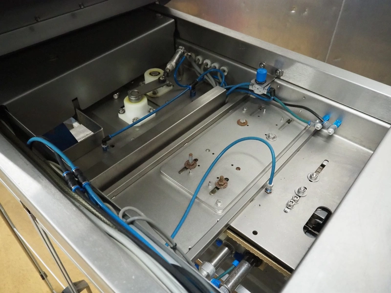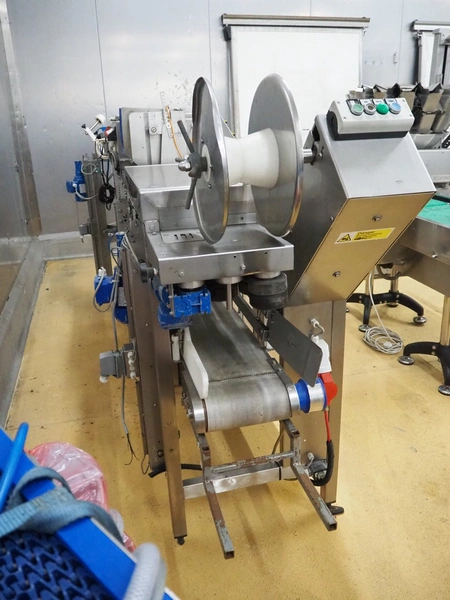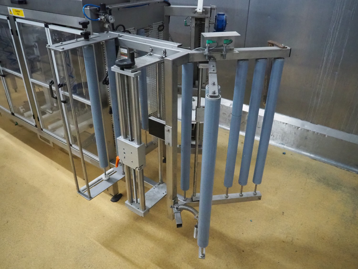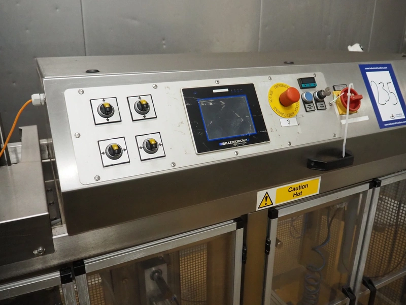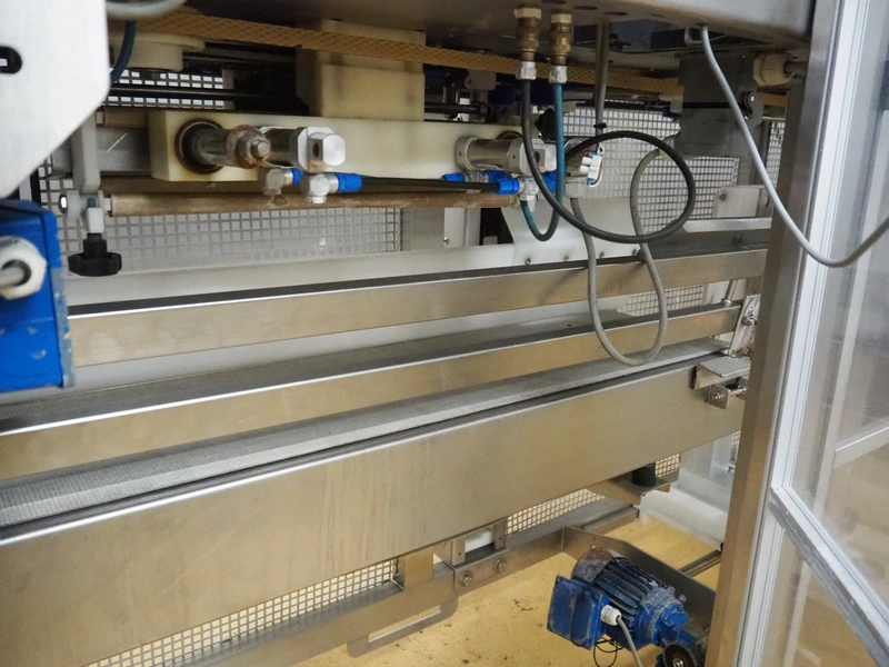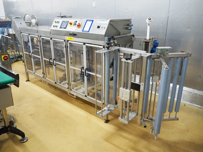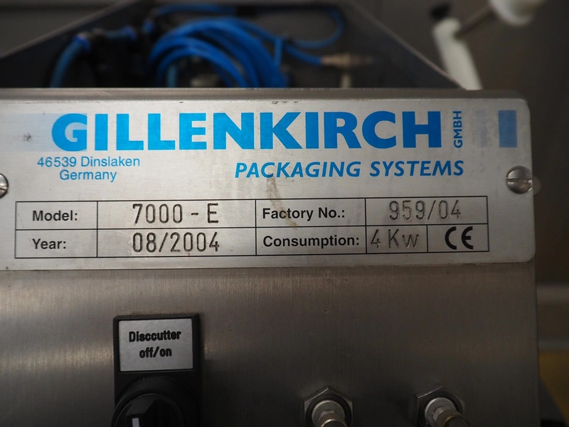 Gillenkirch Packaging Systems GmbH vertical and horizontal sealing machine for vegetables, model: 7000-E, factory number: 959/04, year of construction: 08/2004, 4 kW, seal length: 600 mm, plastic outfeed belt, belt width: 250 mm, total dimensions: 3750 mm x 1700 mm x 1630 mm.