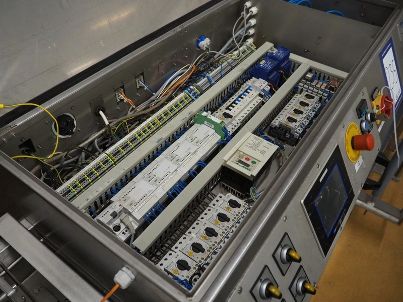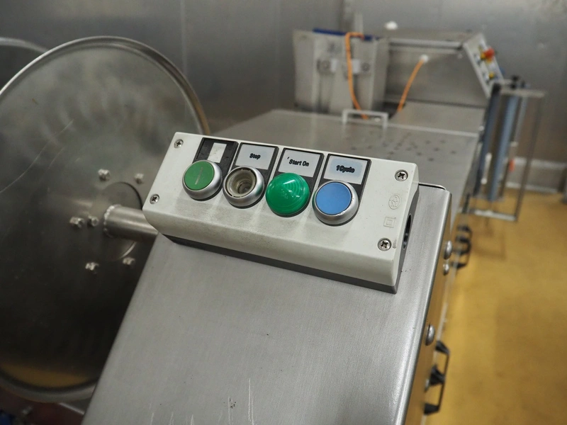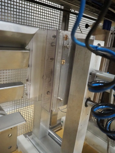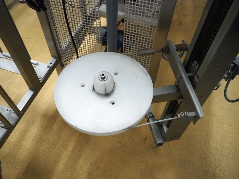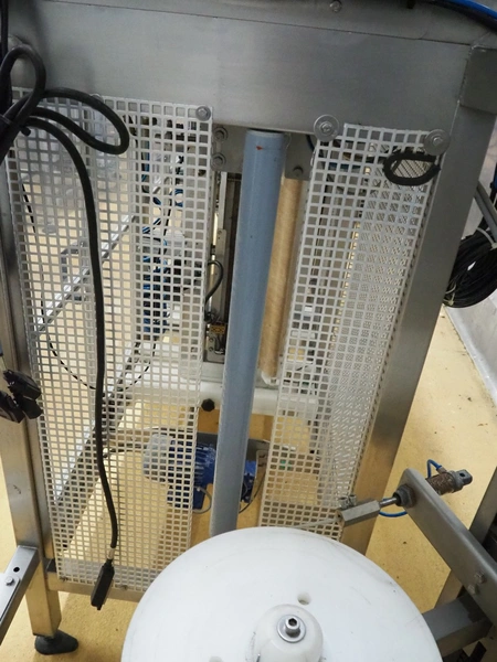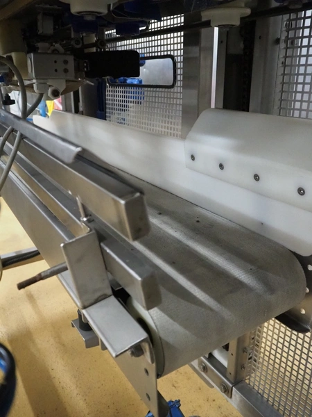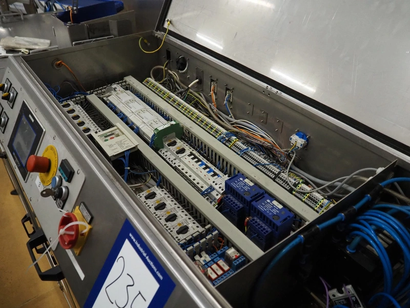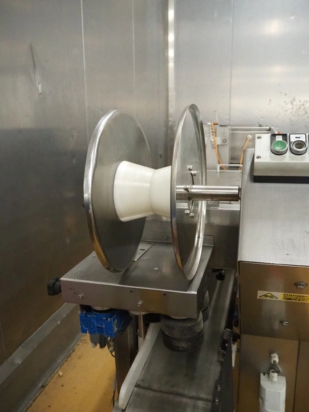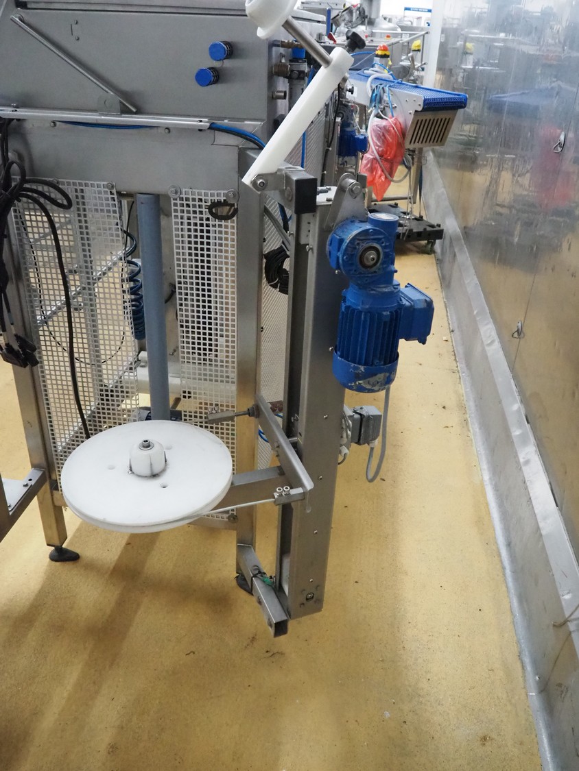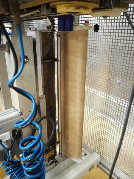 Gillenkirch Packaging Systems GmbH vertical and horizontal sealing machine for vegetables, model: 7000-E, factory number: 959/04, year of construction: 08/2004, 4 kW, seal length: 600 mm, plastic outfeed belt, belt width: 250 mm, total dimensions: 3750 mm x 1700 mm x 1630 mm.