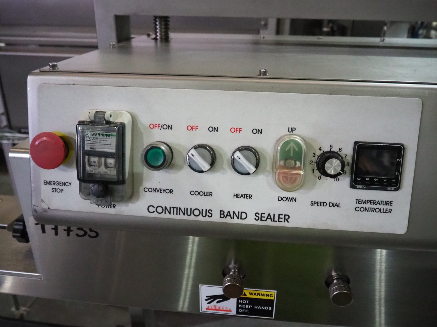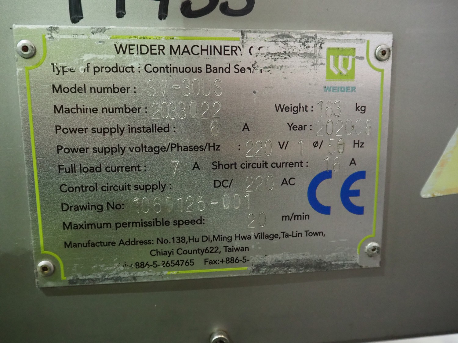 Weider Machinery continuous band sealer, model: SV-30US, number: 2033022, year of construction: 202008, 220 V, 1 Ph, 50 Hz, 6 A, weight: 163 kg, plastic belt, belt width: 300 mm, total dimensions: 202 mm x 600 mm x 1550 mm.