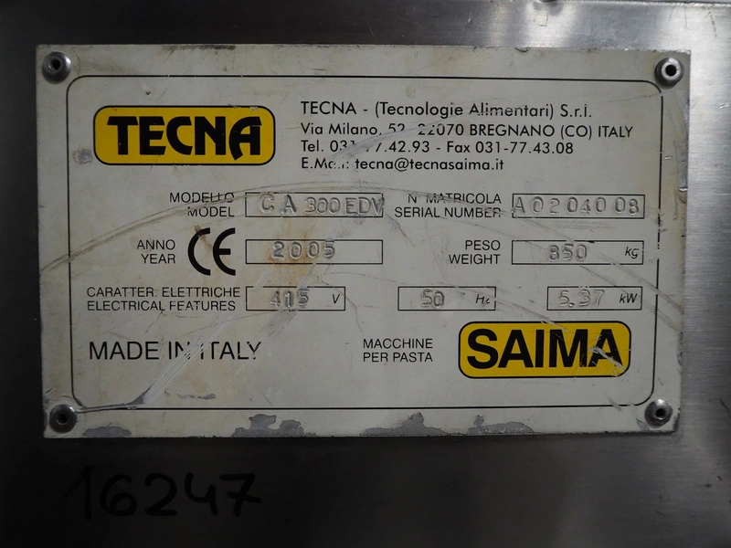Tecna pasta mixer and sheeter, model: CA 300 EDV, serial number: A0204008, year of construction: 2005, 415 V, 50 Hz, 5,27 kW, 850 Kg, working width: 300 mm, belt width: 340 mm, total dimensions: 1200 mm x 2000 mm x 1650 mm.