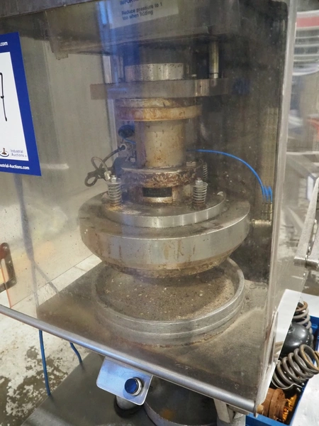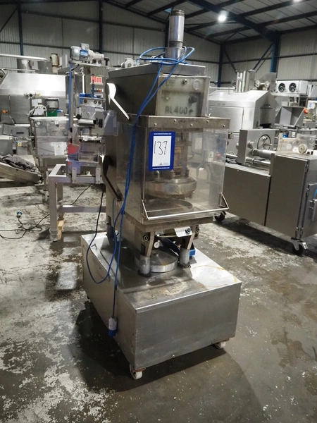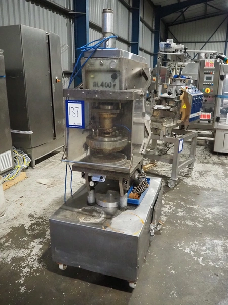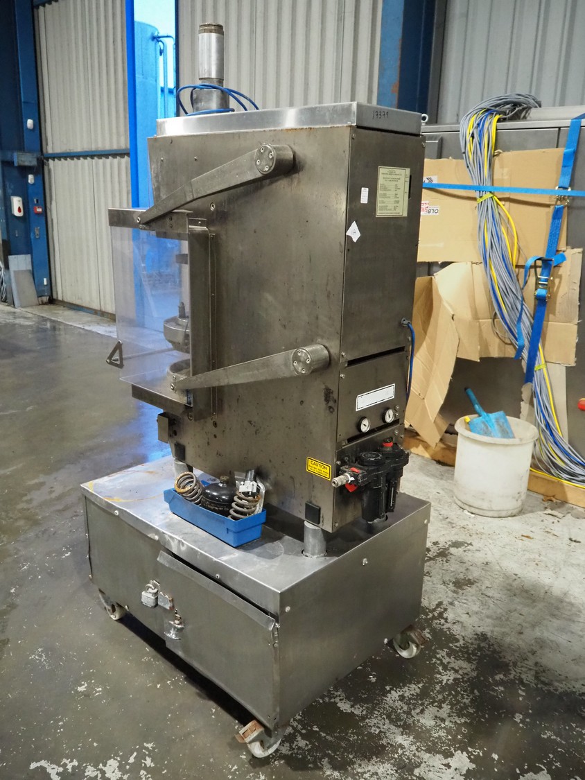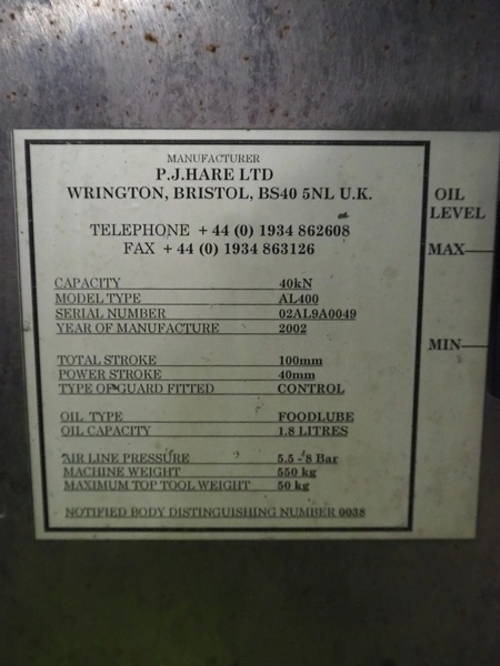 P.J. Hare LTD hydraulic press, model: AL400, serial number: 02AL9A0049, year of construction: 2002, capacity: 40 kN, weight: 550 kg, diameter: 320 mm, total dimensions: 1100 mm x 700 mm x 2000 mm.