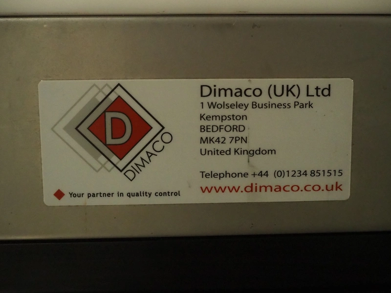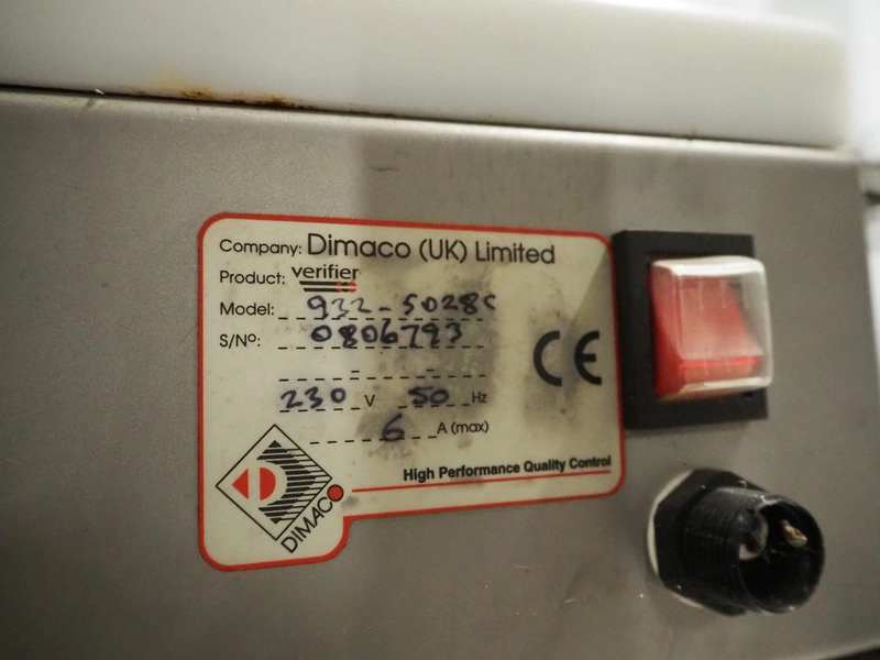Dimaco UK Limited verifier, model: 932-5028c, serial number: 0806793, 230 V, 50 Hz, 6 A, dimensions: 620 mm x 480 mm x 750 mm.