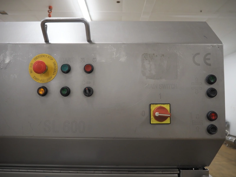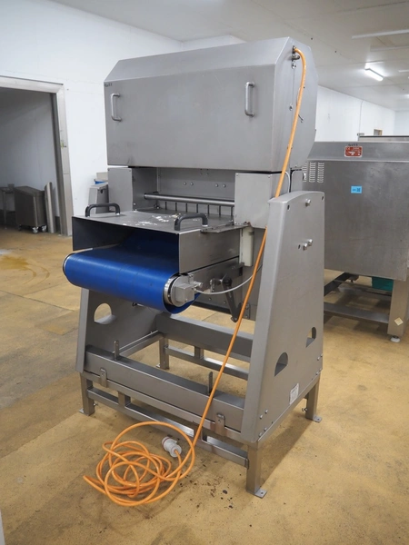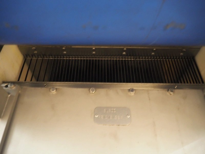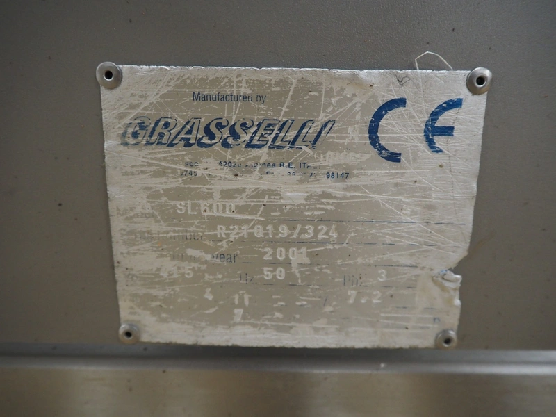 Grasselli slicer, model: SL 600, serial number: R21Q19/324, year of construction: 2001, 415 V, 3 Ph, 50 Hz, plastic belt, belt width: 570 mm, 61 knives, distance between knives: 10 mm, total dimensions: 1200 mm x 1300 mm x 2000 mm.