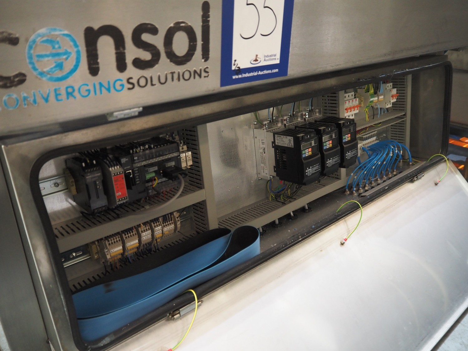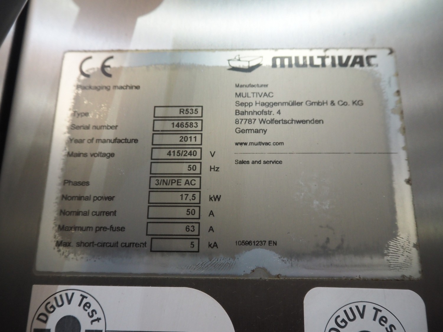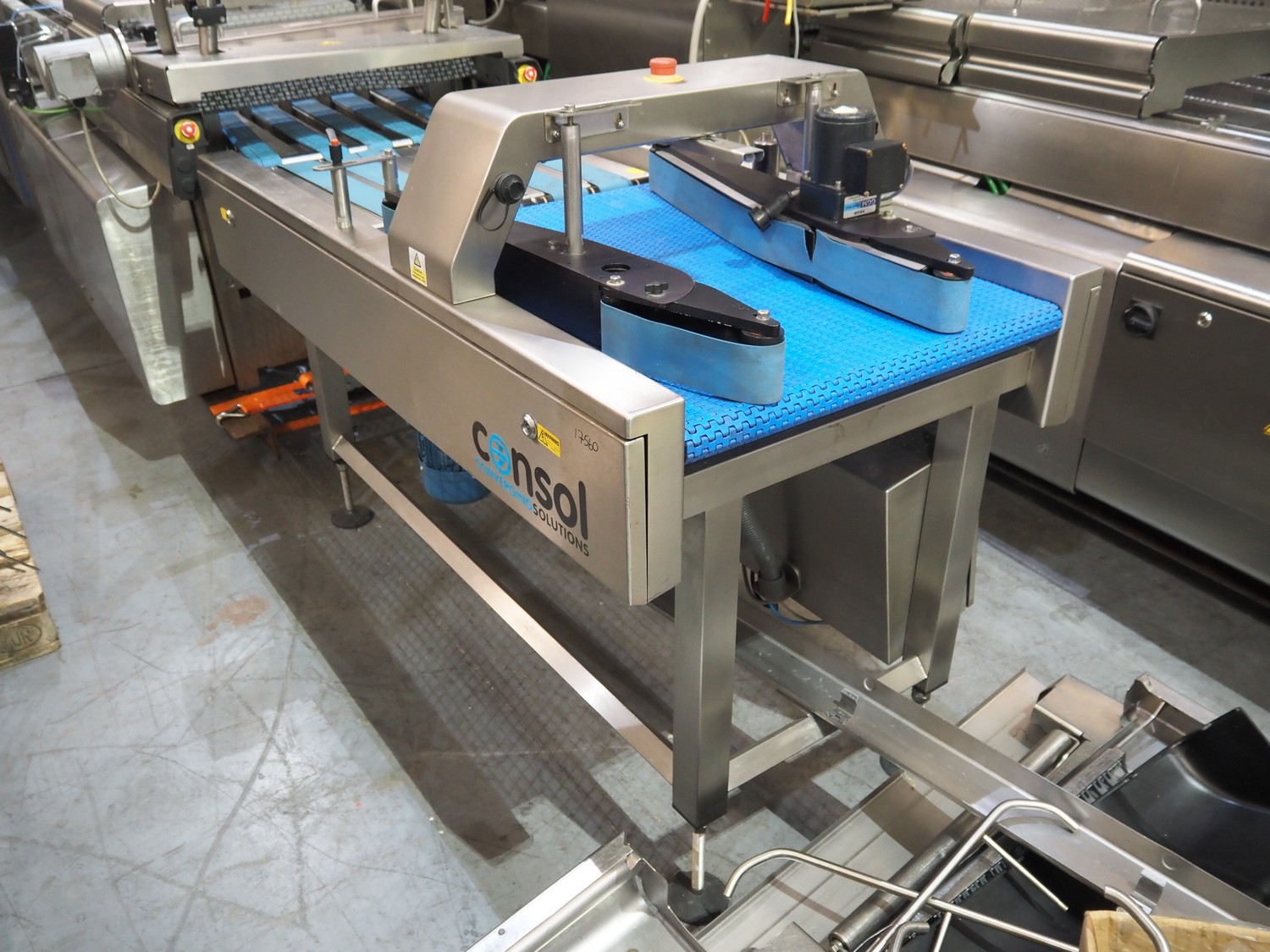 Multivac thermoformer, type: R535, serial number: 146583, year of construction: 2011, 415 V, 3 Ph, 50 Hz, 50 A, 17.5 kW, film width: 570 mm, dimensions dye: (10x) 243 mm x 93 mm, with Consol Converging solutions inliner, model: Integrator 3, serial number: CS6196, year of construction: 05/2016, 230 V, 16 A, plastic belt, belt width: (5x) 80 mm, 680 mm, total dimensions: 8200 mm x 1300 mm x 2300 mm, 1500 mm x 1200 mm x 600 mm.