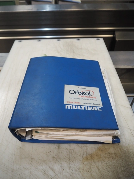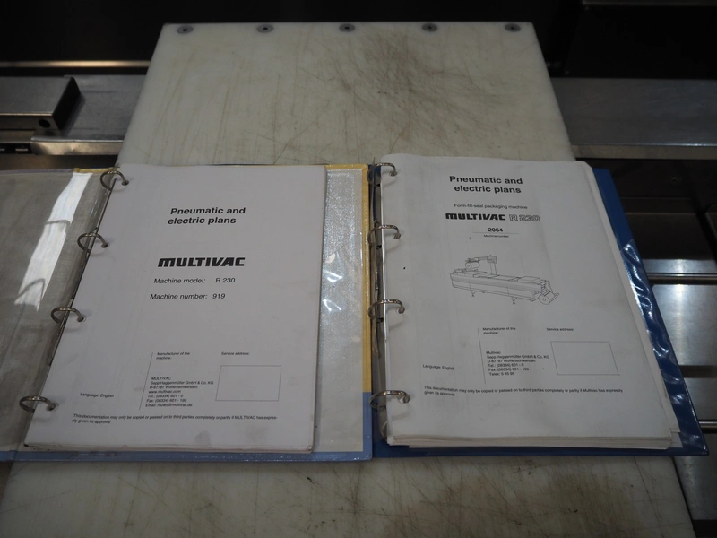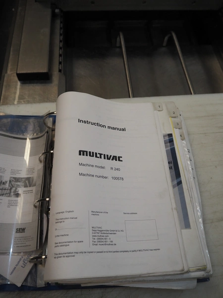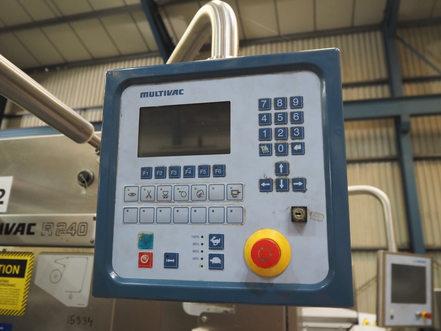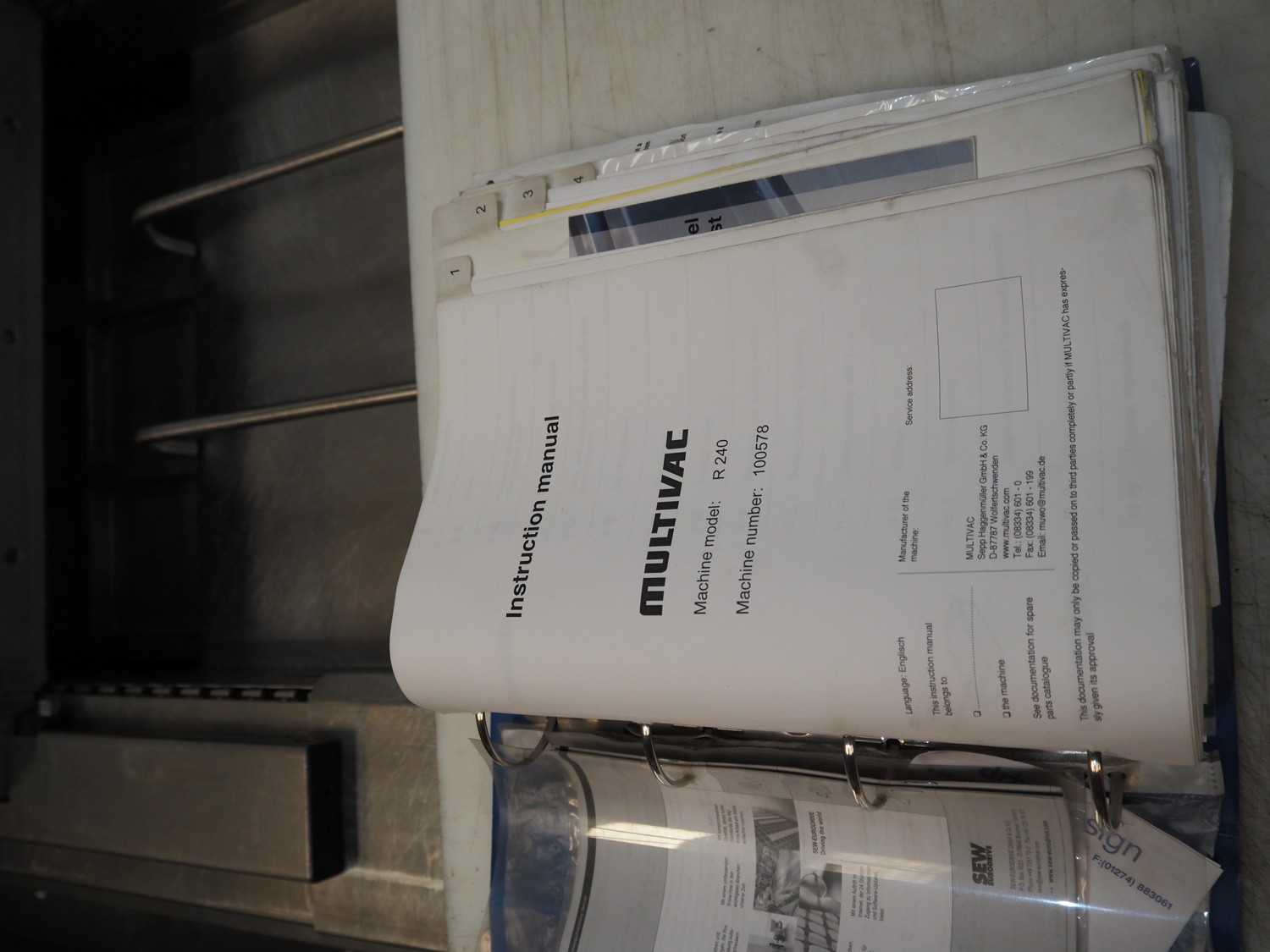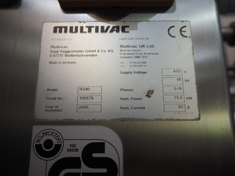 Multivac thermoformer, type: R240, serial number: 100578, year of construction: 2005, 415 V, 3 Ph, 50 Hz, 43 A, 15.5 kW, index: 410 mm, dye: (6x) 190 mm x 160 mm, total dimensions: 6400 mm x 1200 mm x 2100 mm.