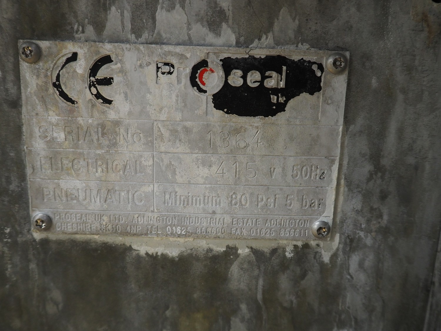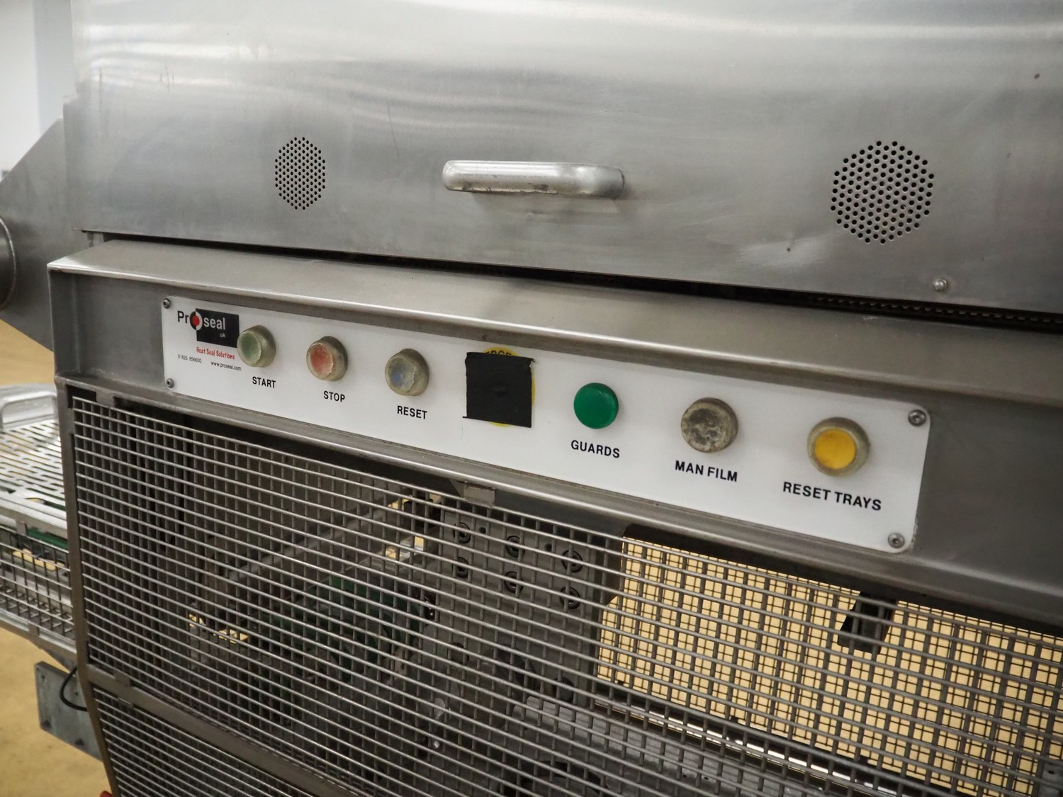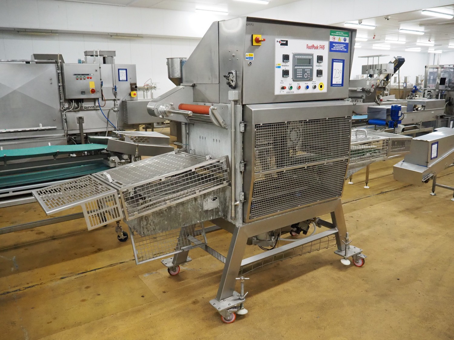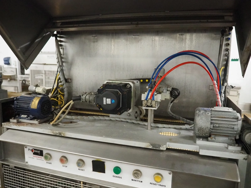 Proseal mobile traysealer, type: Fastpack F45, serial number: 1364, 415 V, 50 Hz, plastic wire belt, belt width: 200 mm, total dimensions: 3000 mm x 900 mm x 1920 mm. Incomplete, missing dye set, missing belts.
