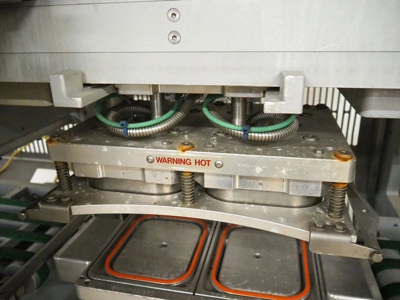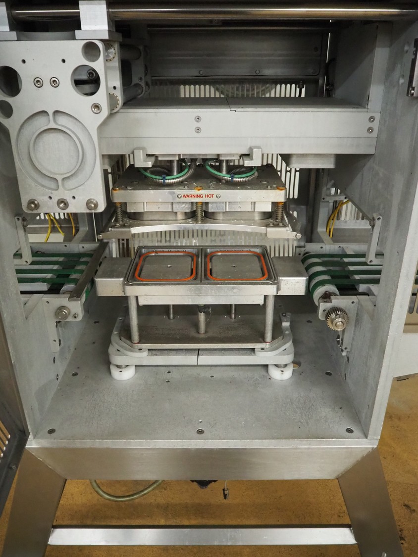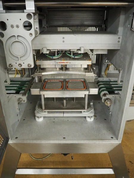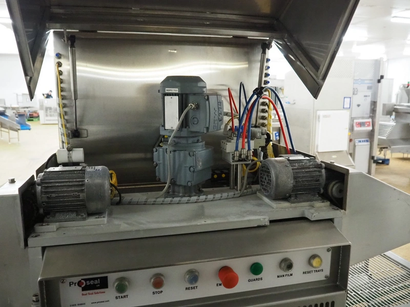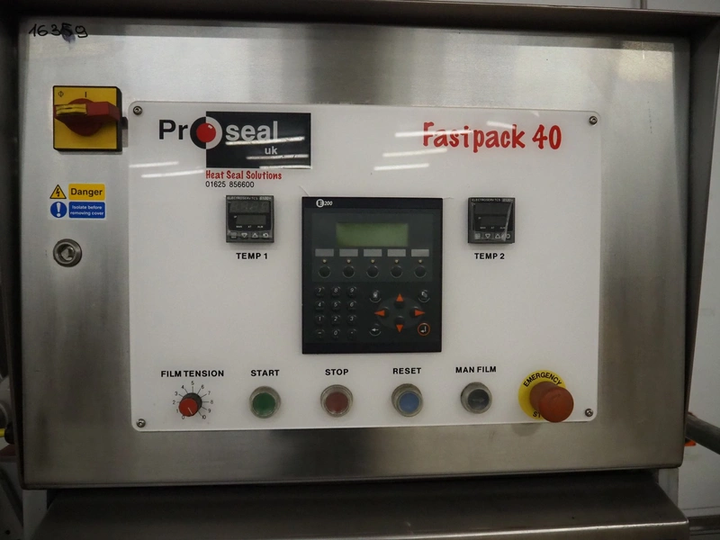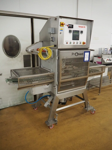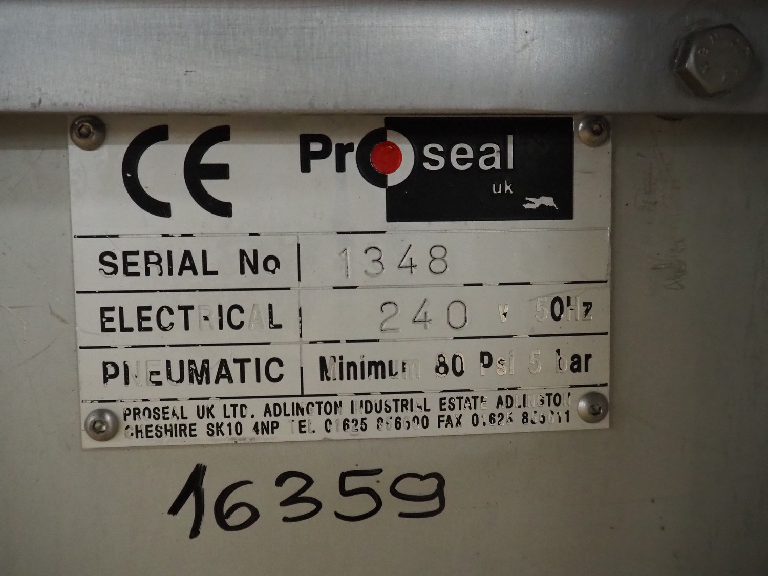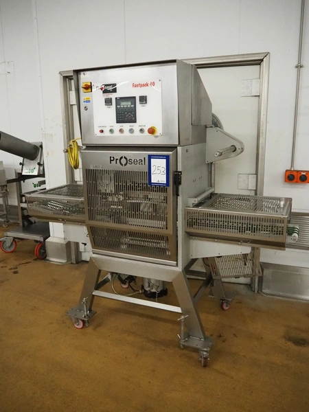 Proseal mobile traysealer, model: FastPack 40, serial number: 1348, 240 V, 50 Hz, plastic wire belt, belt width: 180 mm, 2 dyes, dye dimensions: 185 mm x 140 mm, total dimensions: 2200 mm x 900 mm x 2000 mm.