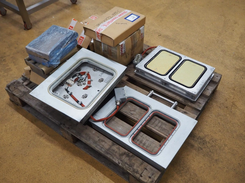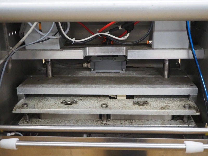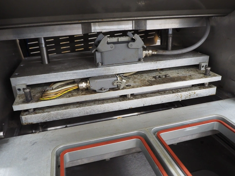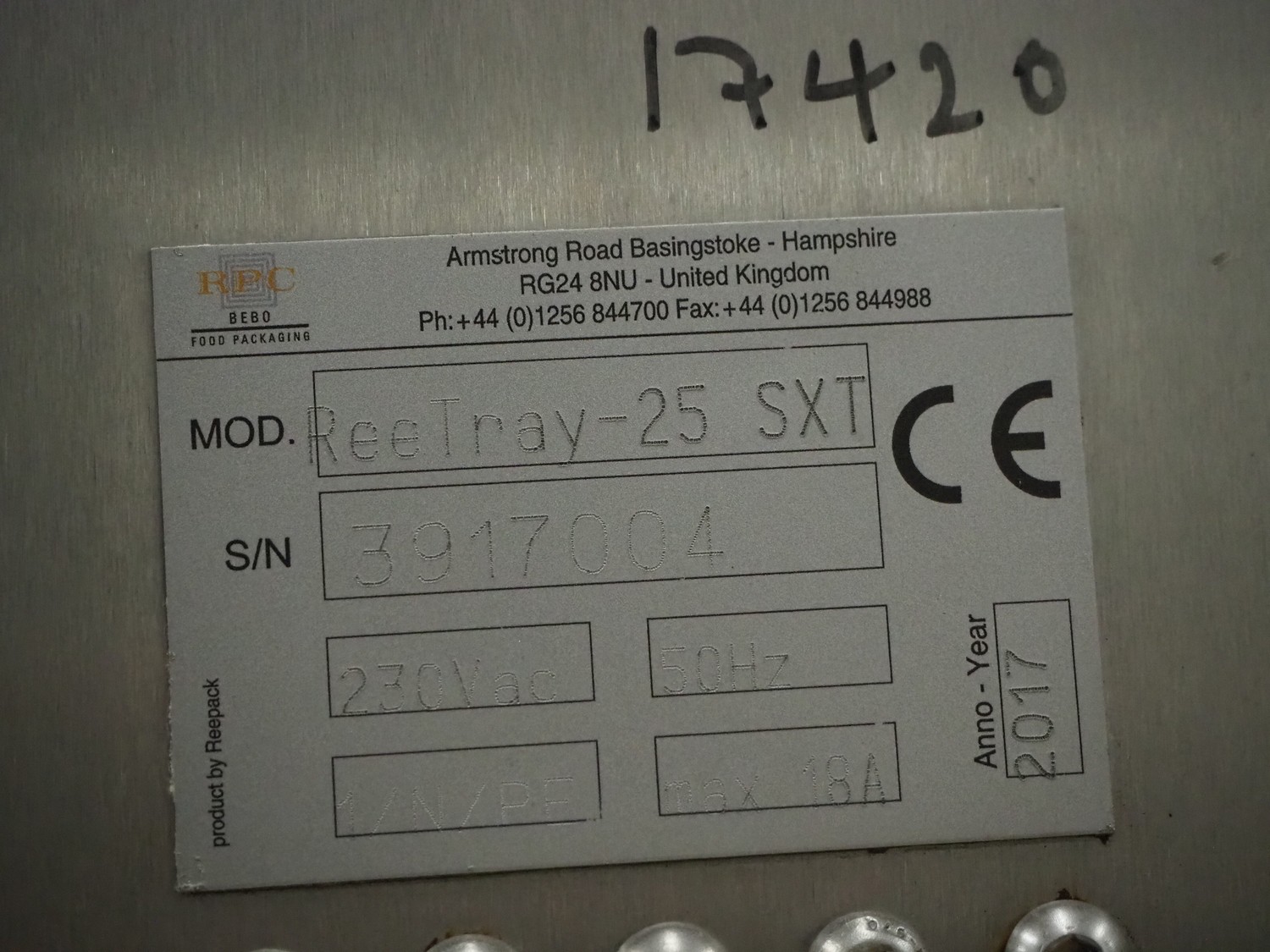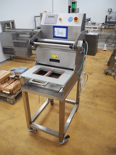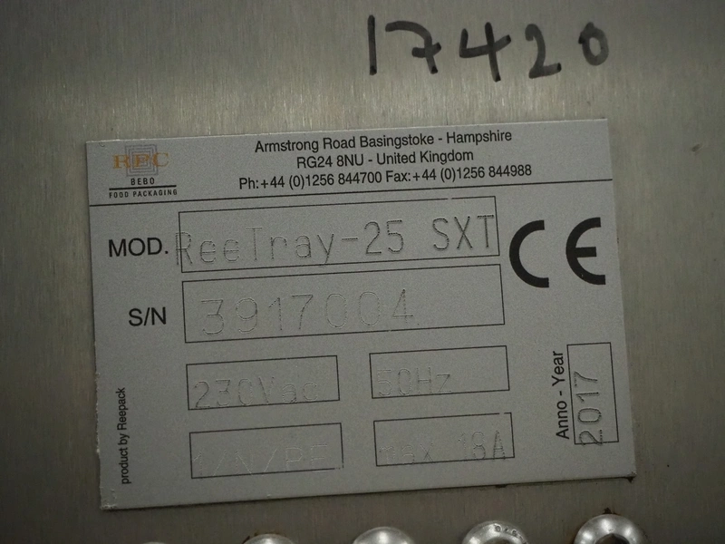 Reepack mobile traysealer, model: ReeTray-25 SXT, serial number: 3917004, year of construction: 2017, 230 V, 1 Ph, 50 Hz, maximum: 18 A, dye: (2x) 205 mm x 145 mm, film width: 500 mm, total dimensions: 1000 mm x 700 mm x 1700 mm. Including pallet with extra parts, dye: (1x) 370 mm x 270 mm, (2x) 265 mm x 165 mm.