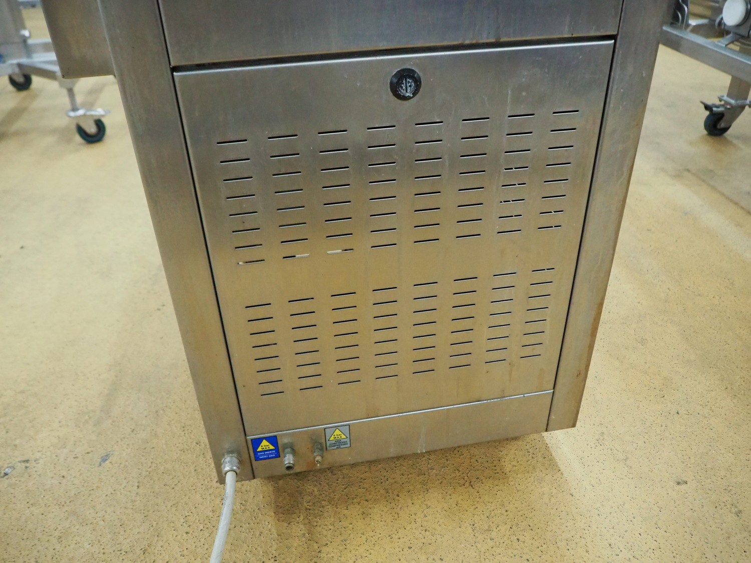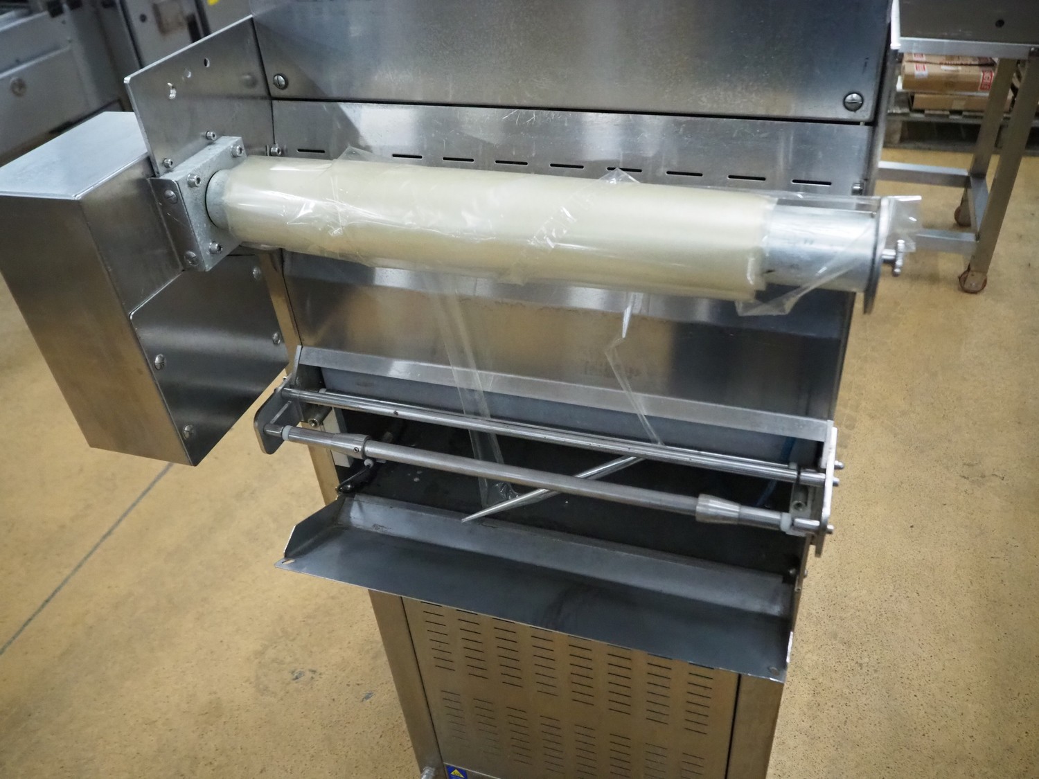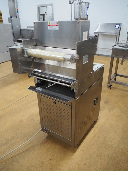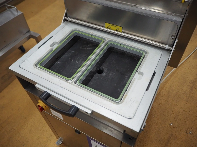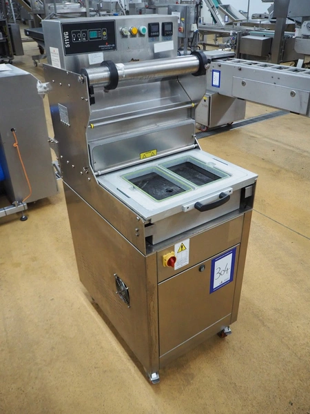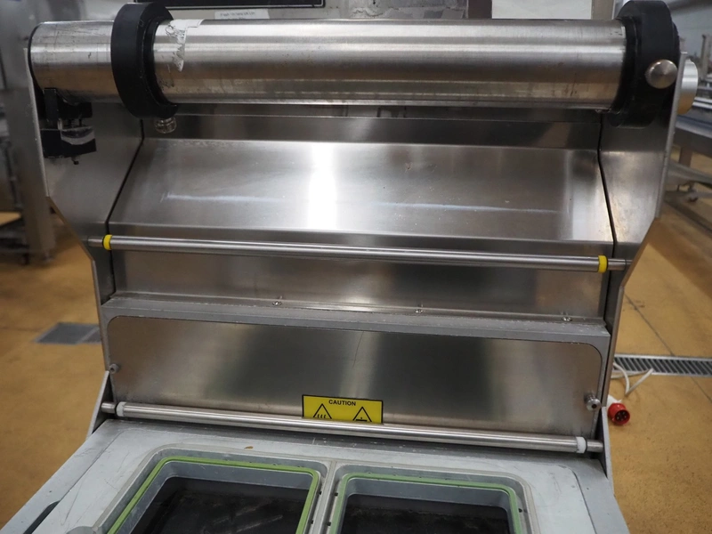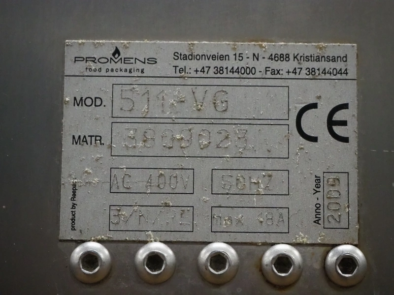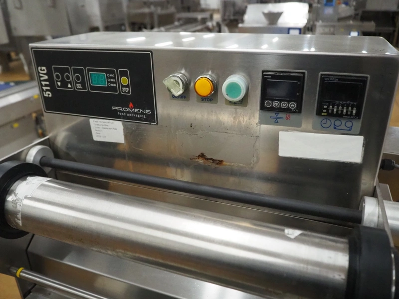 Promens Food Packaging mobile traysealer, model: 511-VG, number: 3803023, year of construction: 2009, 400 V, 3 Ph, 50 Hz, 18 A, dye: (2x) 260 mm x 165 mm, film width: 425 mm, total dimensions: 1040 mm x 680 mm x 1490 mm.