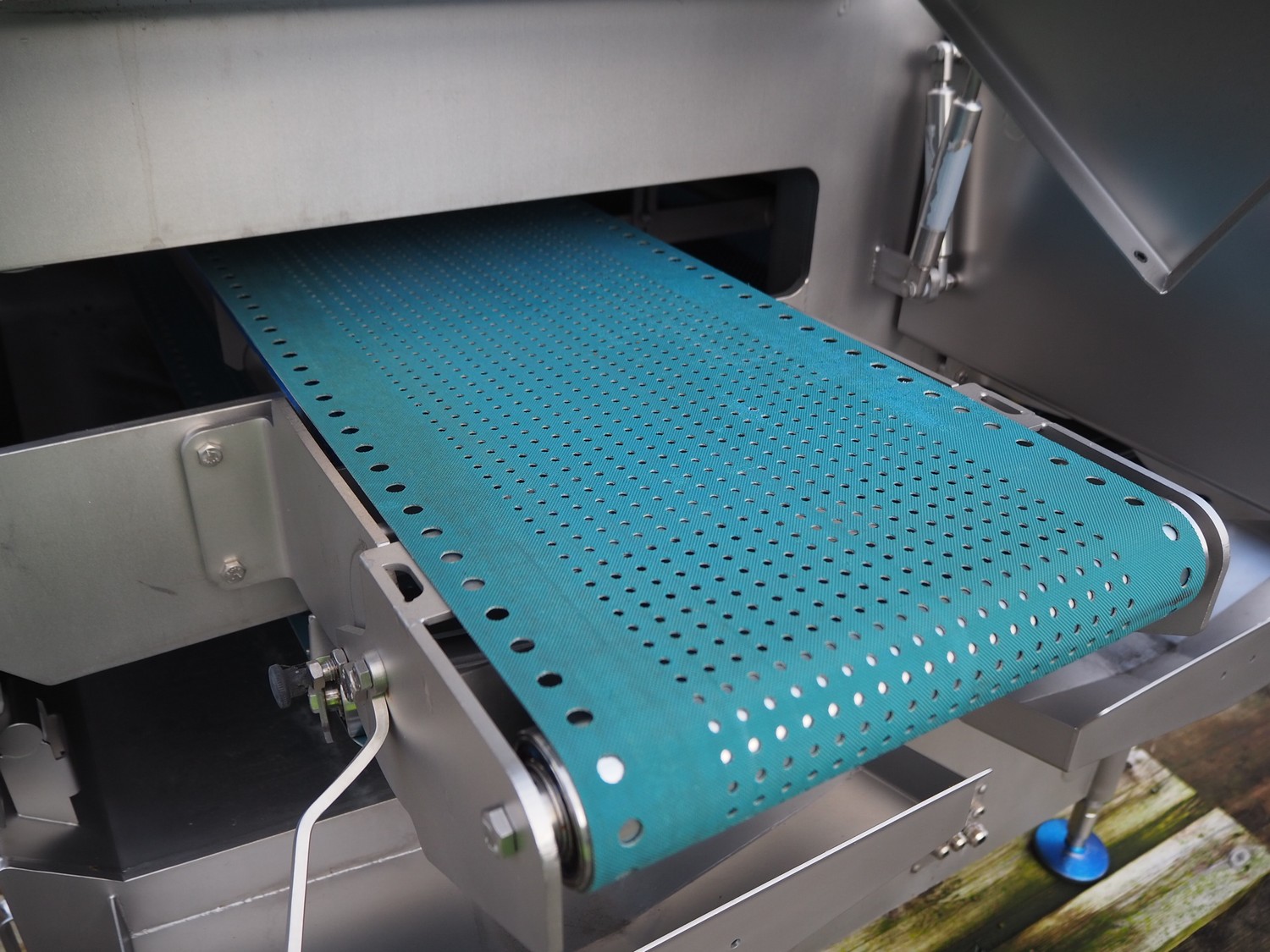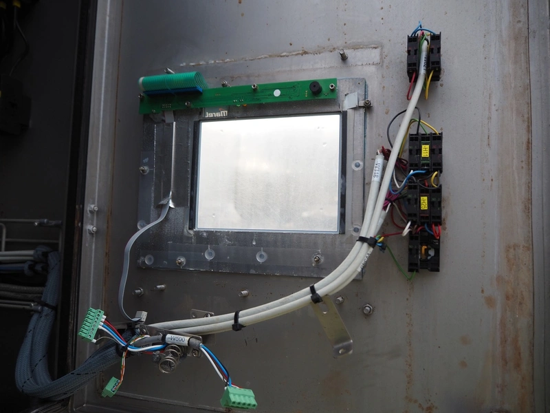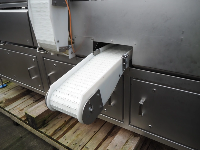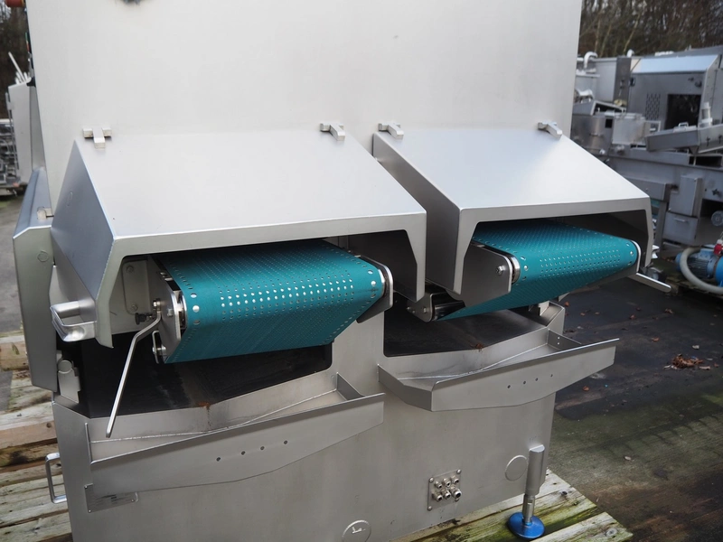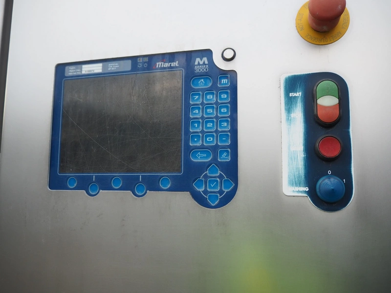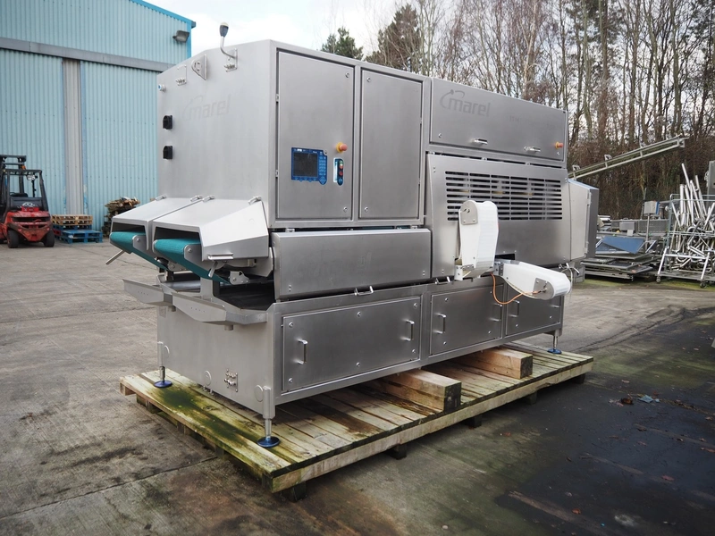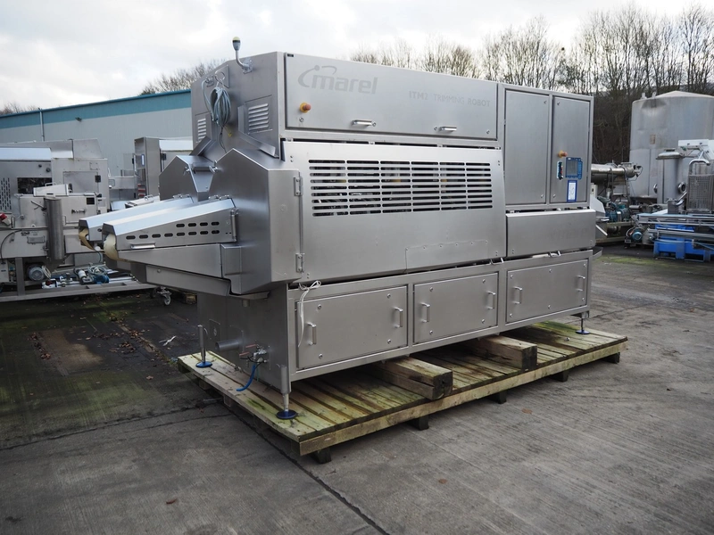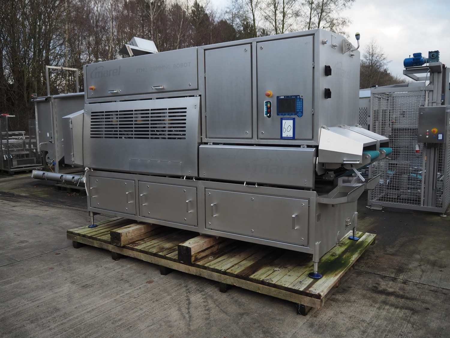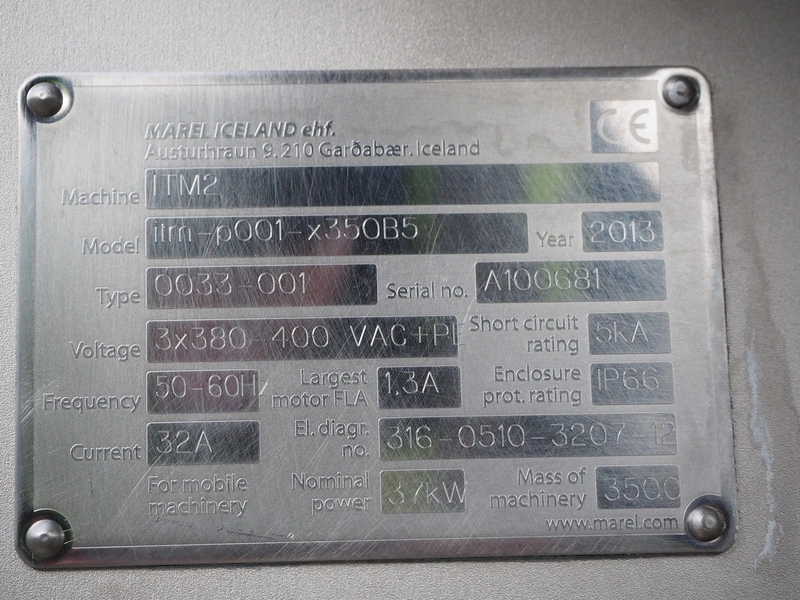 Marel trimming robot, machine: ITM2, model: itm-p001-x350B5, type: 0033-001, serial number: A100681, year of construction: 2013, 380-400 V, 3 Ph, 50-60 Hz, 32 A, 37 kW, weight: 3500 kg, plastic perforated belt, belt width: (2x) 340 mm, total dimensions: 4500 mm x 2100 mm x 2530 mm. Incomplete.