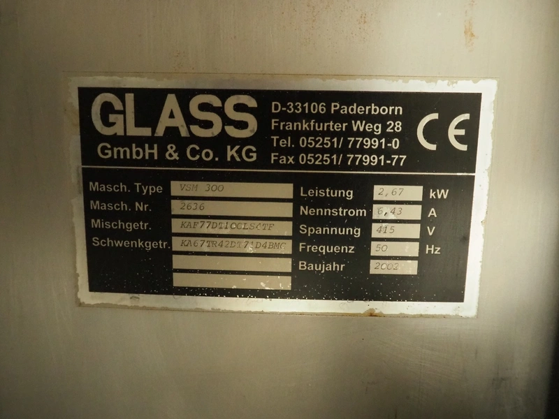 Glass GmbH & Co. KG mobile vacuum tumbler, type: VSM 300, machine number: 2636, year of construction: 2002, 415 V, 50 Hz, 6.43 A, 2.67 kW, dimensions: 2000 mm x 1050 mm x 1570 mm. Incomplete.