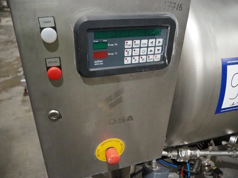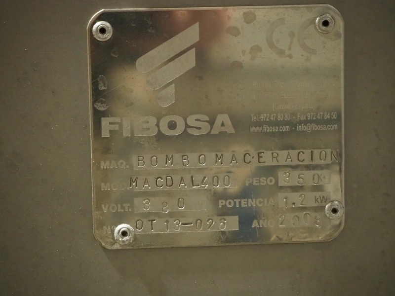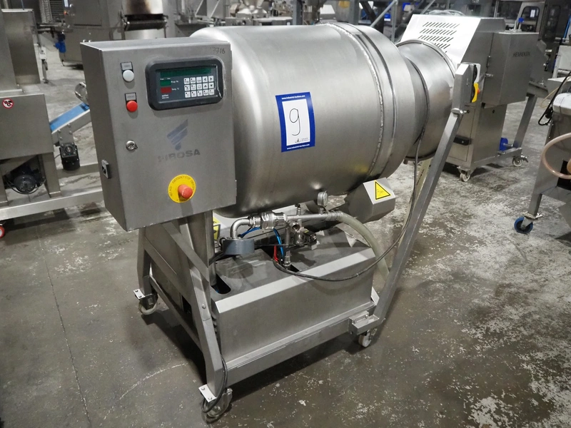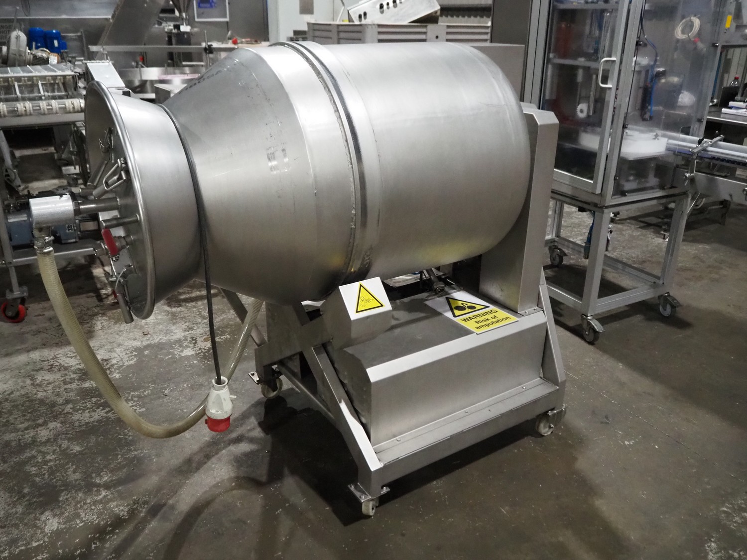Fibosa mobile vacuum tumbler model: MACDAL400, number: OT13-026, year of construction: 2008, 380 V, 1.2 kW, weight: 350 kg, inside dimensions: Ø 700 mm x 1100 mm, total dimensions: 1900 mm x 900 mm x 1400 mm.