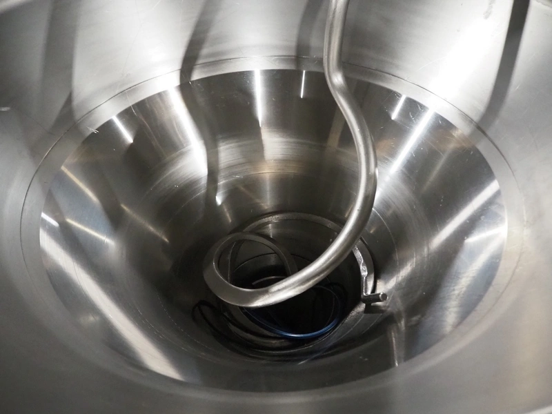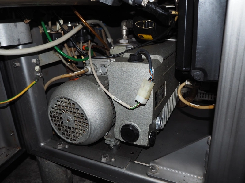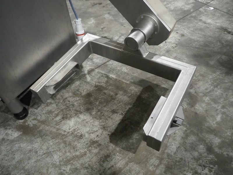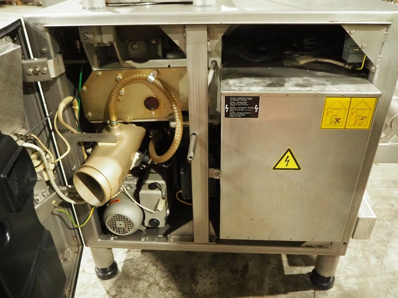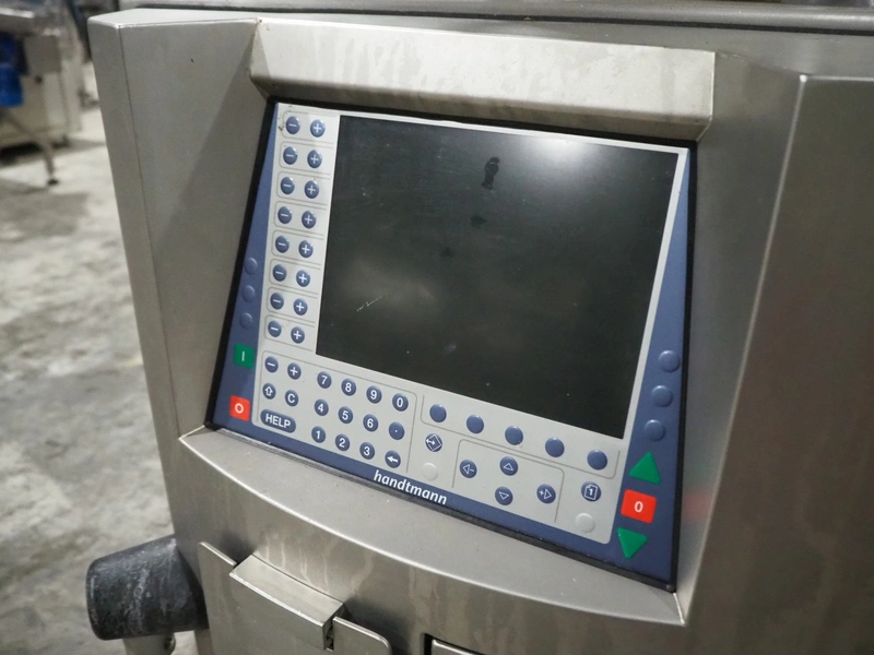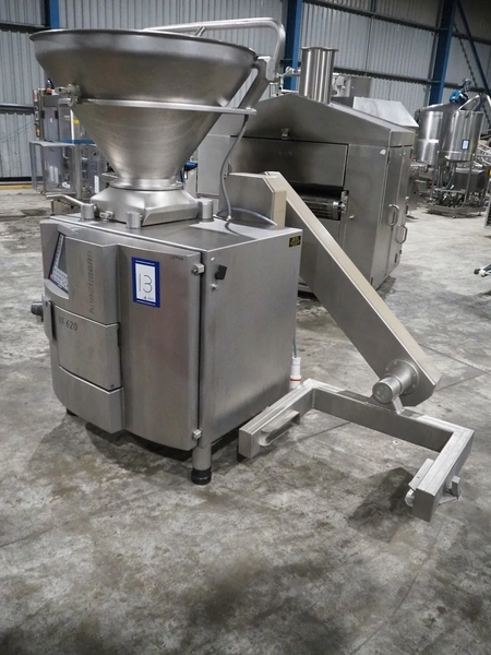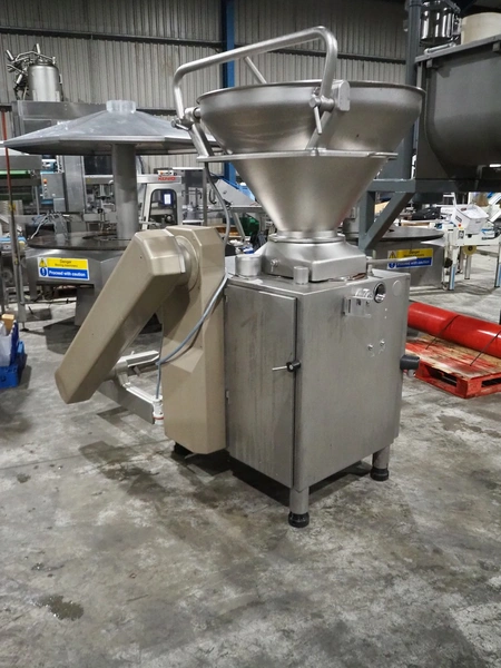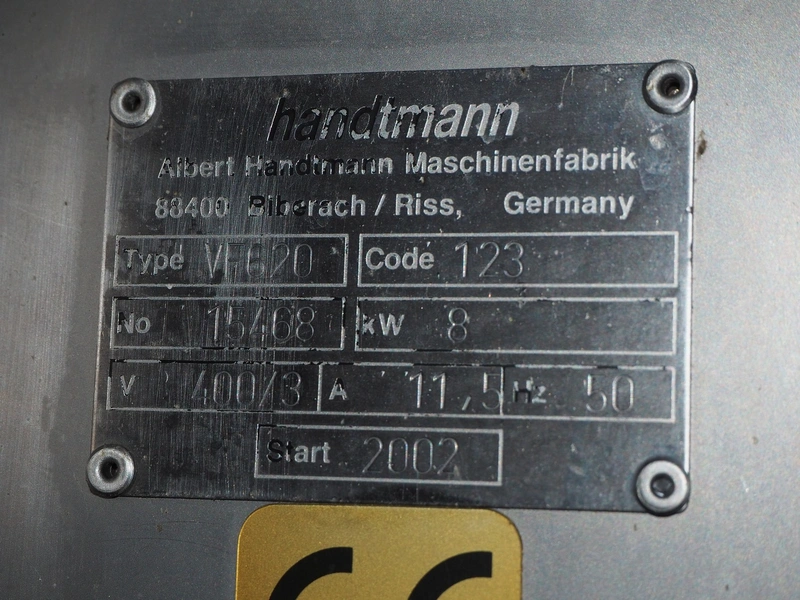 Handtmann vacuum filling machine with lifter for 200 liter meat bins, type: VF620, number: 15468, year of construction: 2002, 400 V, 3 Ph, 50 Hz, 11.5 A, 8 kW, Busch vacuum pump, type: KB 0040 D IZ0, serial number: 120040092, capacity: 40 m³/hour, total dimensions: 2200 mm x 1350 mm x 2150 mm.