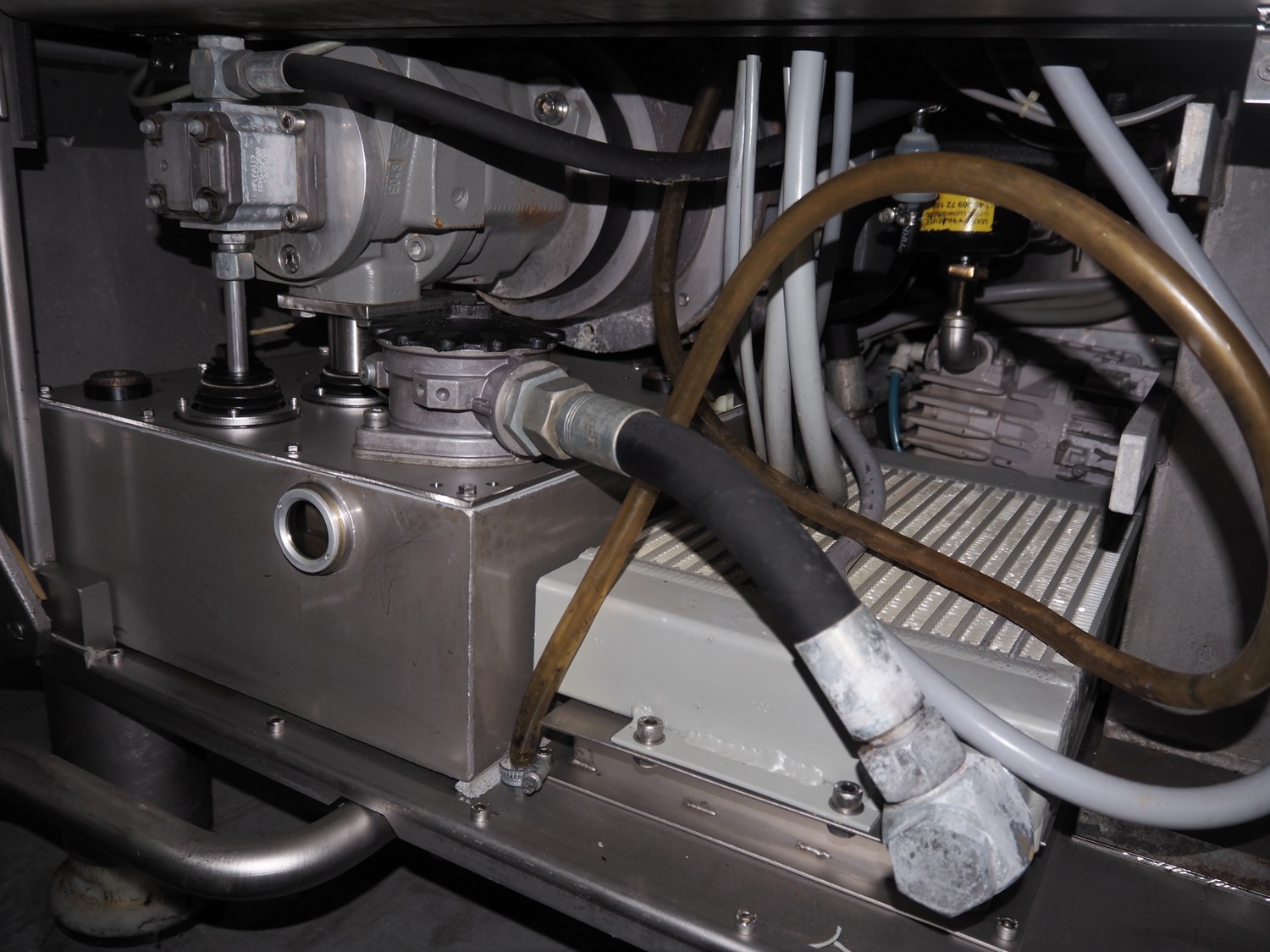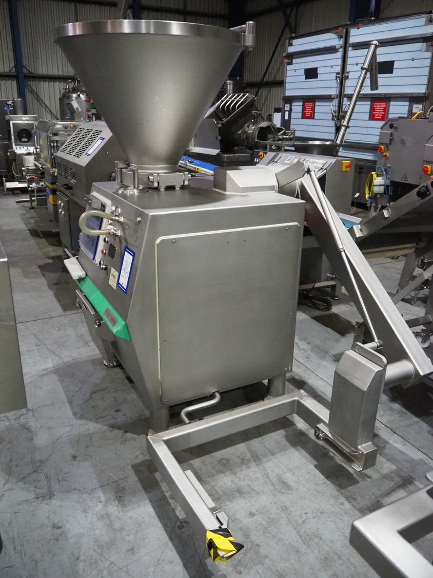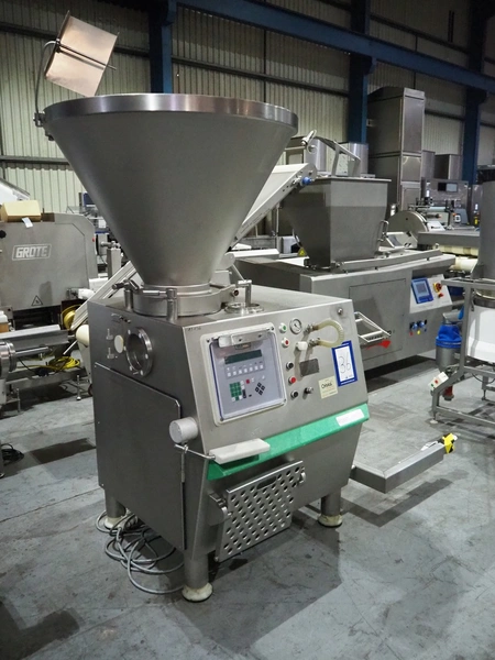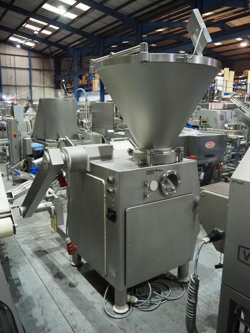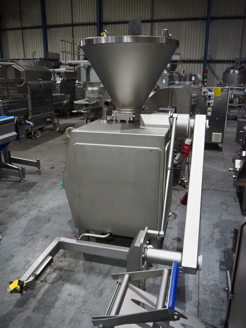 Vemag vacuum filling machine with lifter for 200 liter meat bins, model: HP 10 C, number: 142 1500, year of construction: 2005, 400-460 V, 3 Ph, 50/60 Hz, 29 A, 20 kW, dimensions: 2000 mm x 1300 mm x 2150 mm.