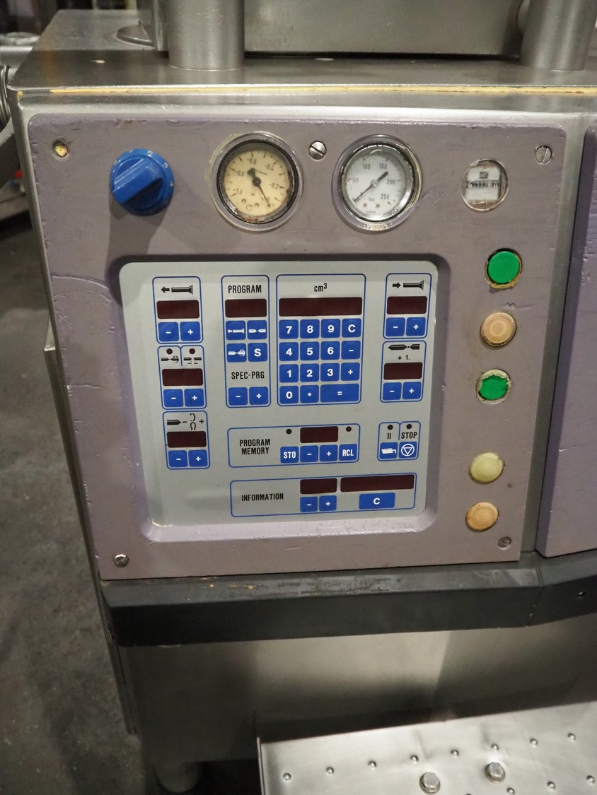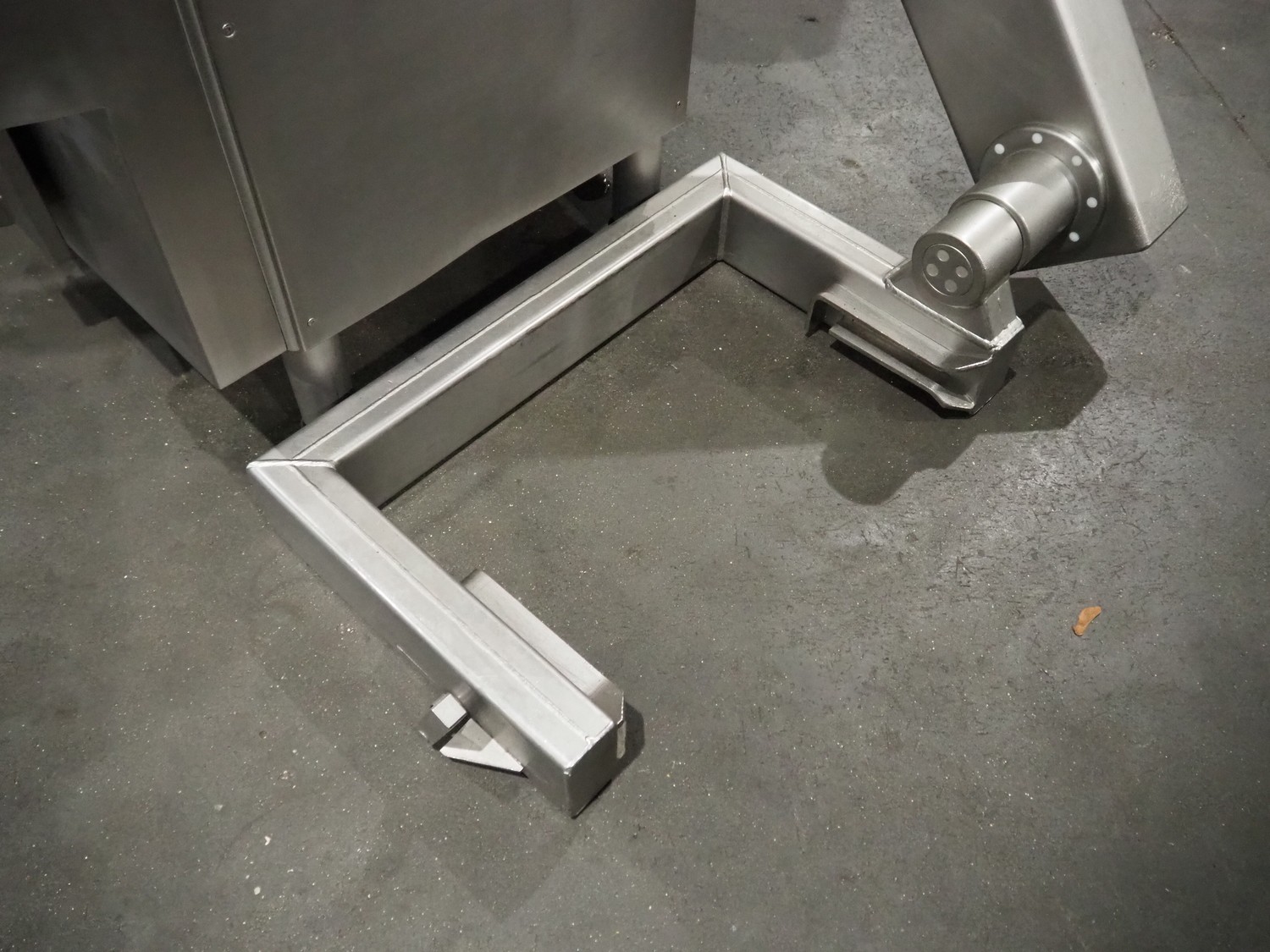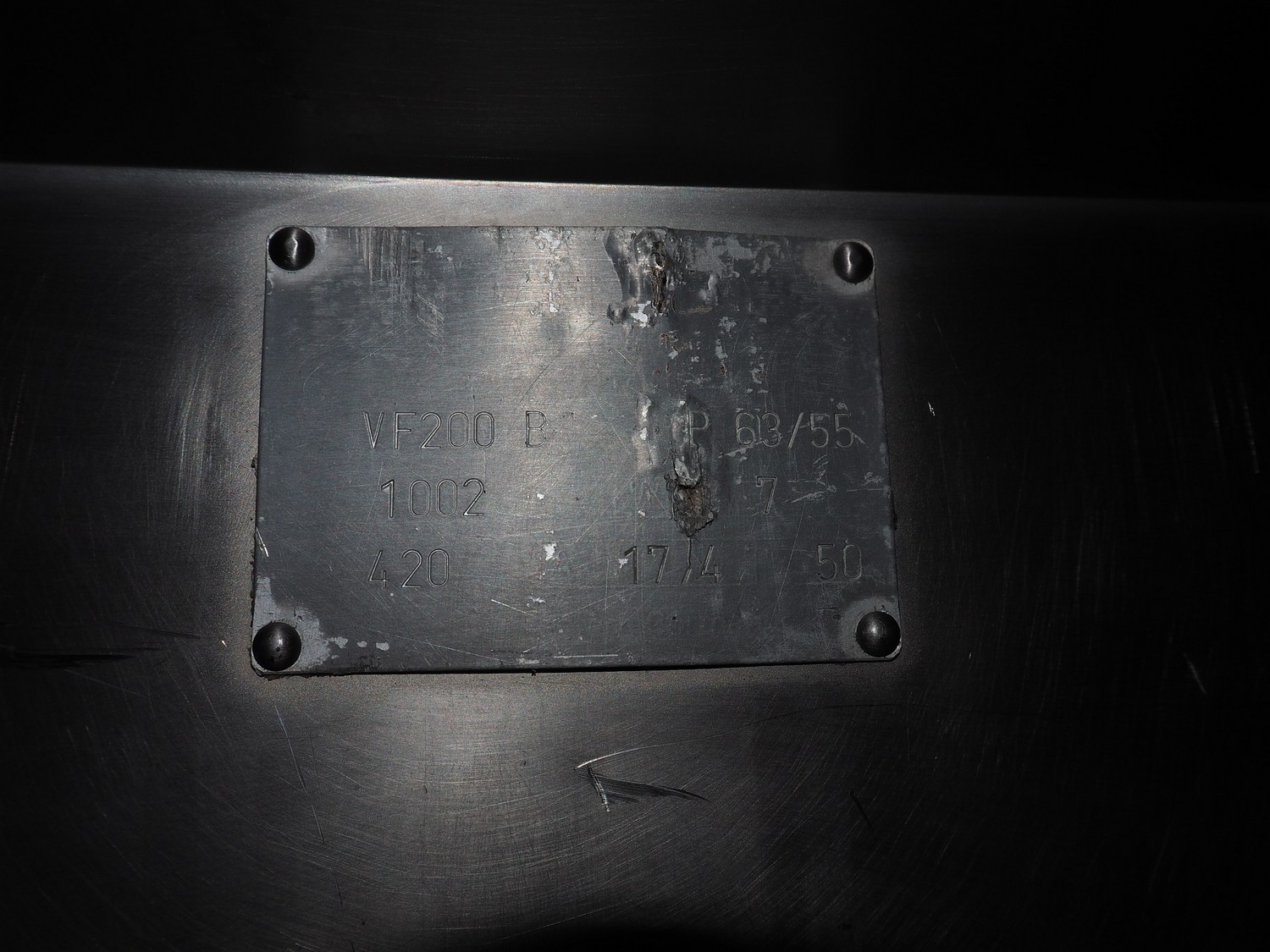Handtmann vacuum filling machine with lifter for 200 liter meat bins, model: VF200B, number: 1002, 420 V, 50 Hz, 17.4 A, 7 kW, filling, portioning and linking, dimensions: 1600 mm x 1300 mm x 1100 mm.