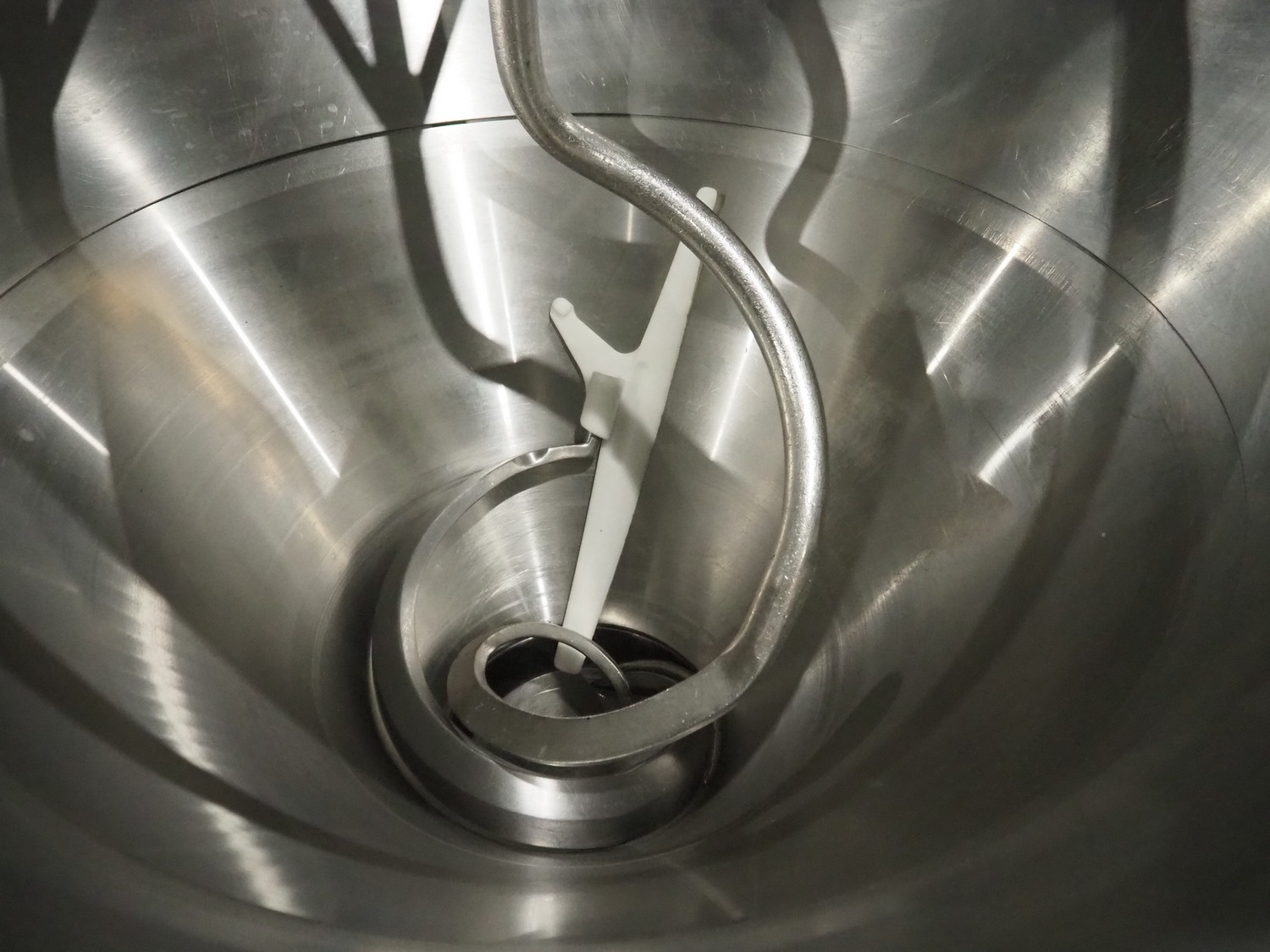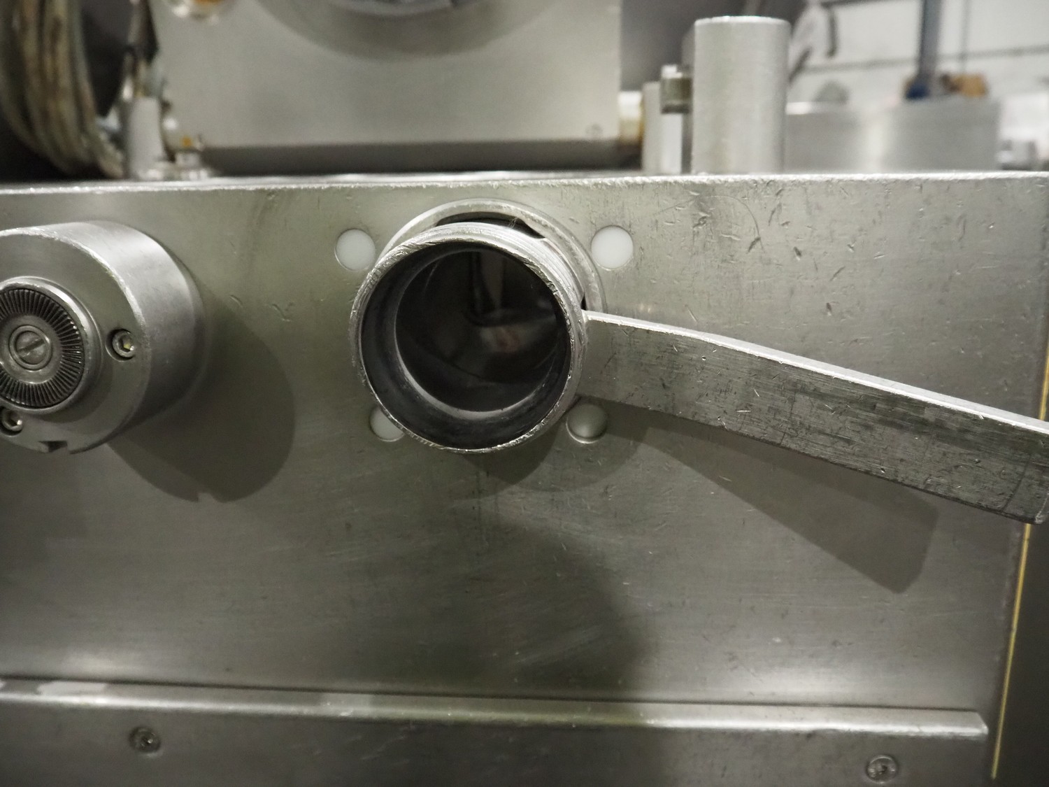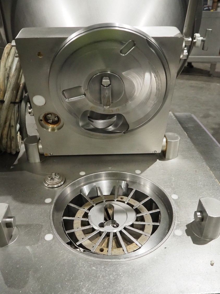 Handtmann vacuum filling machine with lifter for 200 liter meat bins, model: VF200B, number: 1002, 420 V, 50 Hz, 17.4 A, 7 kW, filling, portioning and linking, dimensions: 1600 mm x 1300 mm x 1100 mm.
