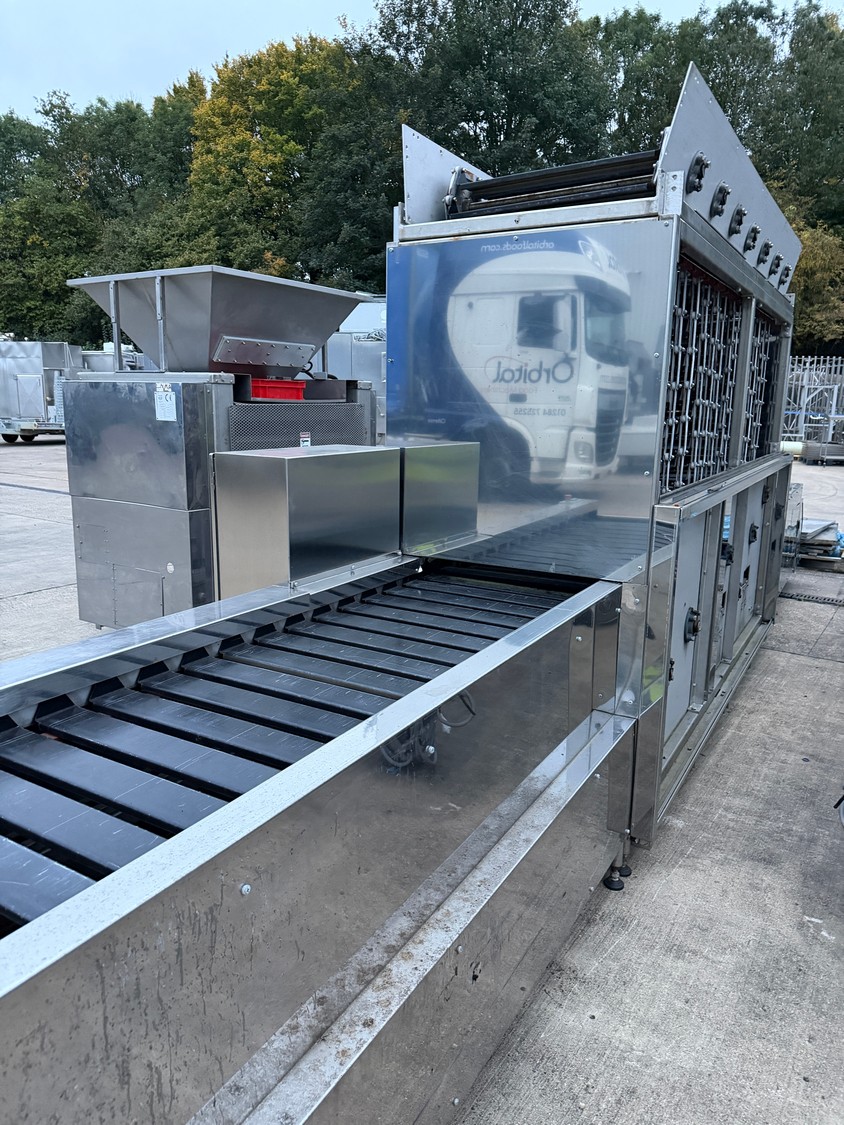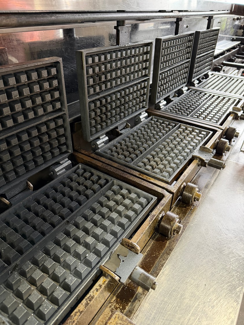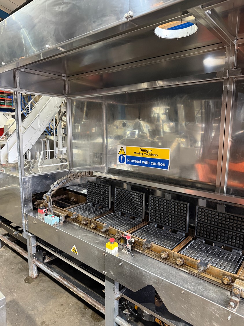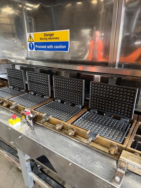 Complete semi-automatic waffle line equipped with dough divider, prover, oven, and cooling spiral.