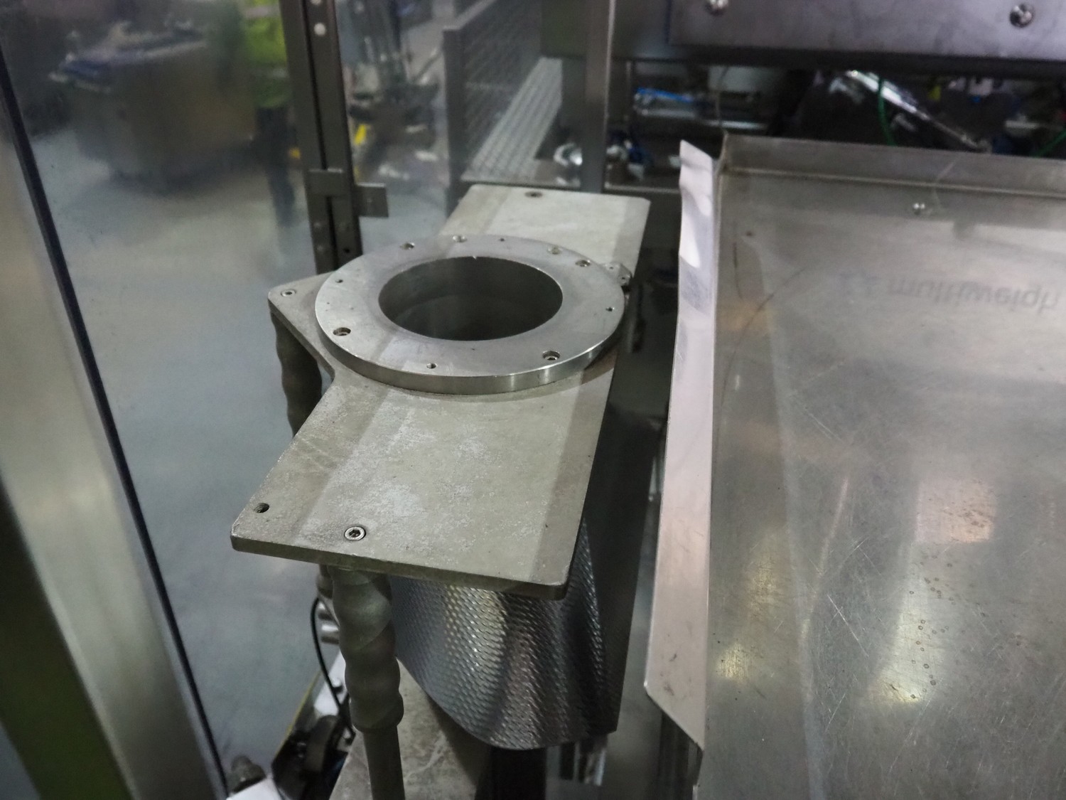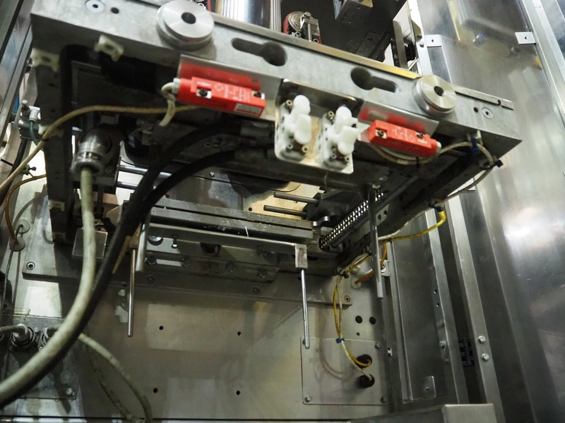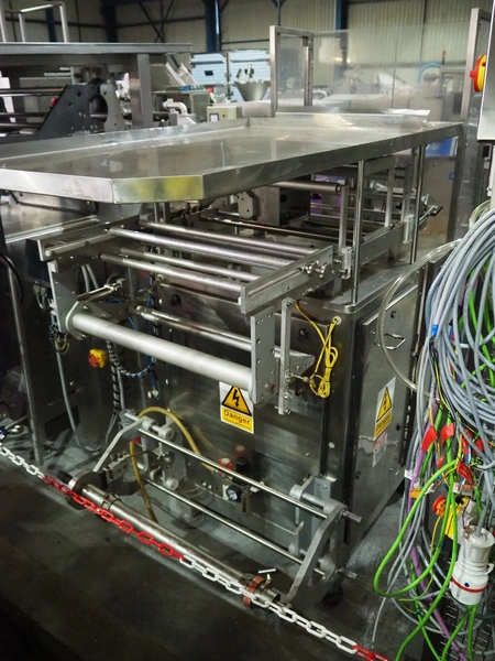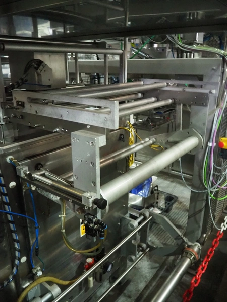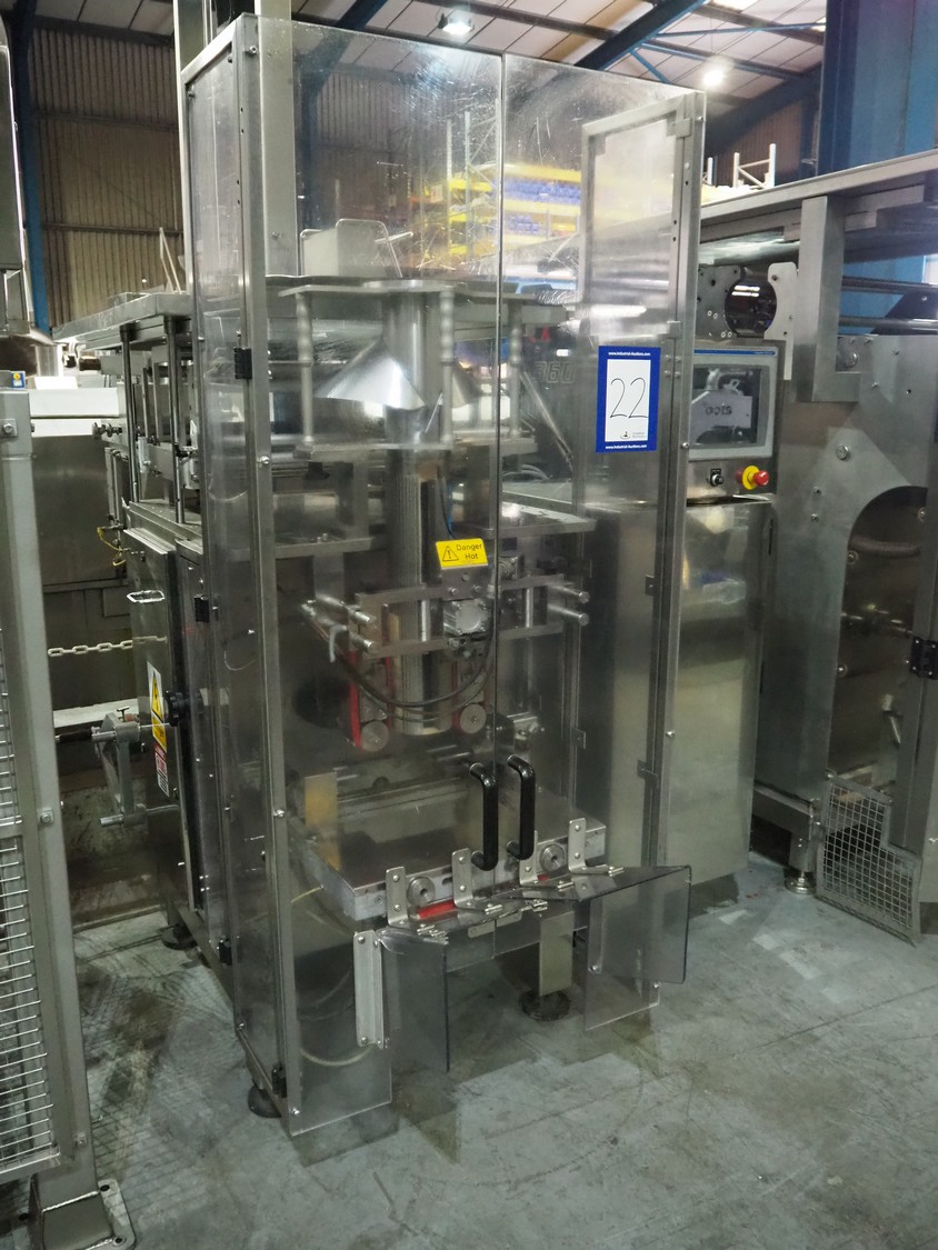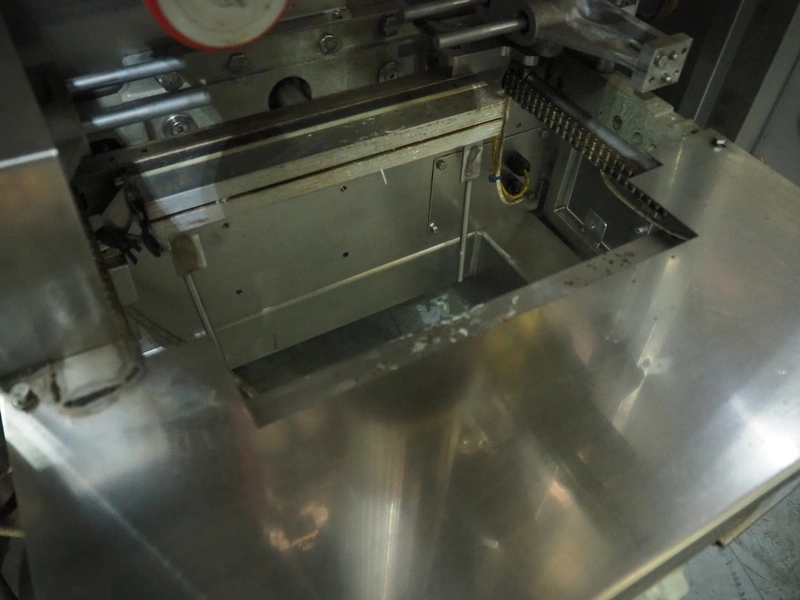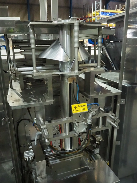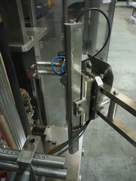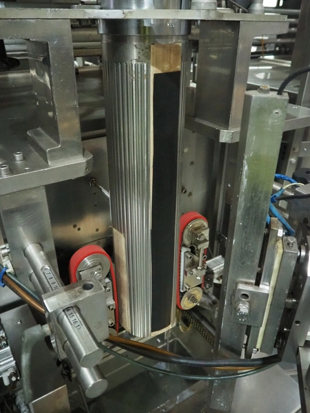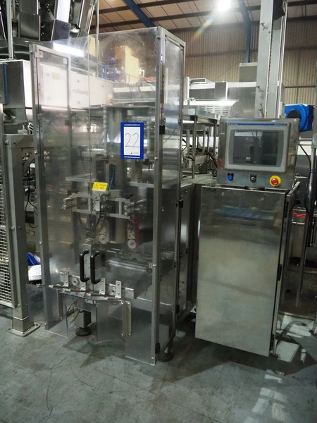 Vertical bag form-, fill-, and seal machine, pipe diameter: 125 mm, vertical seal length: 500 mm, horizontal seal length: 335 mm, total dimensions: 2300 mm x 1550 mm x 2100 mm.