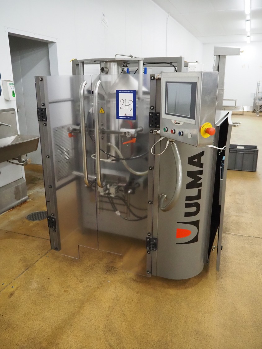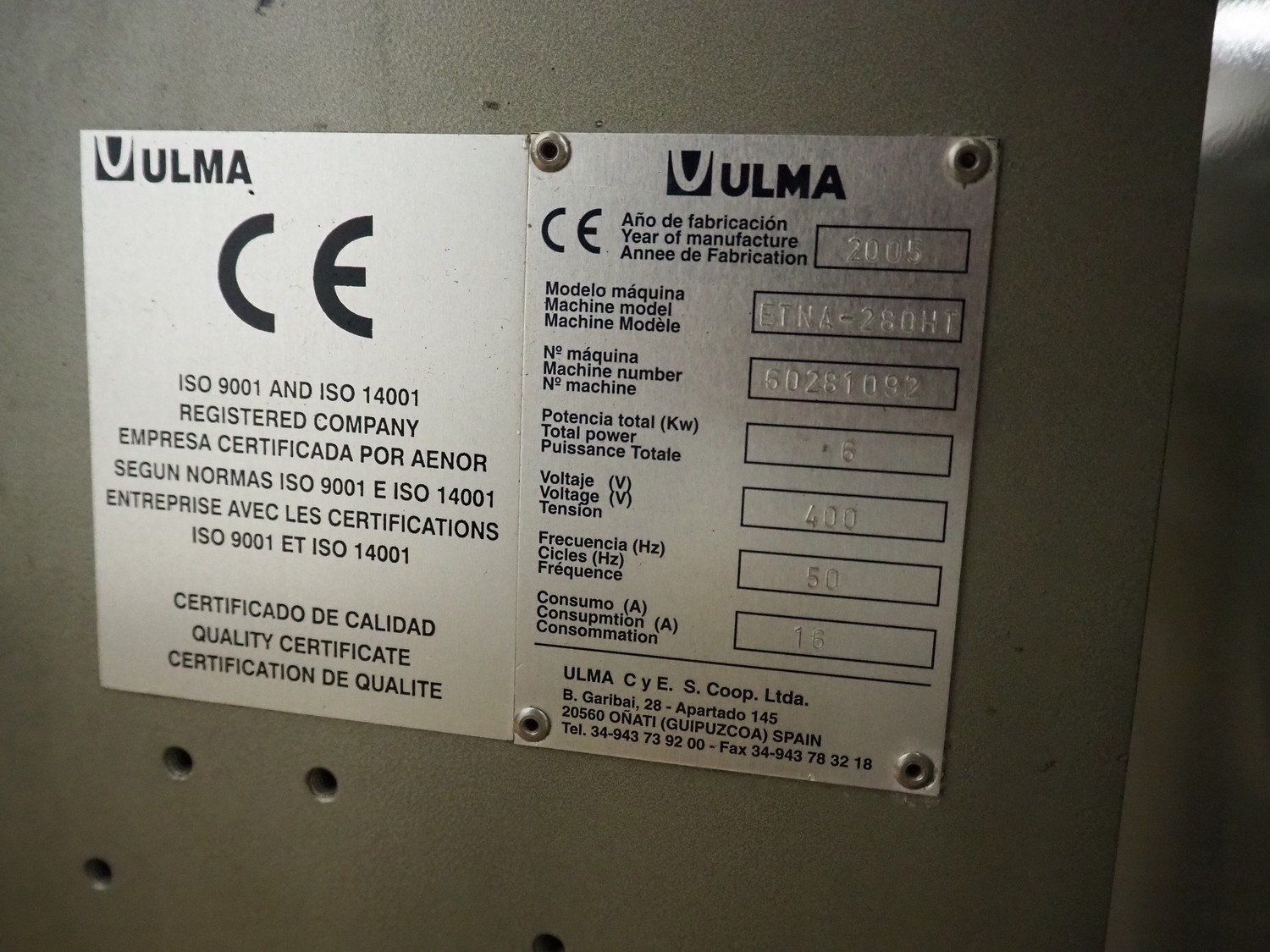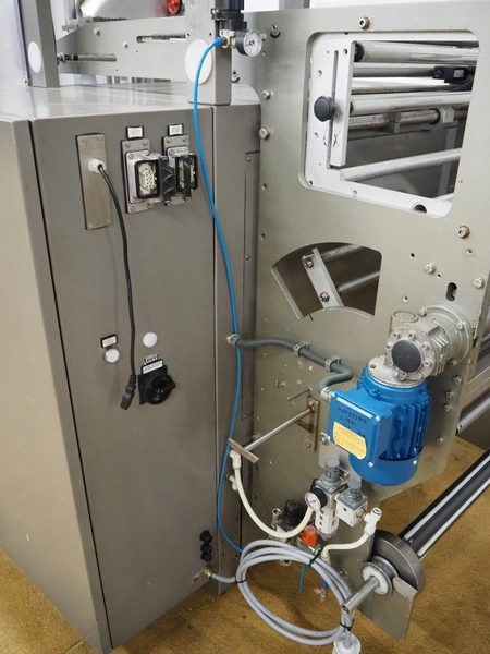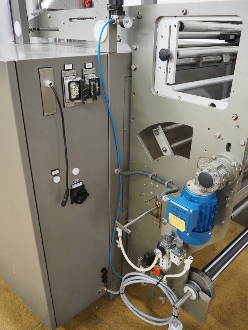 Ulma vertical bag form-, fill-, and seal machine, model: ETNA-280HT, serial number: 60281092, year of construction: 2005, 400 V, 50 Hz, 16 A, 6 kW, diameter pipe: 165 mm, vertical seal length: 400 mm, horizontal seal length: 300 mm, film width: 600 mm, total dimensions: 2220 mm x 1430 mm x 2120 mm.
