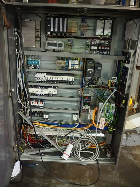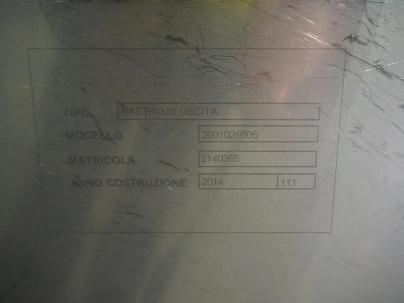 - Outfeed elevating belt, type: Nastro Di Uscita, model: 2601021605, serial number: 2140365, year of construction: 2014, plastic belt with dividers, belt width: 505 mm, distance between dividers: 345 mm, dividers height: 25 mm, elevating height: 900 mm, total dimensions: 2100 mm x 950 mm x 1000 mm.
