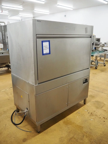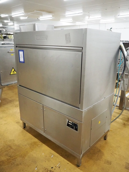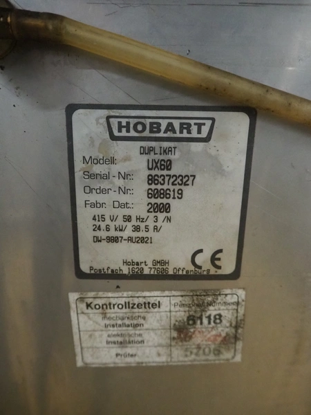 Hobart dish washer, model: UX60, serial number: 86372327, year of construction: 2000, 415 V, 3 Ph, 50 Hz, 38.5 A, 24.6 kW, inside dimensions: 1200 mm x 700 mm x 600 mm, total dimensions: 1380 mm x 830 mm x 1700 mm.