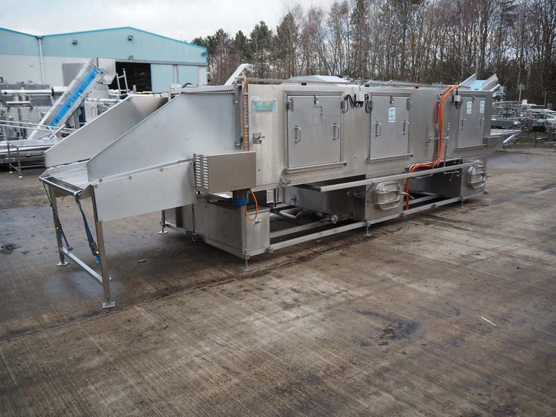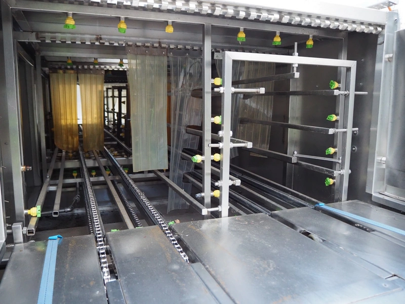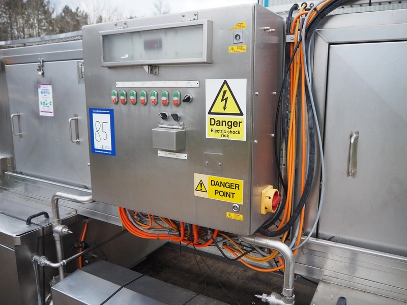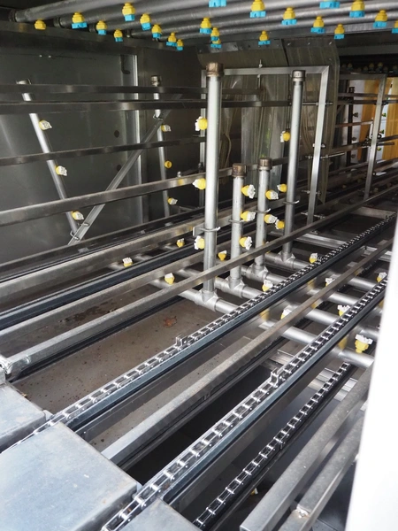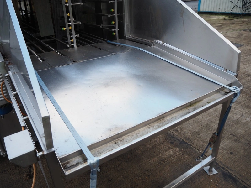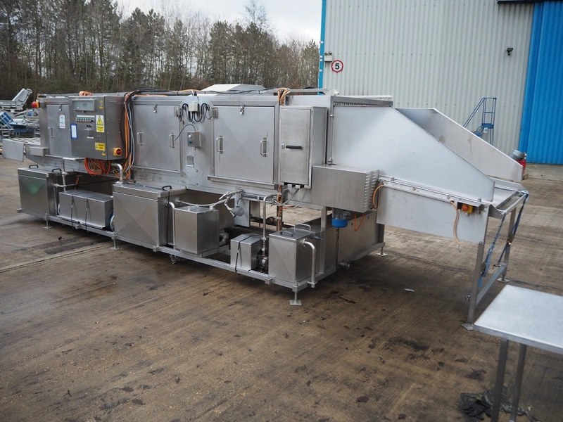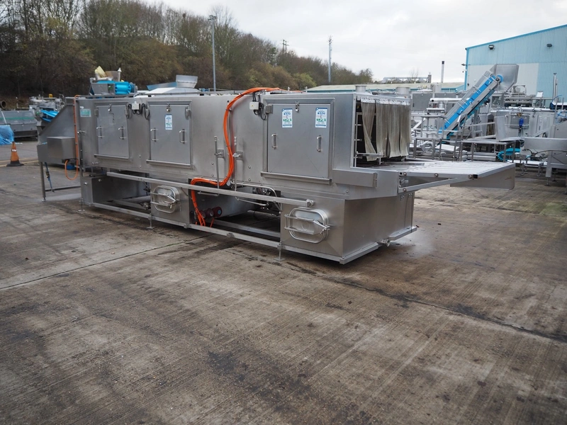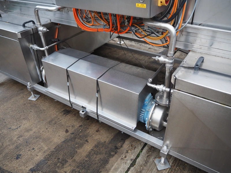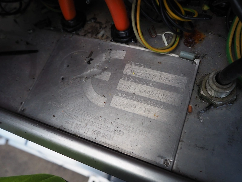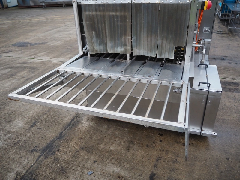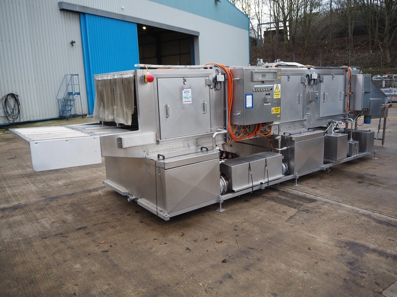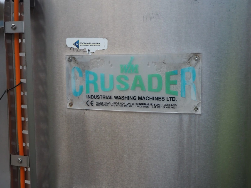 Industrial Washing Machines LTD. 2 lane washer for E2 crates, type: Crusader 1000SP, serial number: 208-C10SPA/296/01X, year of construction: 24/09/99, clearance: (1x) 390 mm x 450 mm, (1x) 490 mm x 640 mm, total dimensions: 7700 mm x 2050 mm x 1930 mm. Incomplete.