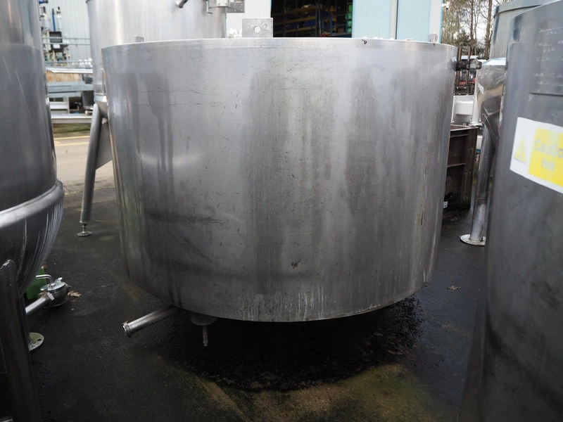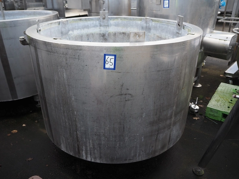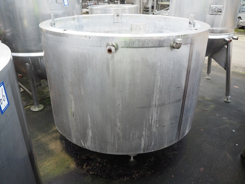 S/s double jacketed tank used for broth, year of construction: 15.10.07, inside dimensions: Ø 1400 mm x 850 mm, total dimensions: Ø 1570 mm x 1400 mm.