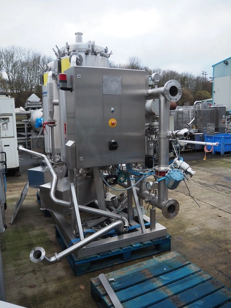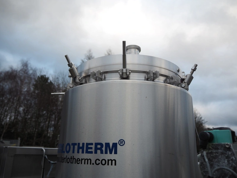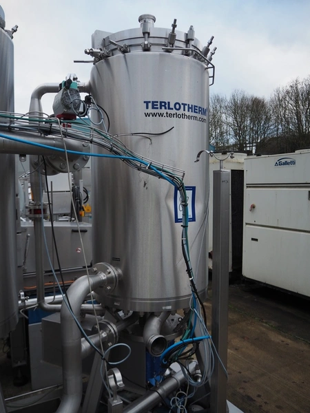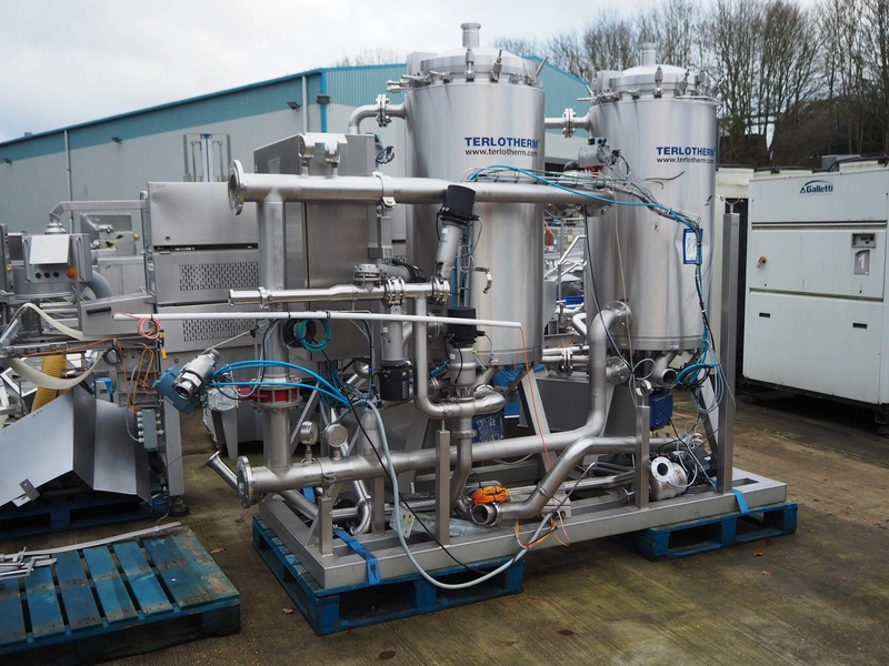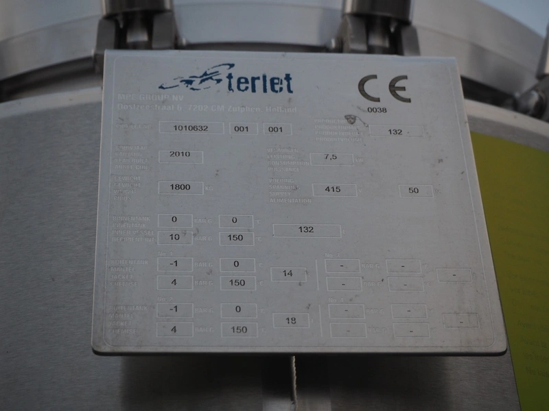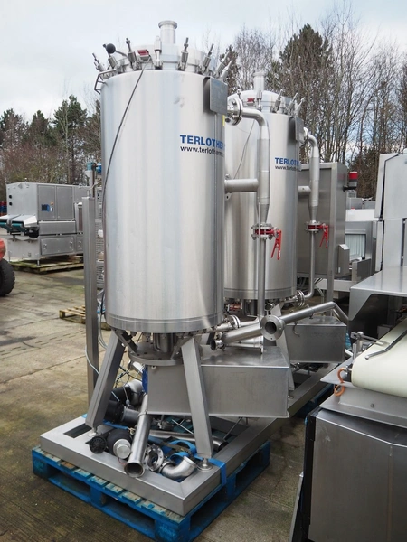 Terlet skid with 2 double jacketed tanks, year of construction: 2010, 415 V, 50 Hz, 7.5 kW, weight: (2x) 1800 kg, volume: (2x) 132 liter, total dimensions: 3500 mm x 1250 mm x 2550 mm. Tank is damaged.